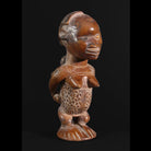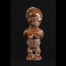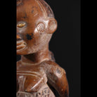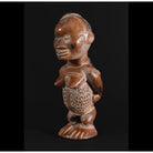 • The Classic Bembe figure usually is upright with knees slightly bent, its large feet with carefully articulated toes standing on the base; the seated position occurs less frequently. Female Statuettes have a pronounced, almost oval or square shape, triangular chin, a full nose and mouth, finely sculpted ears, and hair carved in relief on or above the forehead. The hands of male sculptures’ are typically turned toward one another and are carrying implements that represent the ancestor's profession in life