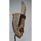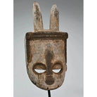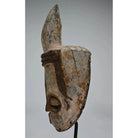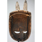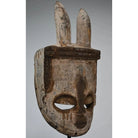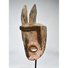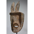 • A carved wooden mask with animal like horns, classic diminutive facial features as well as a kaolin clay painted surface and signs of field use and wear.