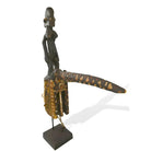 • A tall carved wooden Dance mask representing the sacred Hornbill bird with female ancestor image on top and various painted designs, woven grass rope for attachment. Known locally as a (Dyodyomini), Dogon peoples, Mali, Africa. Likely an Early 20th century example.