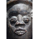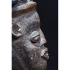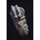 - An Igbo mask with an elaborate coiffure, big eyes, a short nose with wide nostrils, animal-like ears, the mouth slightly open and showing the typical inclined teeth; a dark black and brown patina with remains of white pigments.