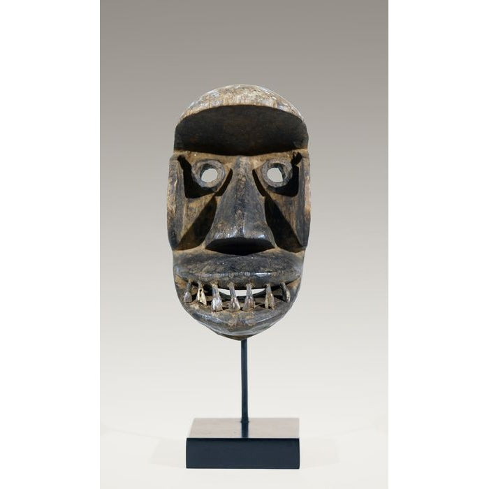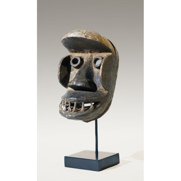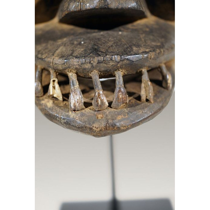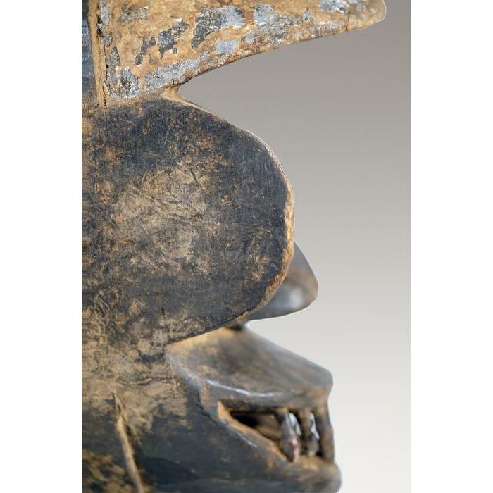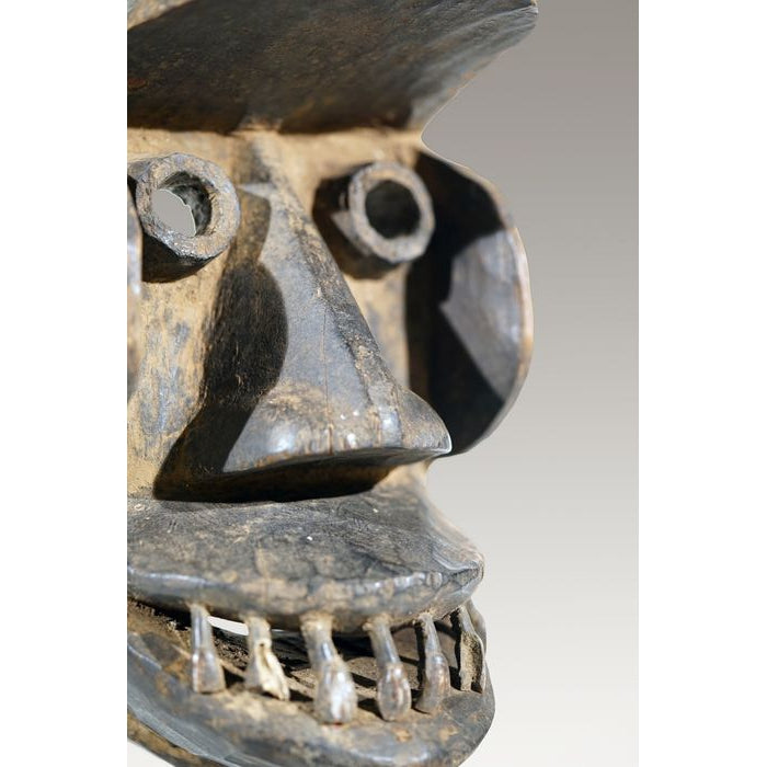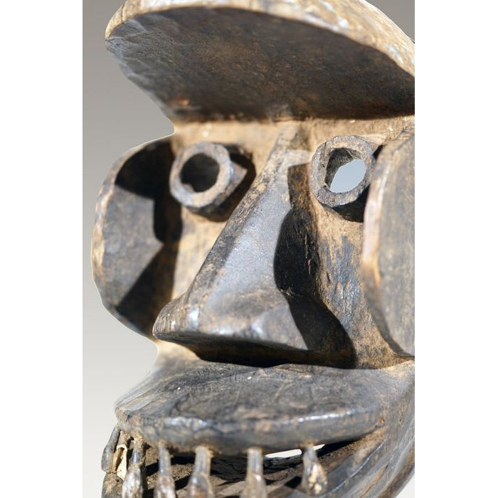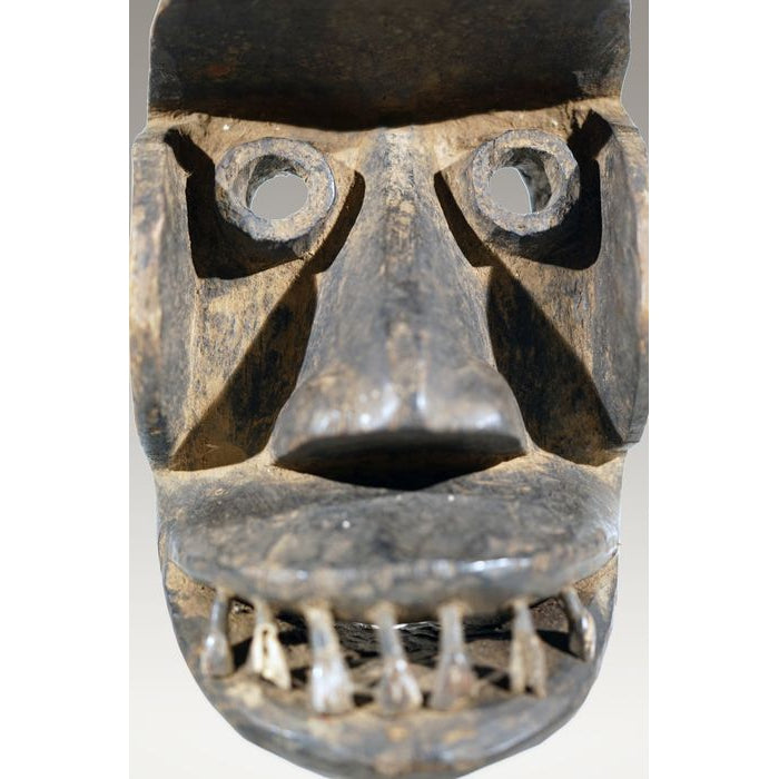 • A Kran Monkey Mask, ,Côte d'Ivoire / Liberia, with the teeth of a bush-cow or a horse; remnants of scarification patterns are still visible on some portions of the Mask. “Dan Kran People inhabit the southern part of the Dan Territory and have powerful carved Masks with geometric triangular features.”