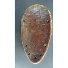 • Usually, these Miniature Masks, known under the name of Lukwakongo, have a heart-shaped face, framed by a line formed by the nose, the eyebrows, and the cheeks. The face is whitened with Kaolin Clay, whereas the forehead and the borders have a typical brown patina. The holes all along the lower border of this African mask originally held a beard made of liana fibers.