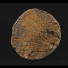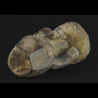 - It is distinctive for its delicately pigmented surface, the interplay of concave, convex and flat planes, and its strong three-dimensionality. The focal point of the composition is the head which is defined by an alternation of convex and concave passages and accentuated with white pigment. The eyes and mouth are articulated as narrow slits on slightly raised surfaces and the nose protrudes as a triangle, its underside marked with two small holes for the nostrils. These facial features are inscribed within a concave heart-shape, whose upper ridge defines the eyebrows and marks the transition between the white concave surface of the face and the convex area of the prominent forehead covered in yellow pigment. At the summit of the head is a crescent-shaped coiffure. On either side of the face, aligned with the eyes, are semicircular ears that project perpendicular to the head. The jaw’s straight lines contrast with the fullness of the head. The neck tappers down from the bottom of the ears towards the slopping forward-projecting shoulders. The overextended arms seem to dangle down, framing the long and slim torso. The figure's trunk is marked vertically by a central yellow band that contrasts with its otherwise darker tint. The elbows are the only defined features of the largely tubular arms, and they extend slightly outward. The yellow-colored hands rest on top of the thighs, framing the figure’s genitals. The legs are spread apart about the width of the torso, all the way down to the feet that are angled downwards. In contrast to the figure’s strong verticality is the arrangement of its features in successive horizontal lines, from the head to the feet: the ears and eyes, the elbows and belly-button; the hands and genitals; and the strut that connects the feet. The figure’s strong three-dimensionality becomes apparent in profile. Its back is rounded, giving it a defined hunched position; the arms dangle away from the flat plane of the torso, and the legs are bent. The downward slope of the figure’s forehead is echoed in the bend of the forward-projecting shoulders, and in the angled knees. Hands, fingers, legs, and feet all hang as if unsupported. The body is repeatedly perforated side to side: through the back at the shoulder blade level and above the waist; through each foot at the heel; vertically through the back of the head; through the top center of the coiffure; and at the base of the neck.