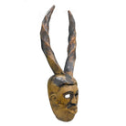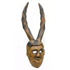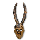 • A carved wooden mask with classic facial features and tall spiral antelope style horns, weathered surface. Ogoni People, Nigeria.
