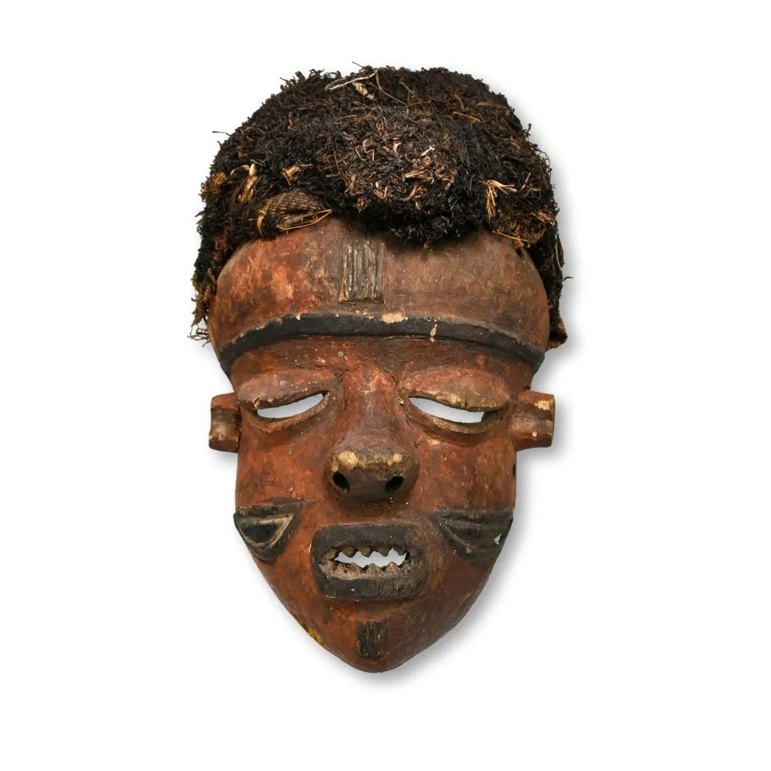 • A very old carved wooden dance mask accented with red mineral pigment and a woven grass coiffure. Mbuya village masks are used to entertain a community during non-ritual festivities. Once used during mukanda initiation ceremonies to mark the end of male circumcision rituals, mbuya masquerades are now used to highlight a number of characters and roles in Pende society.