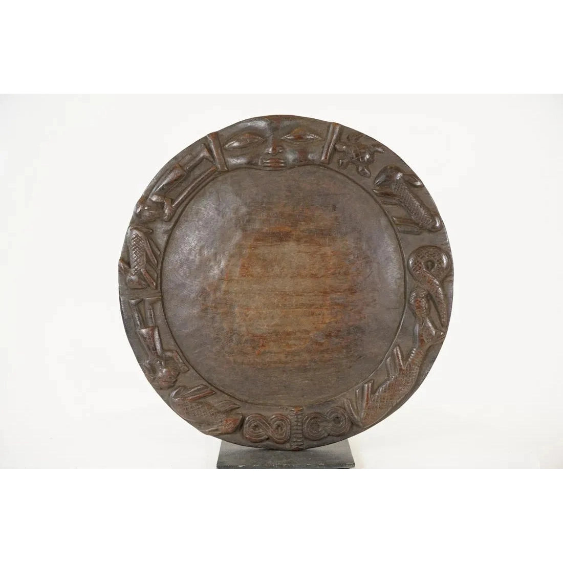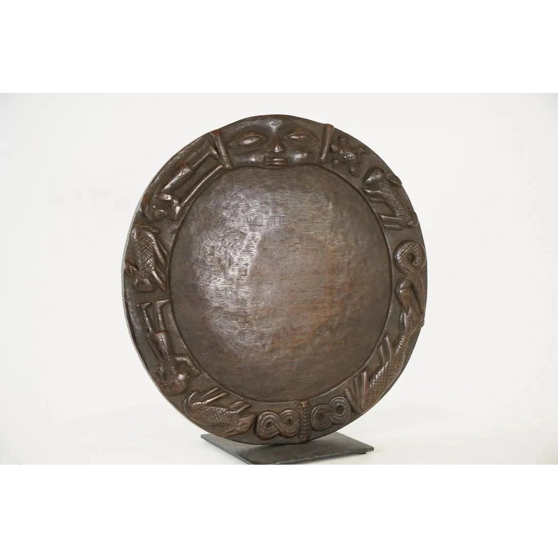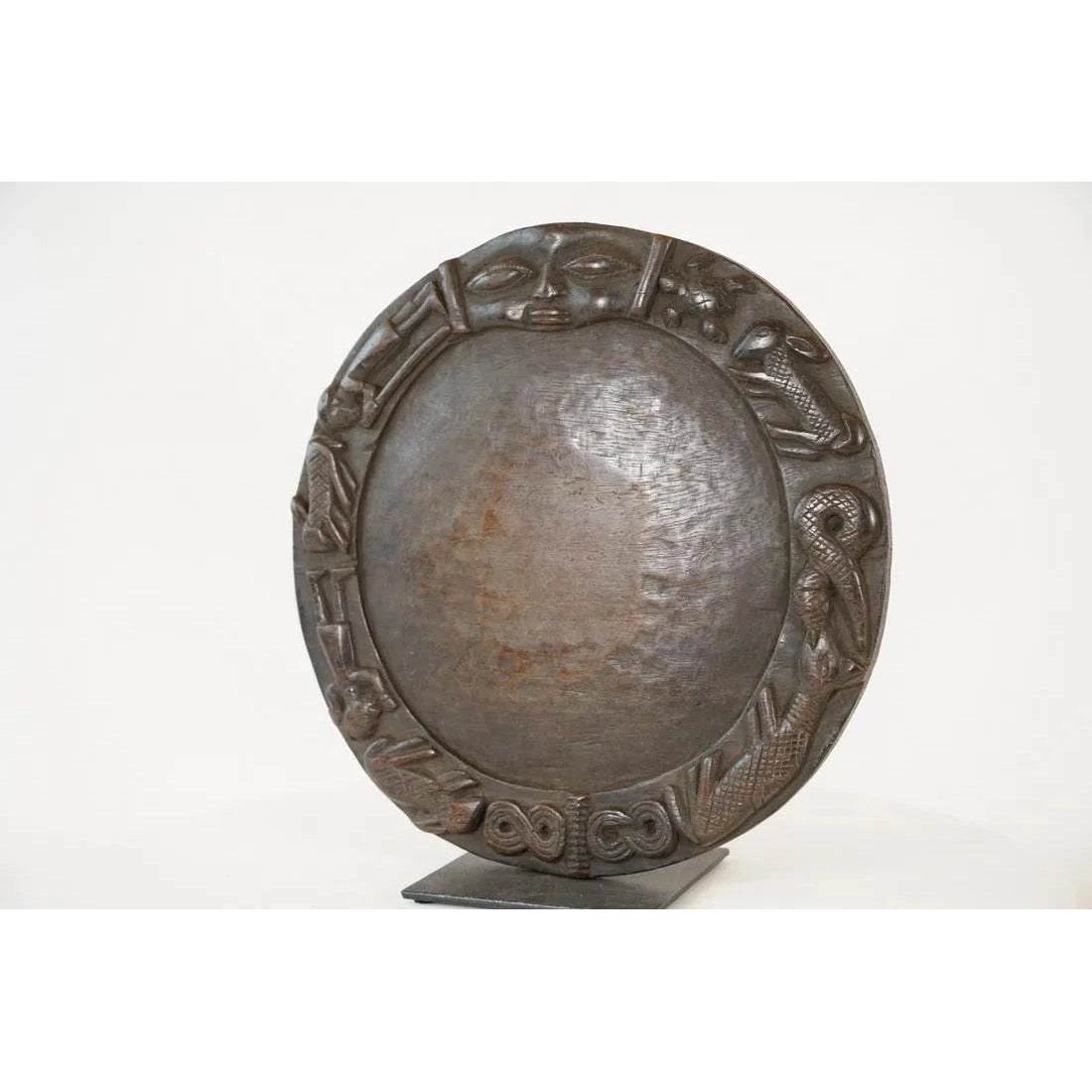 • A beautiful divination tray featuring a human face and figure and multiple animals on the exterior edge.