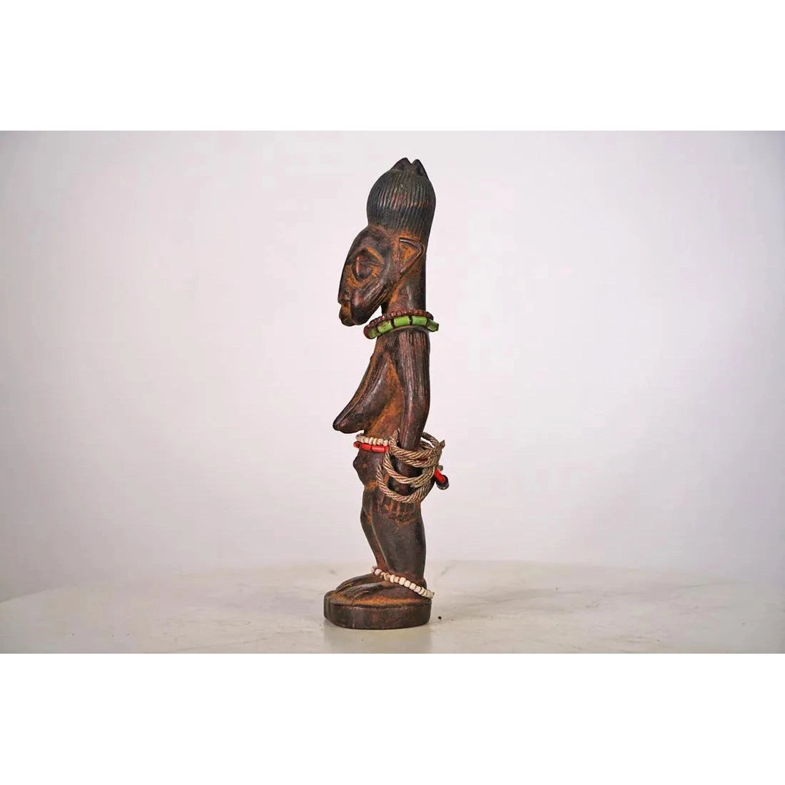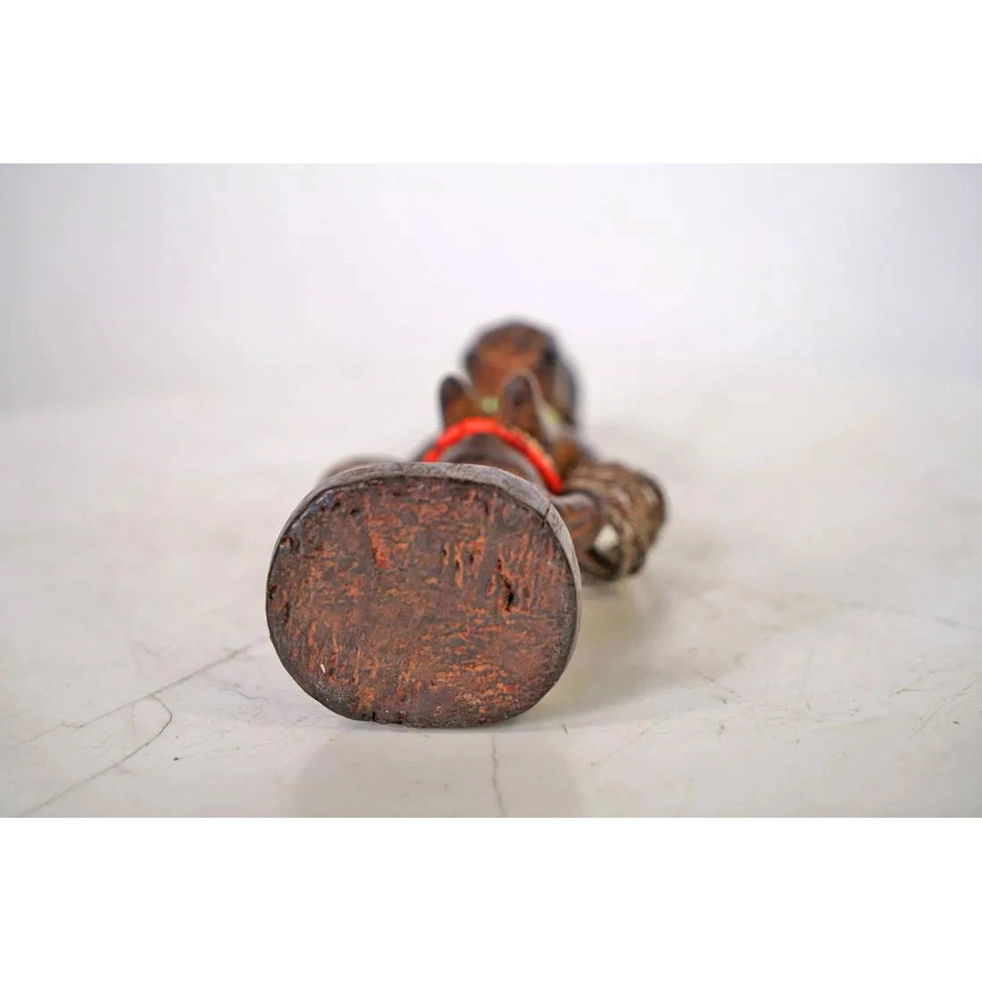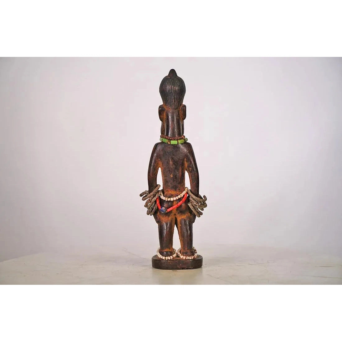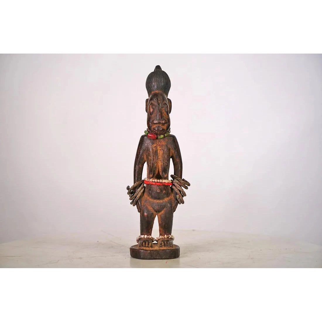 • A standing female Ibeji figure adorned with beaded necklaces and metal rings.