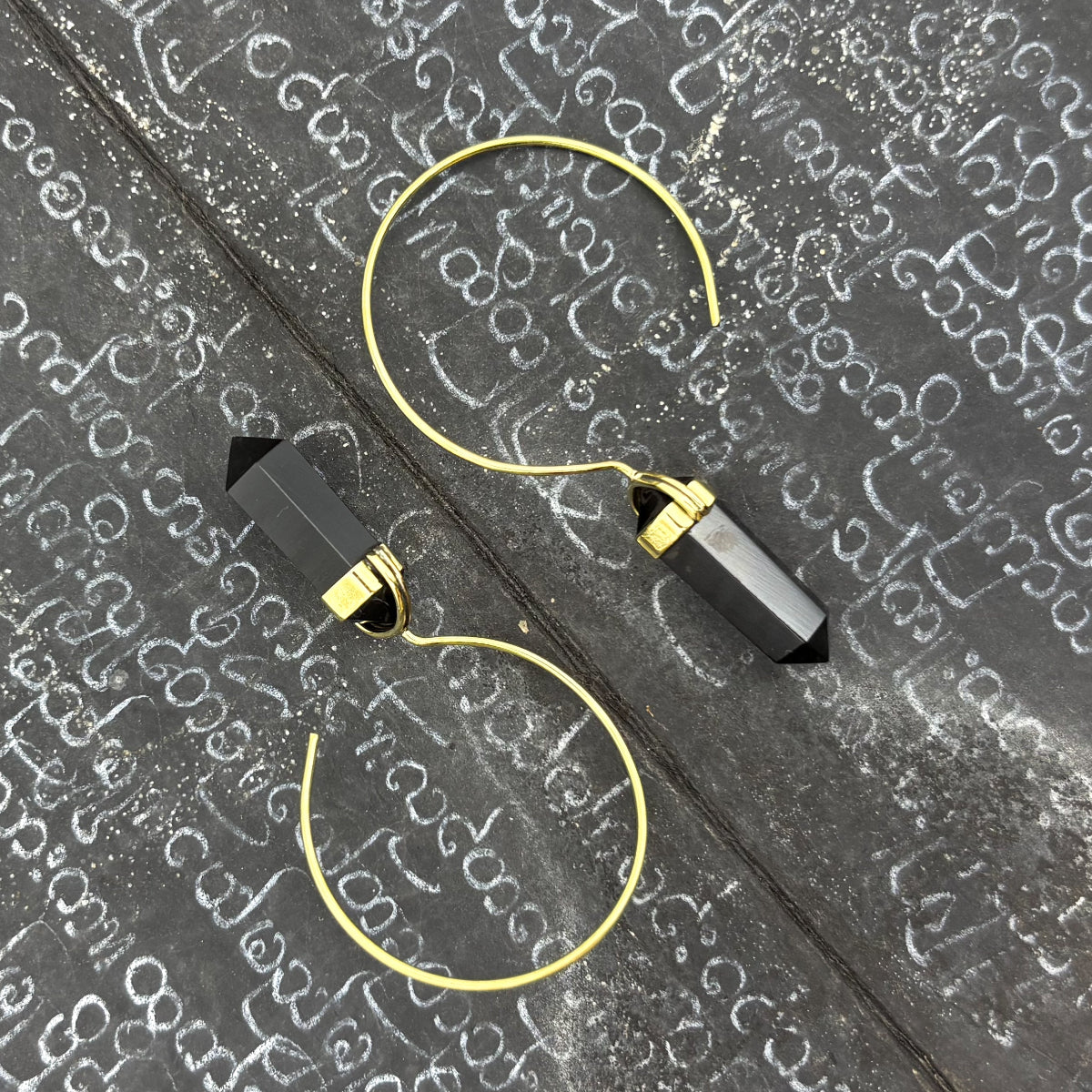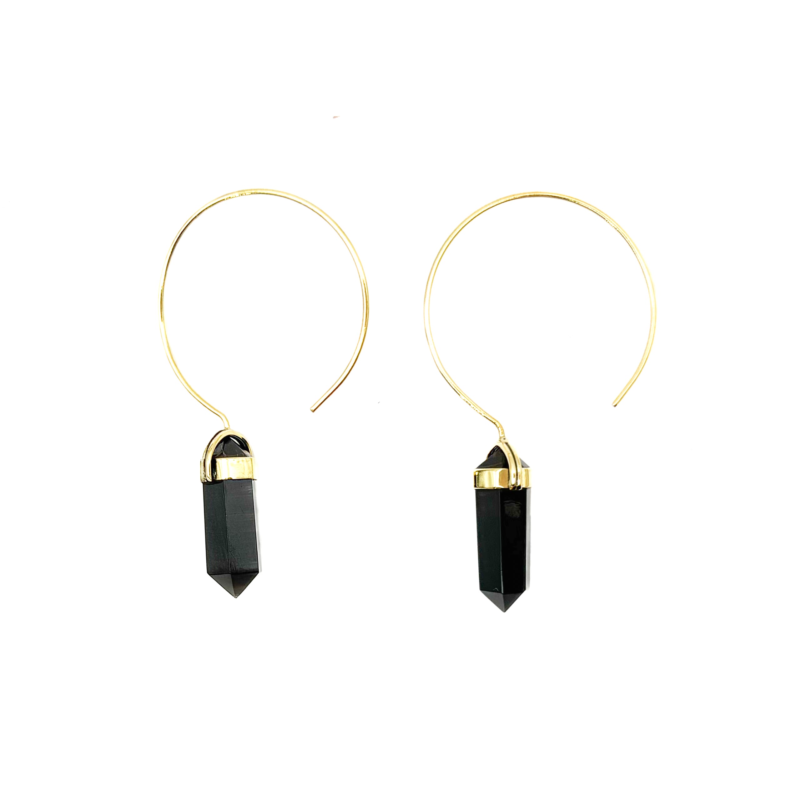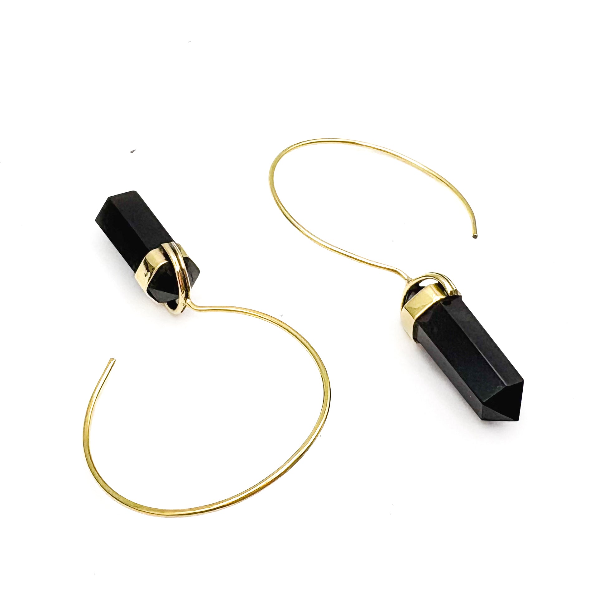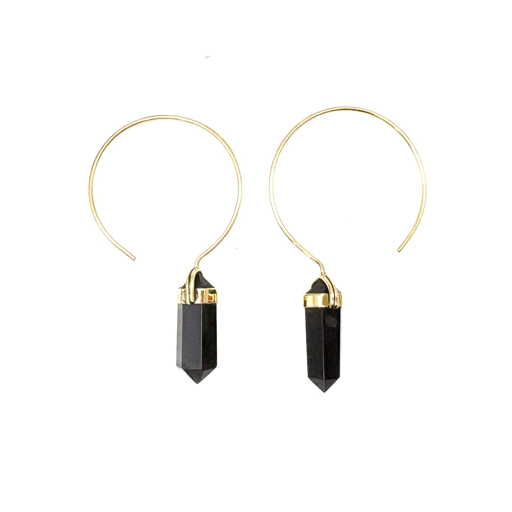 Black Tourmaline Crystal Point Brass Hoop Earrings