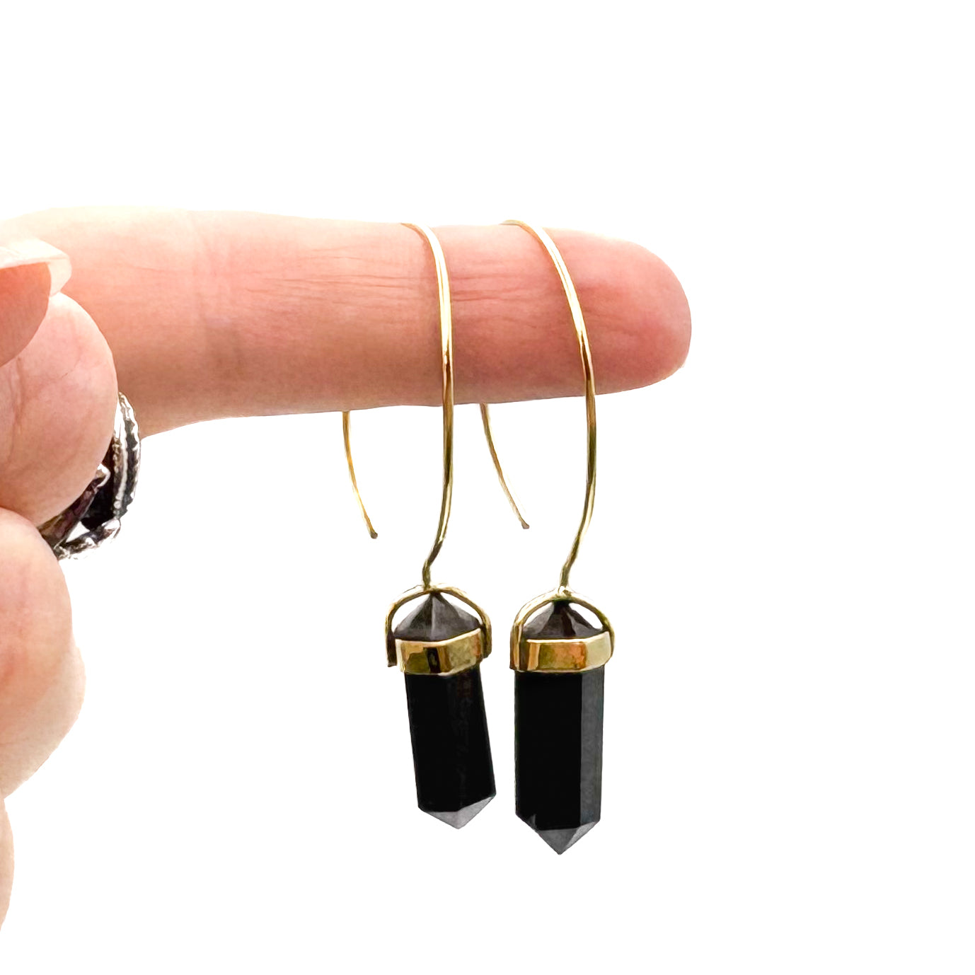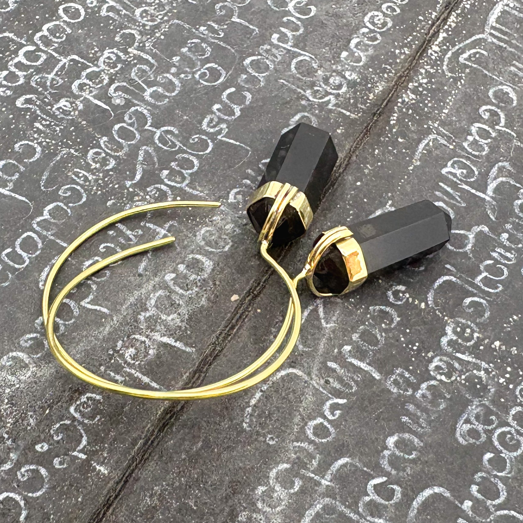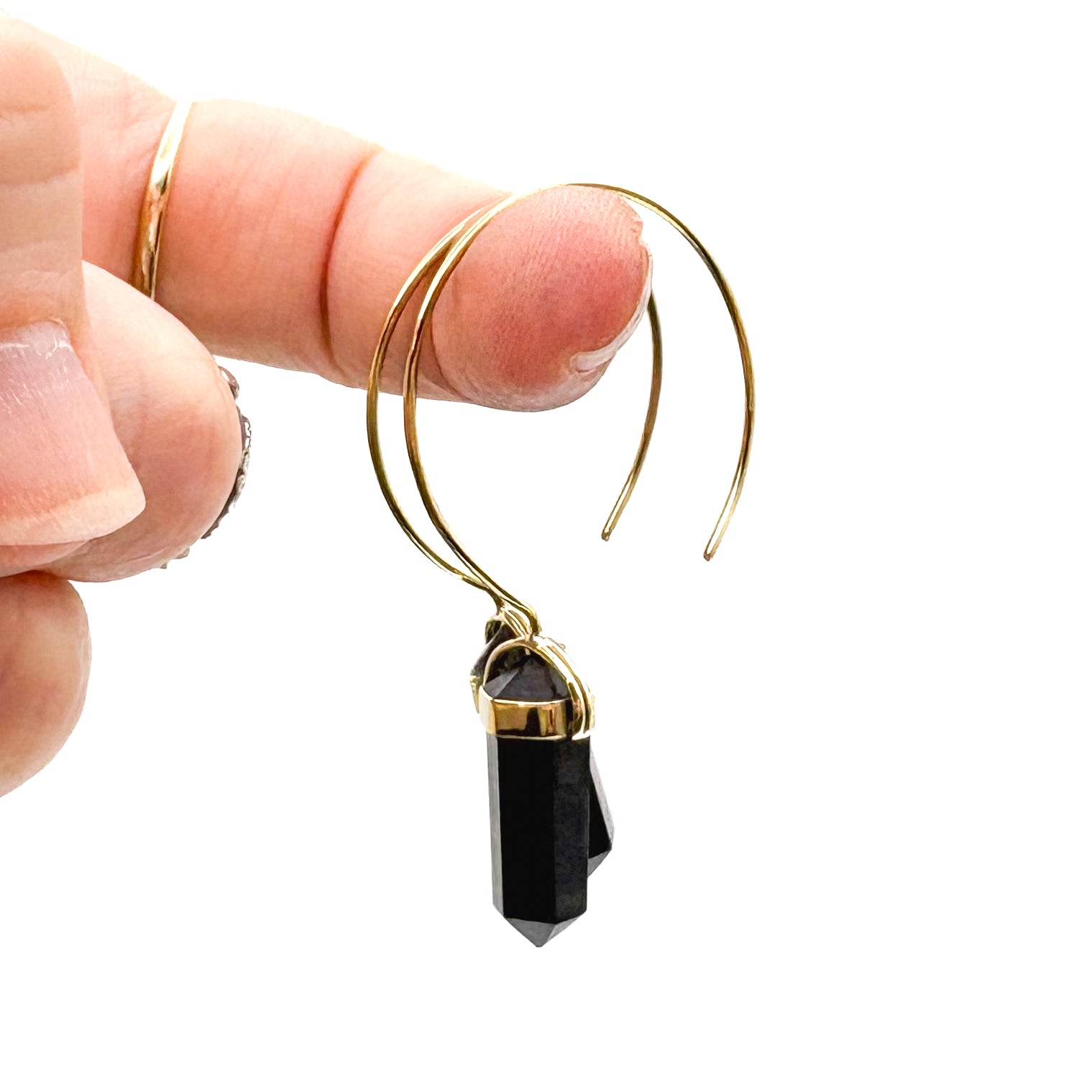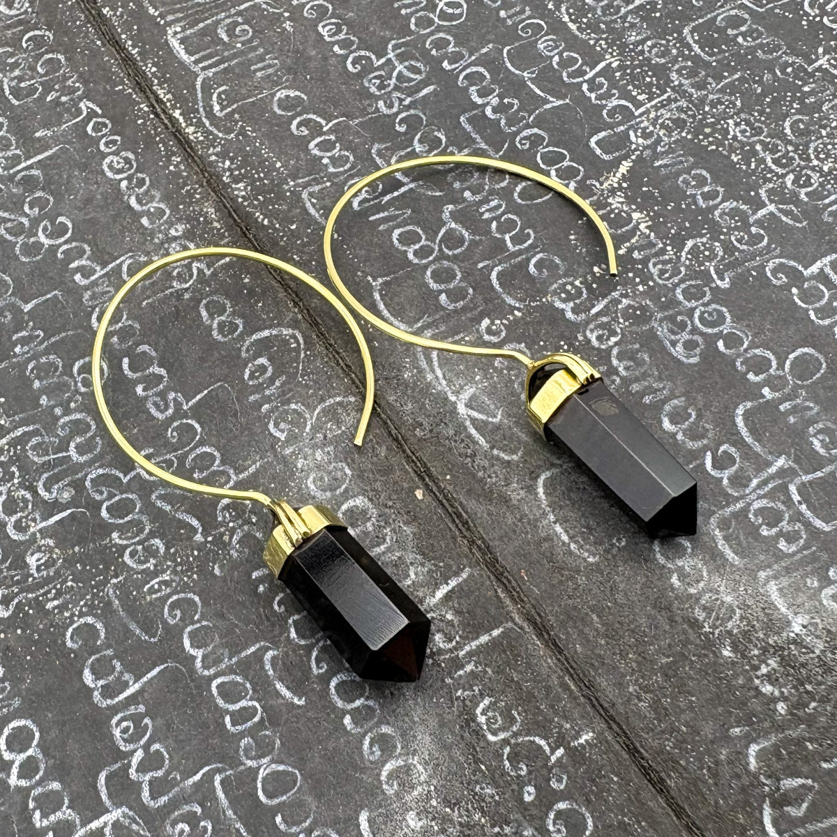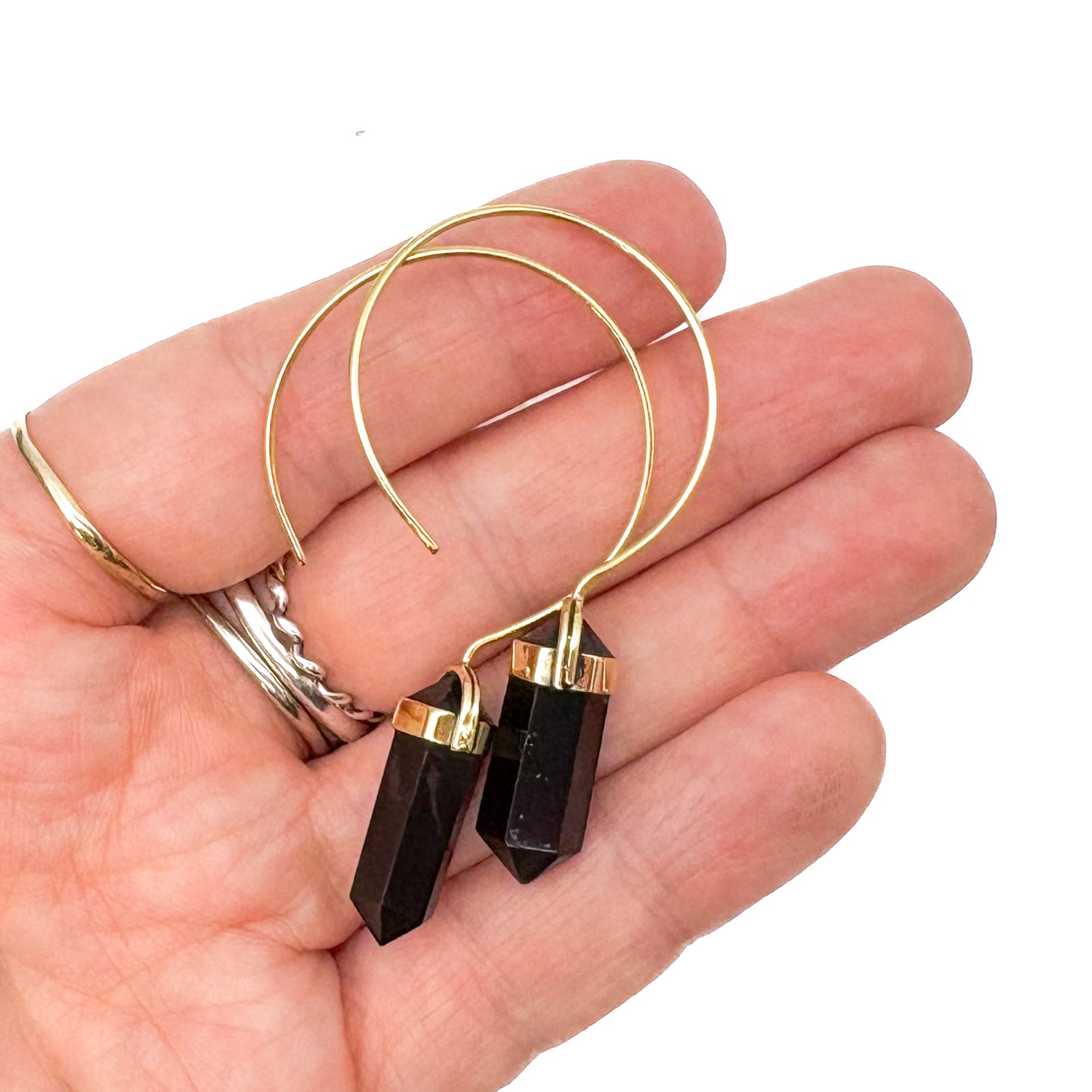 Black Tourmaline Crystal Point Brass Hoop Earrings