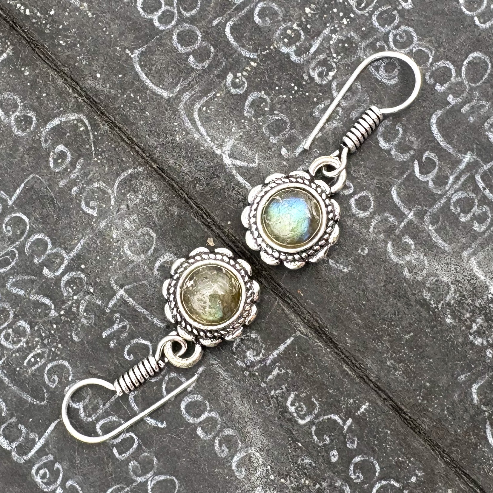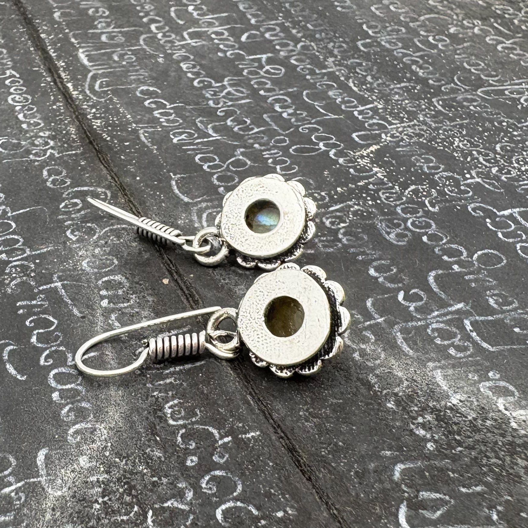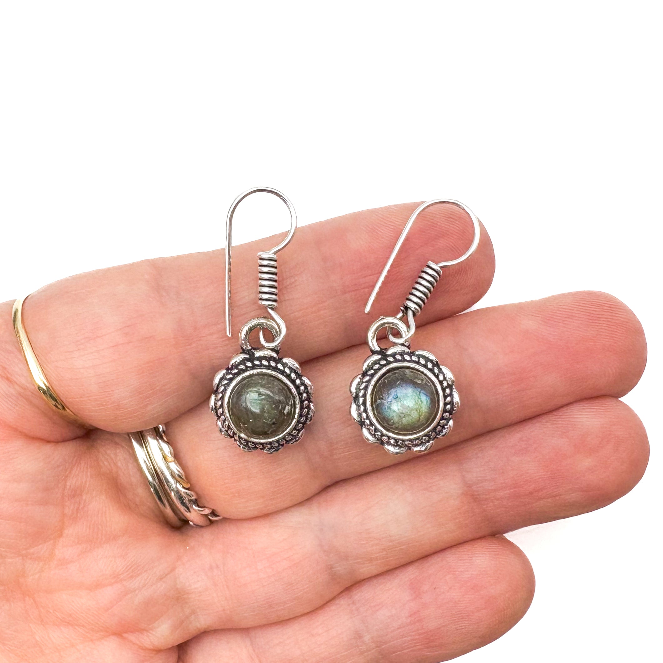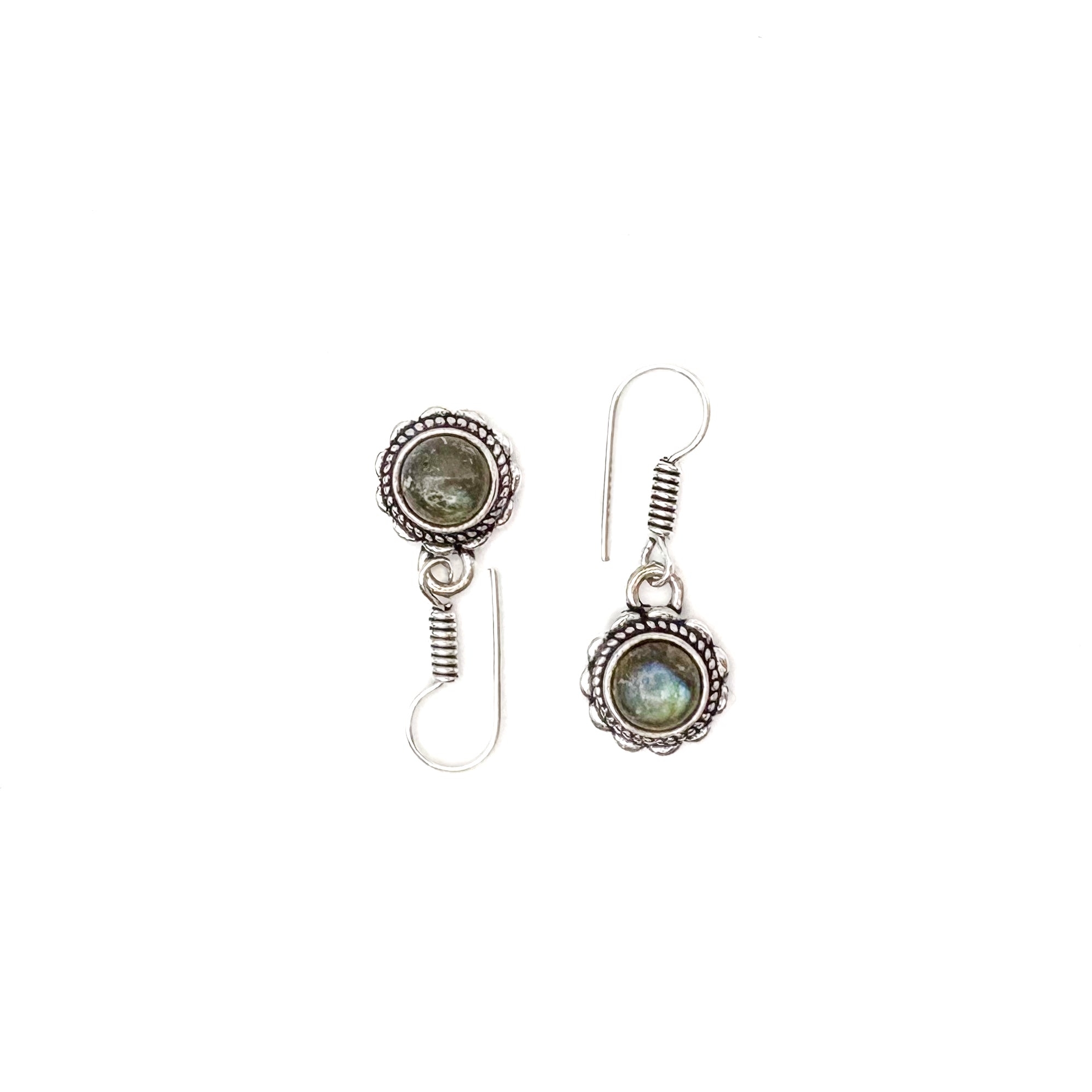 Labradorite Circle Flower White Brass Earrings