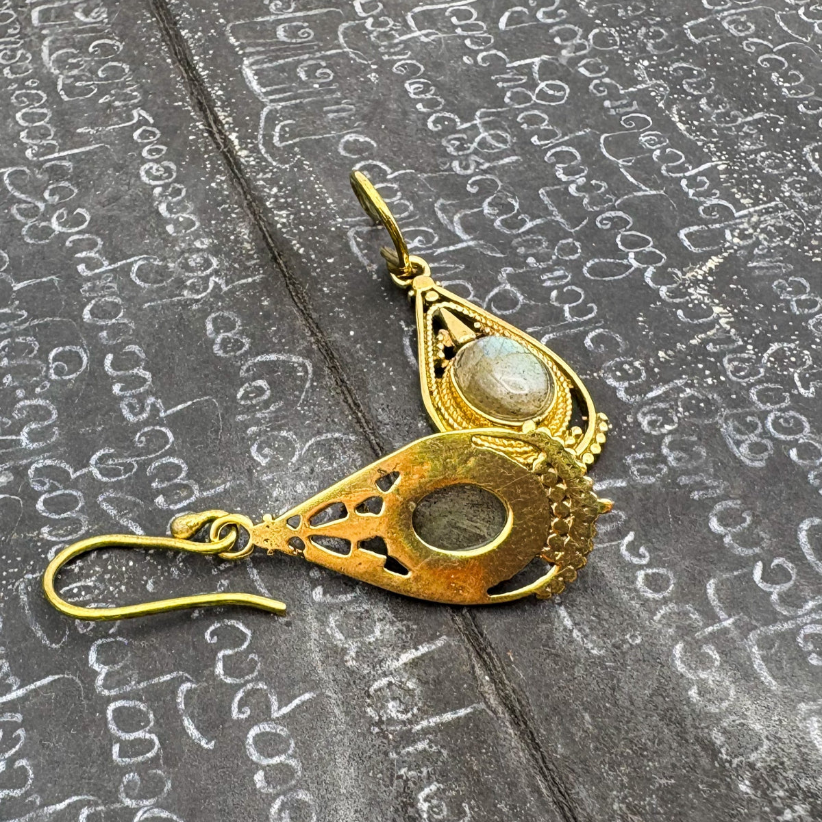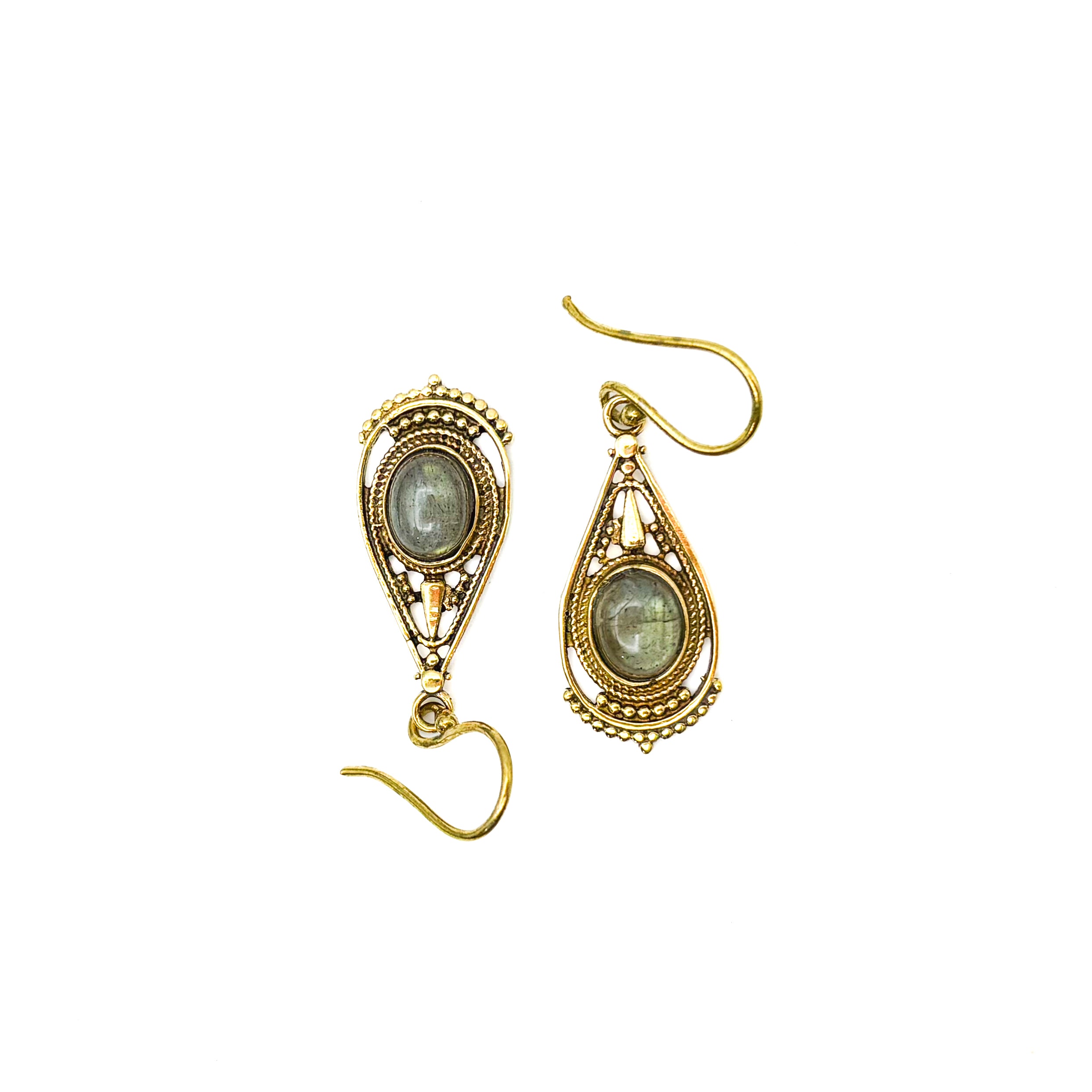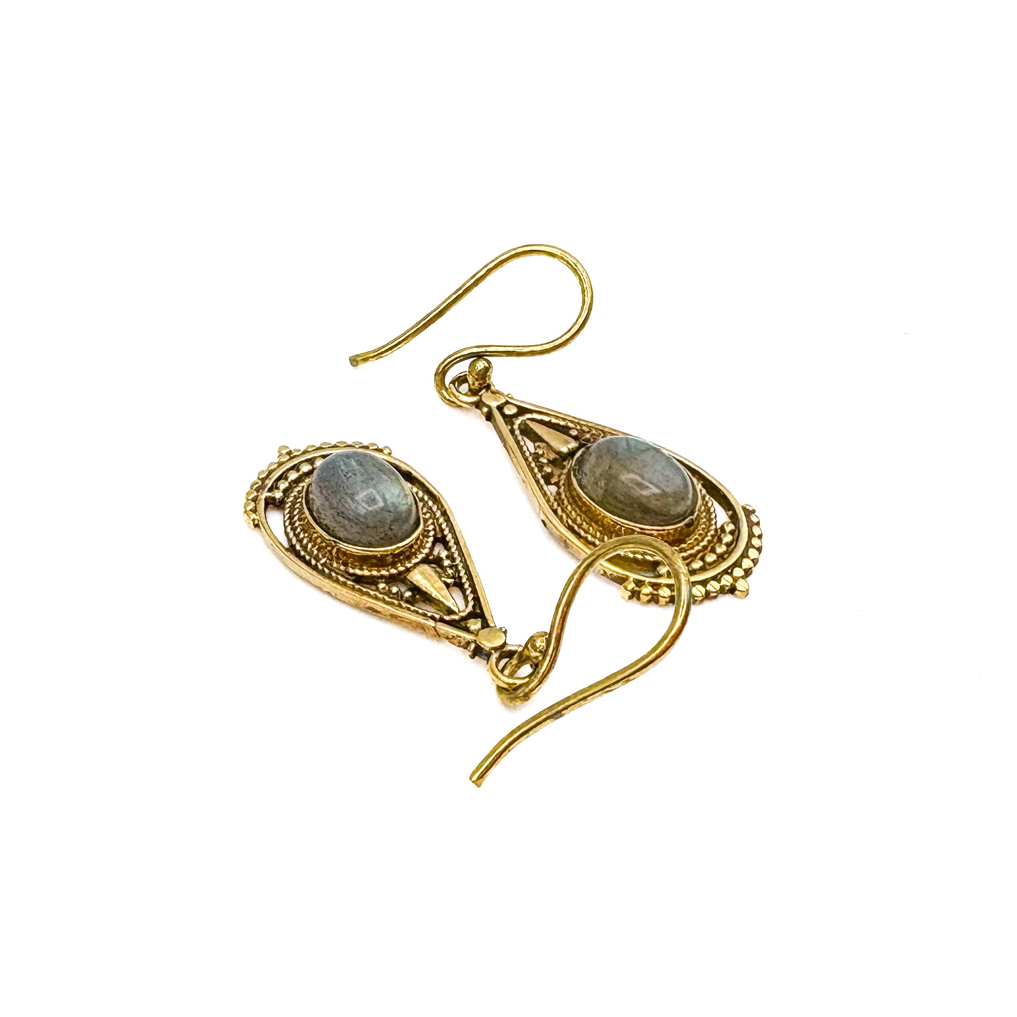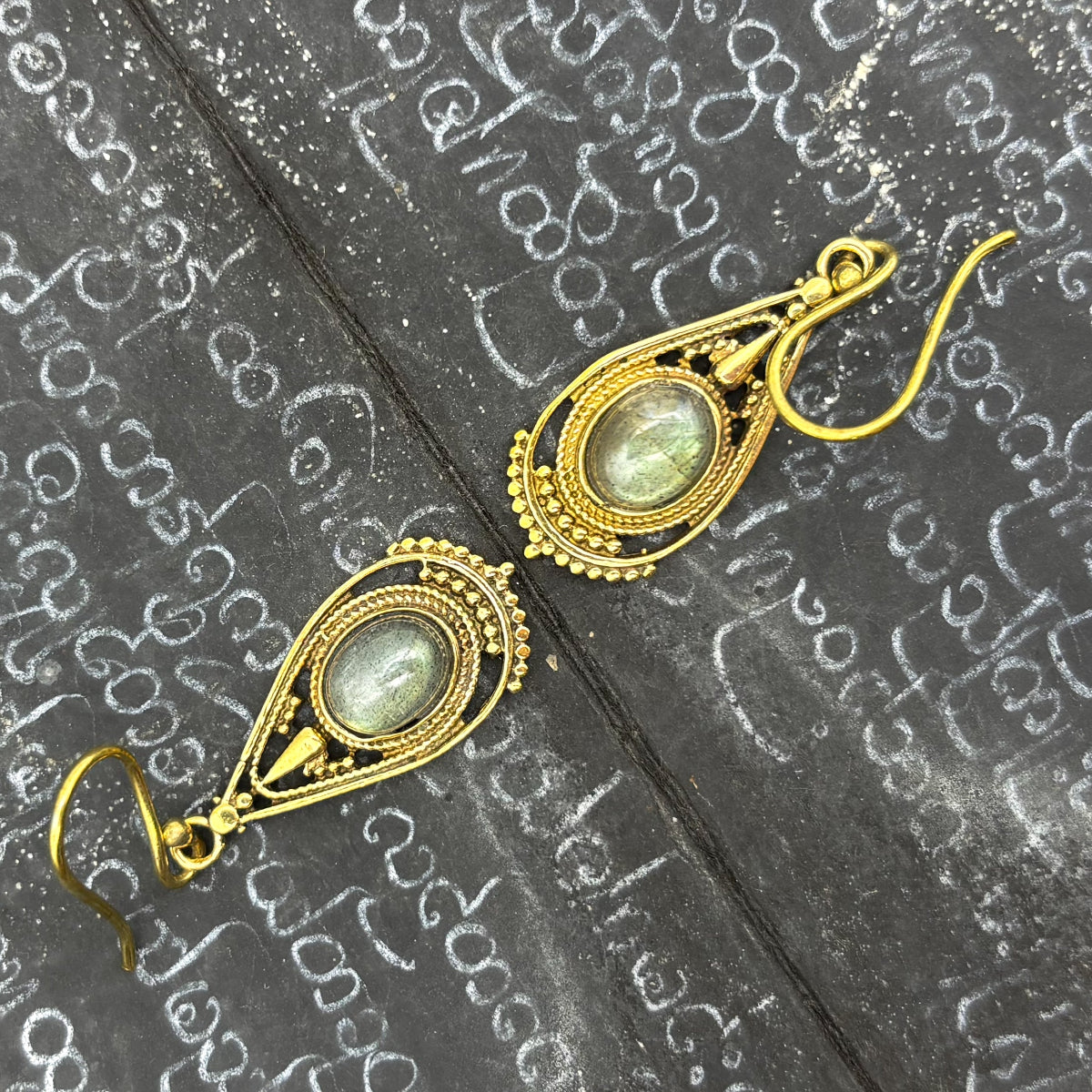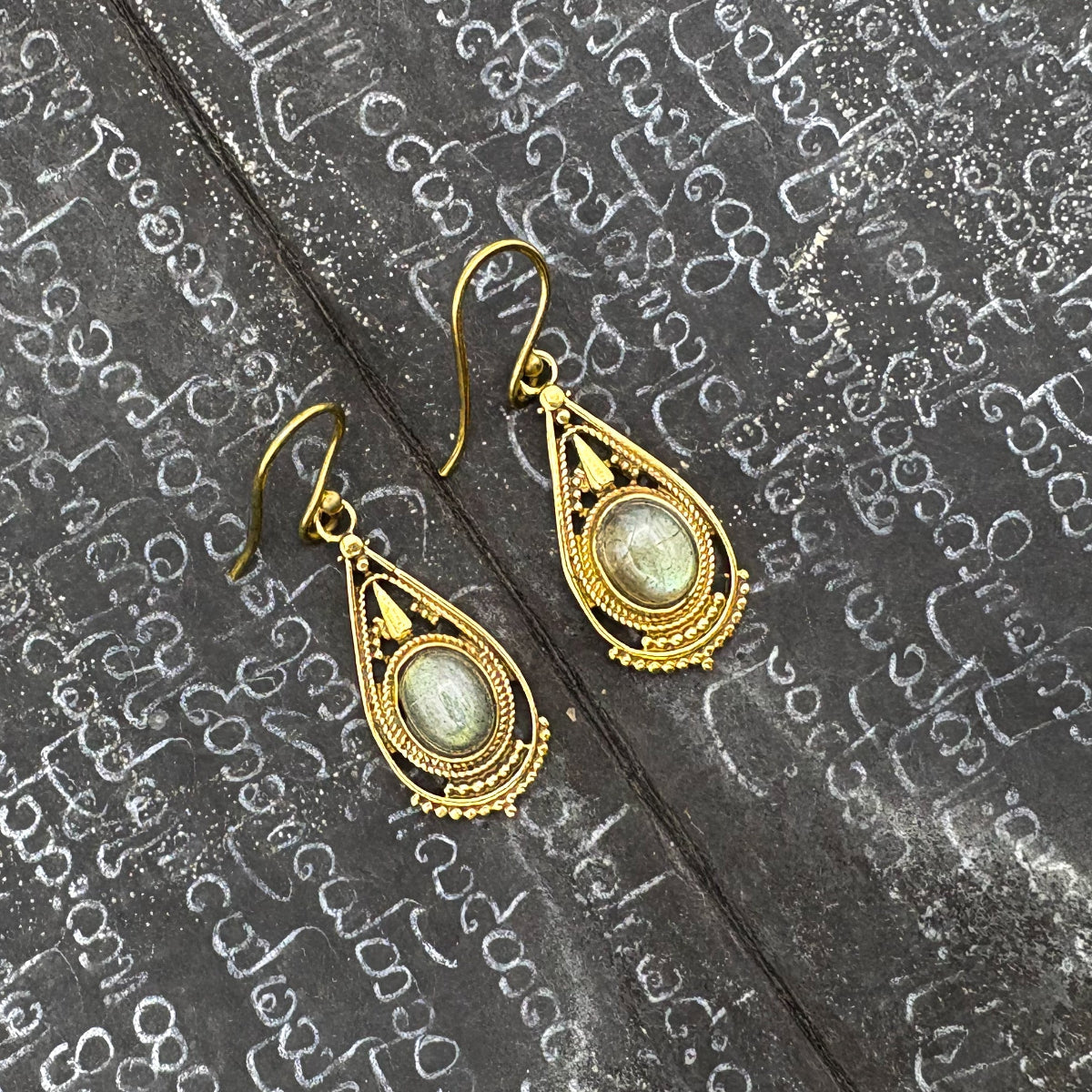 Labradorite Fancy Filagree Teardrop Brass Earrings