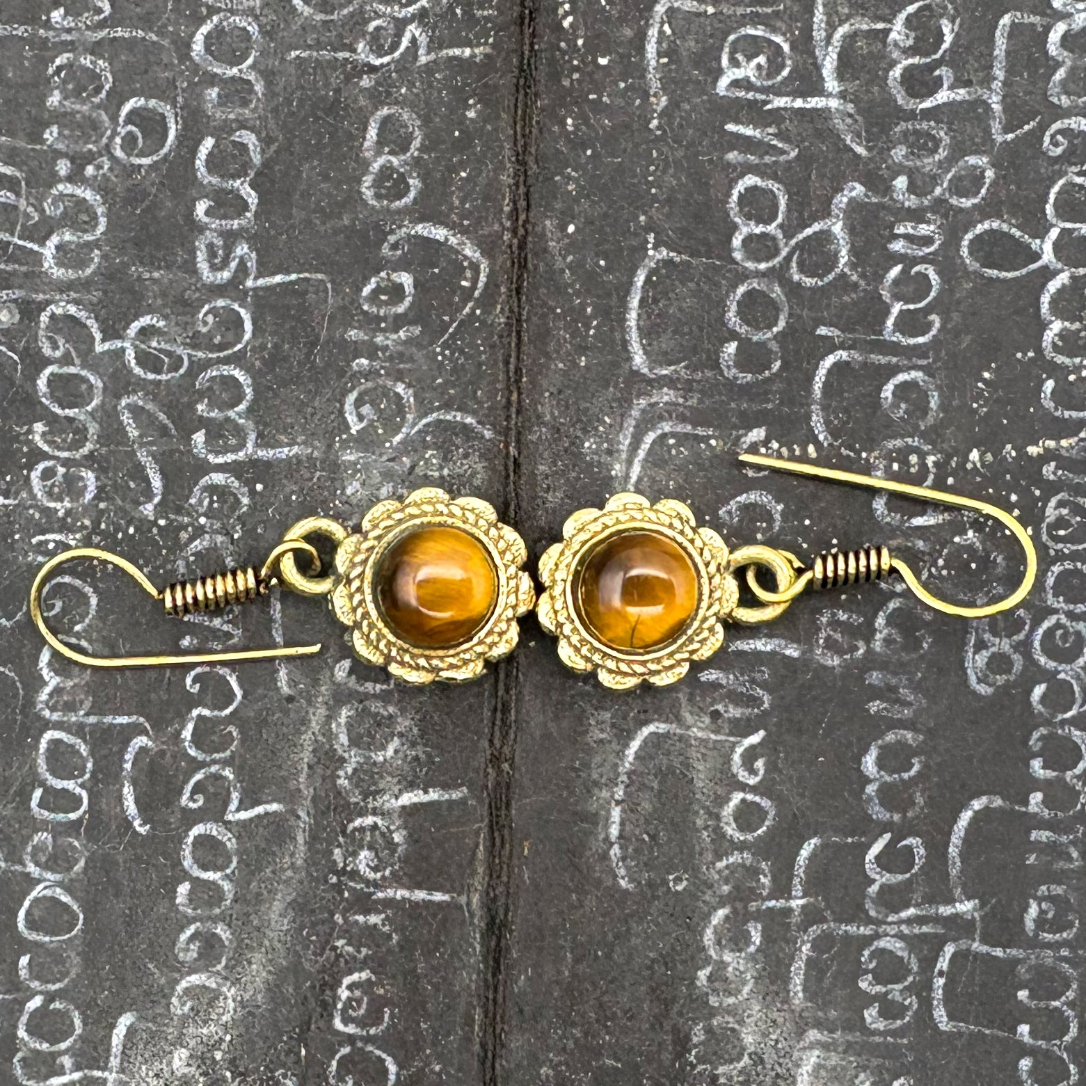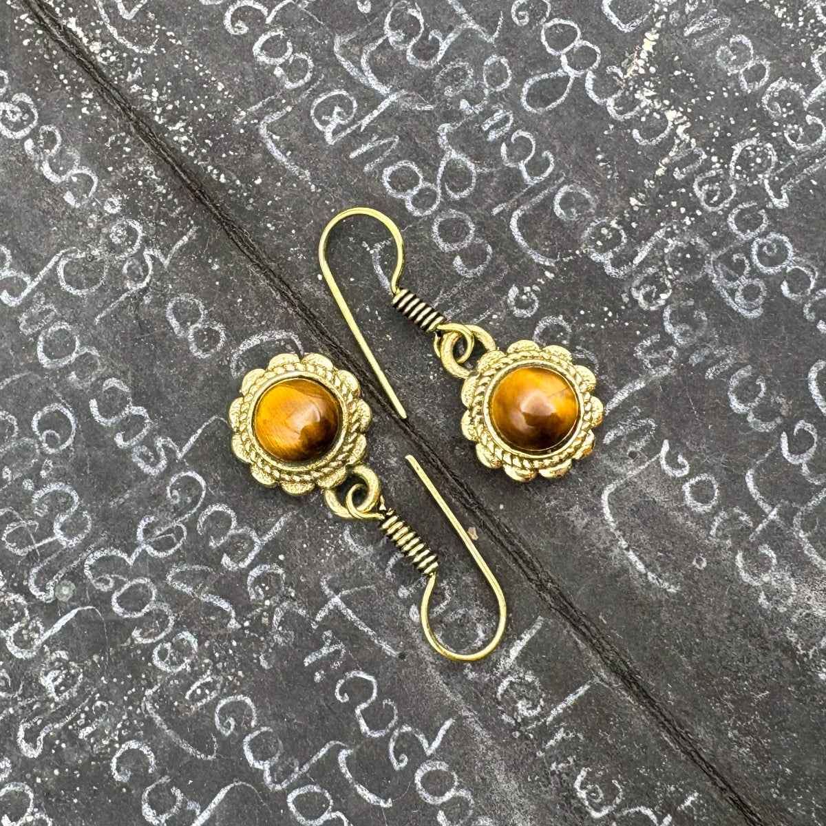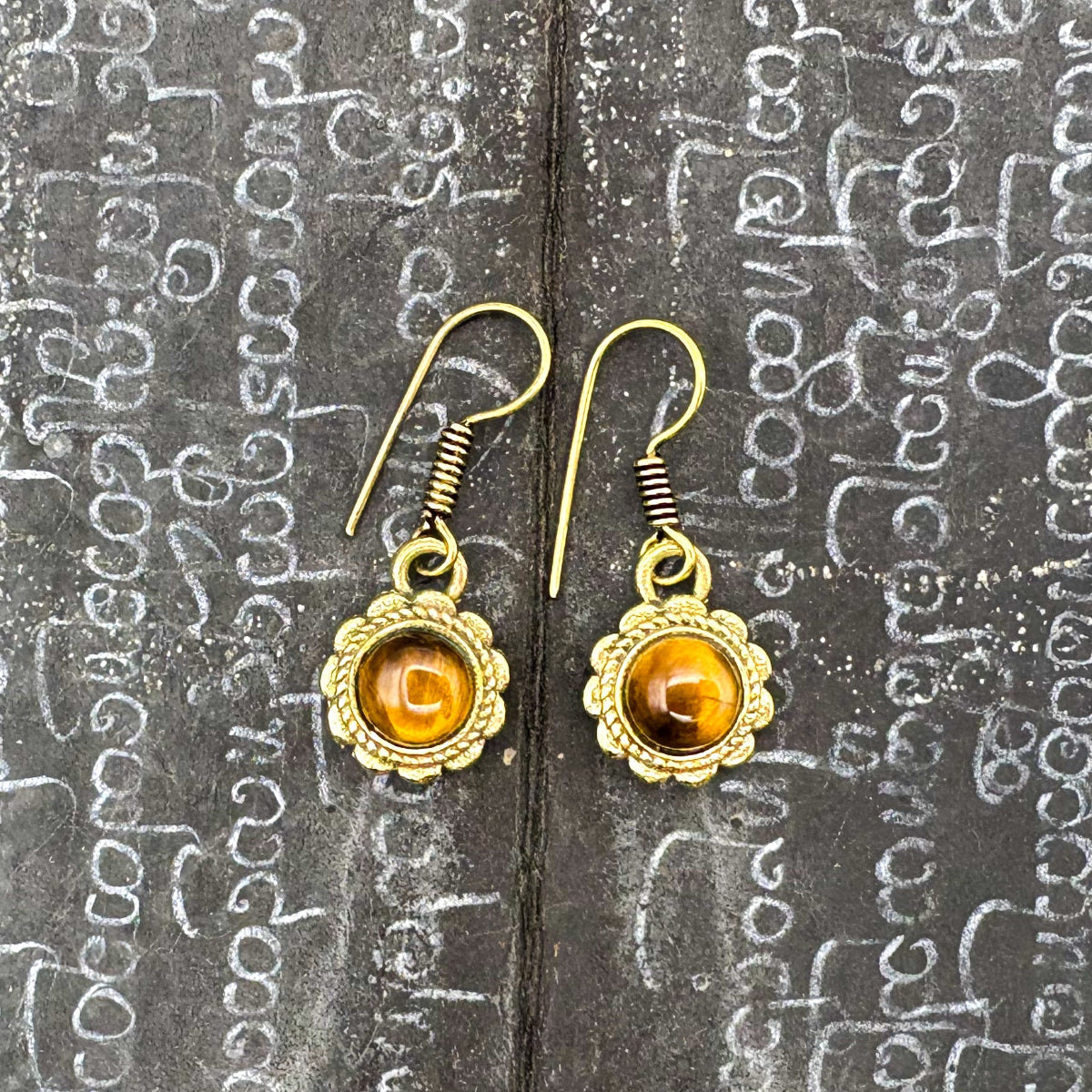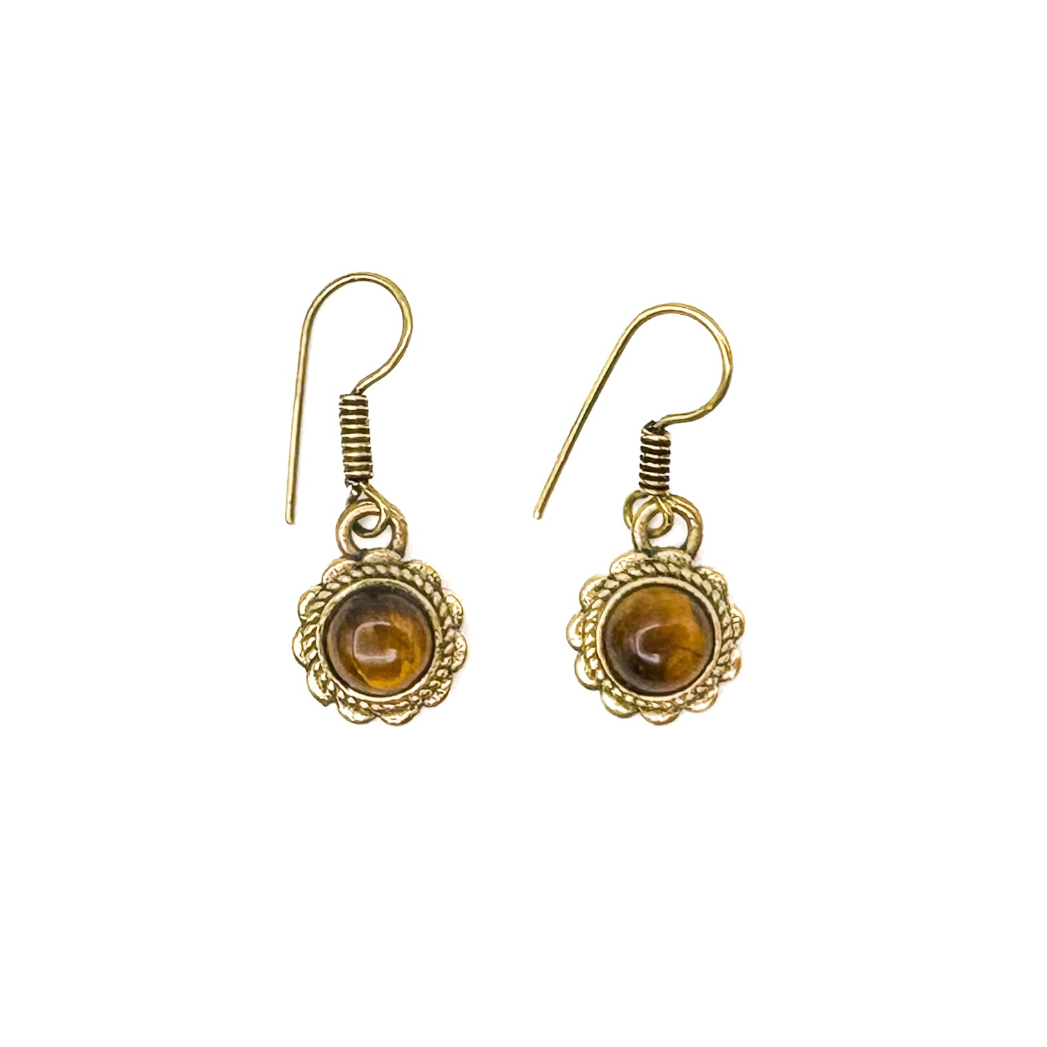 Tiger's Eye Circle Flower Brass Earrings