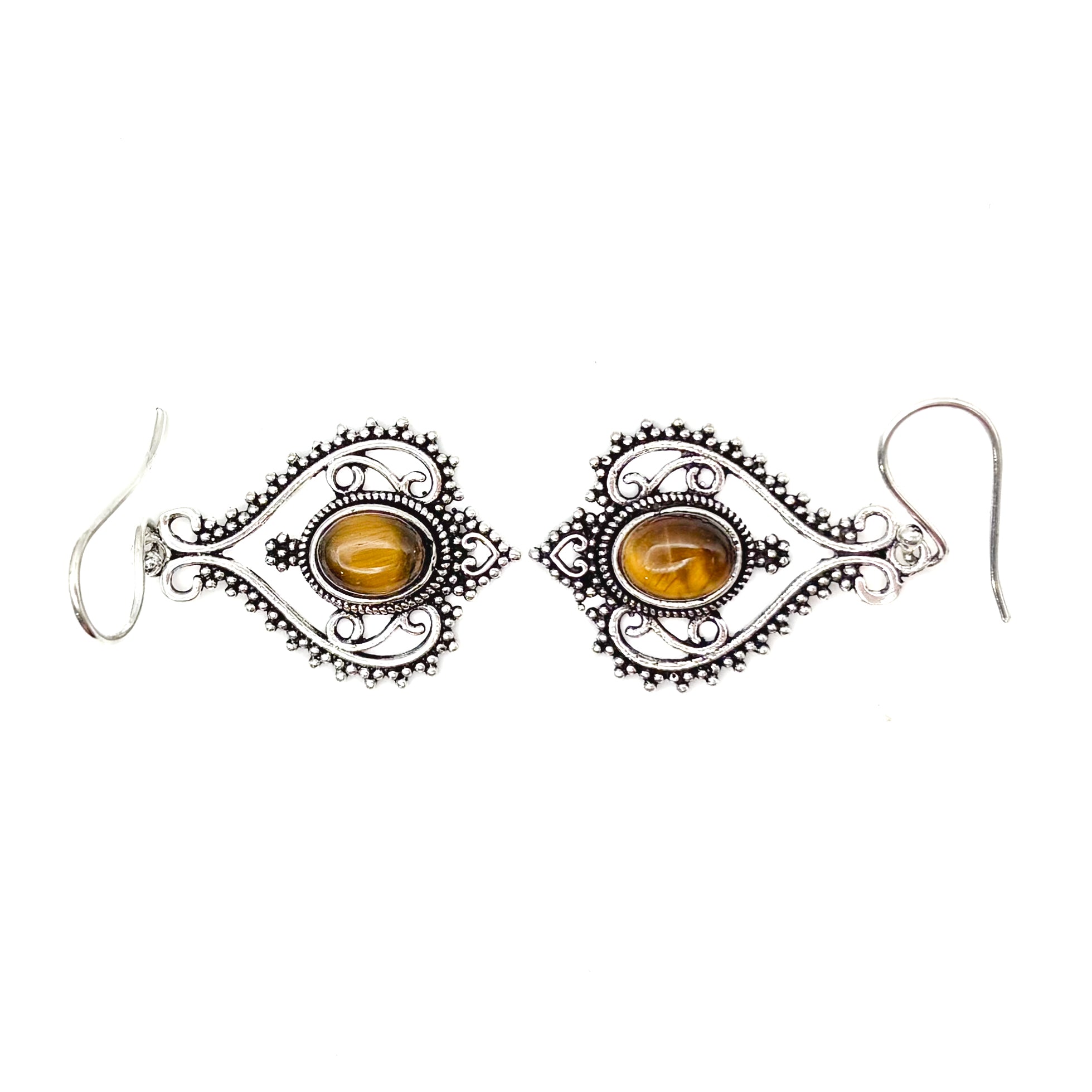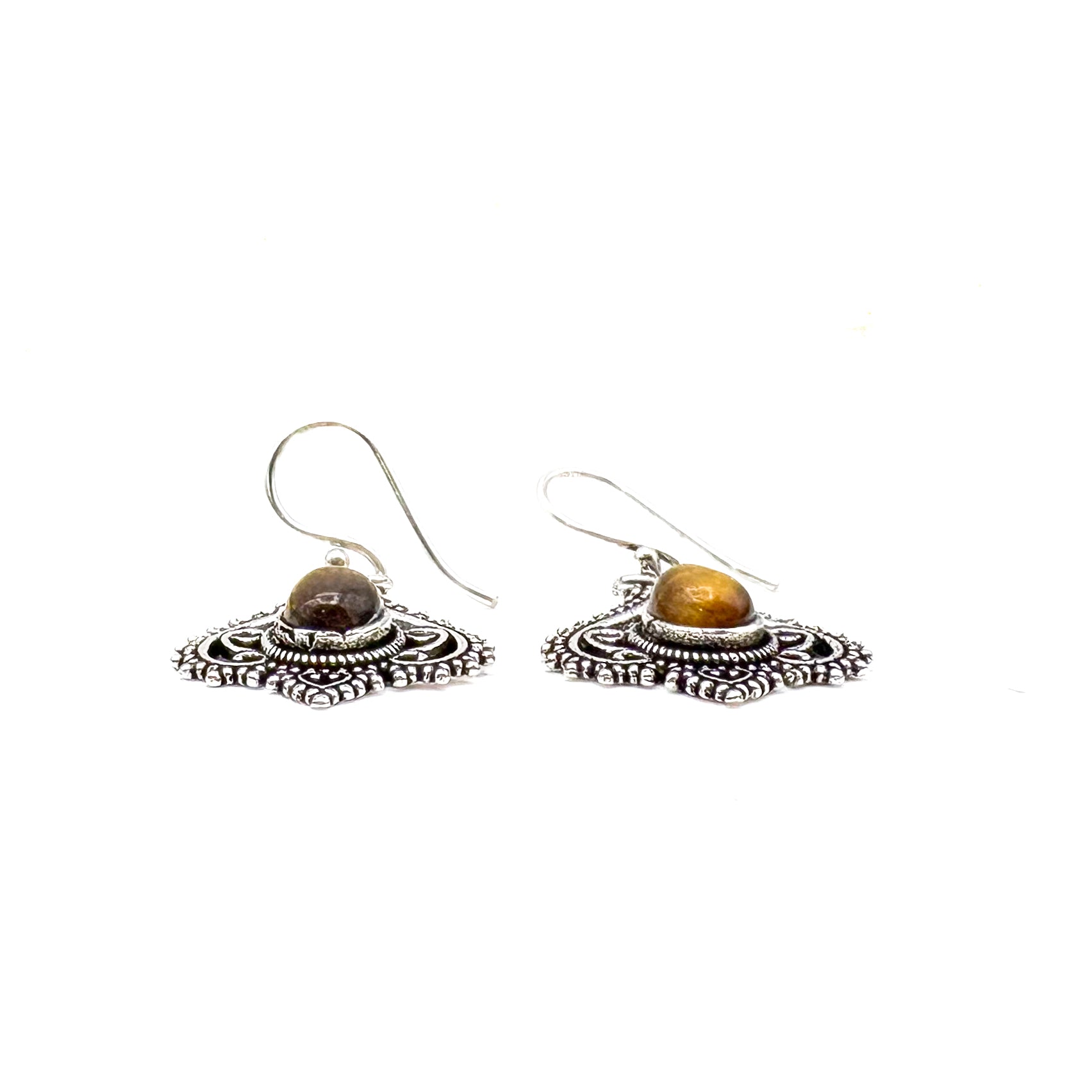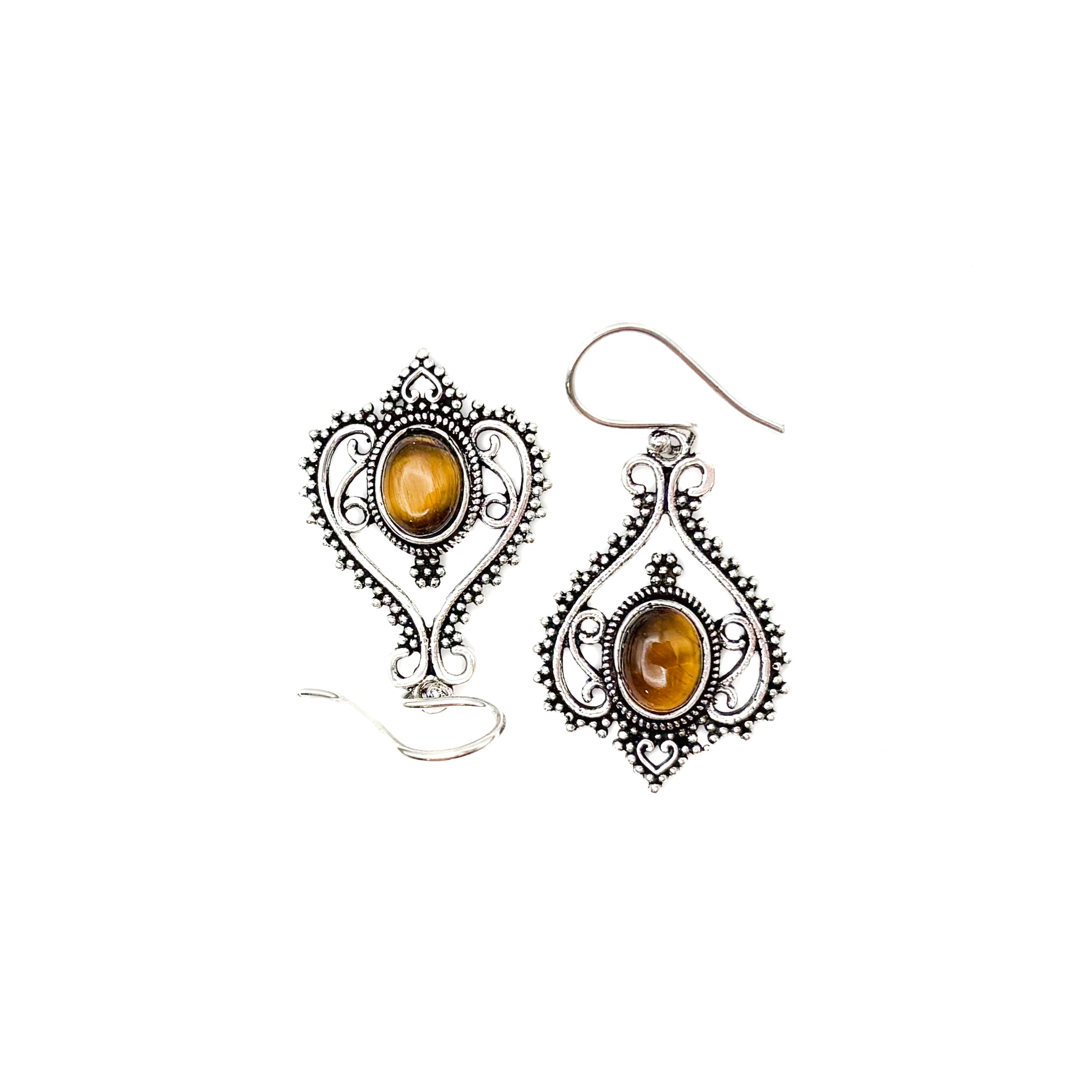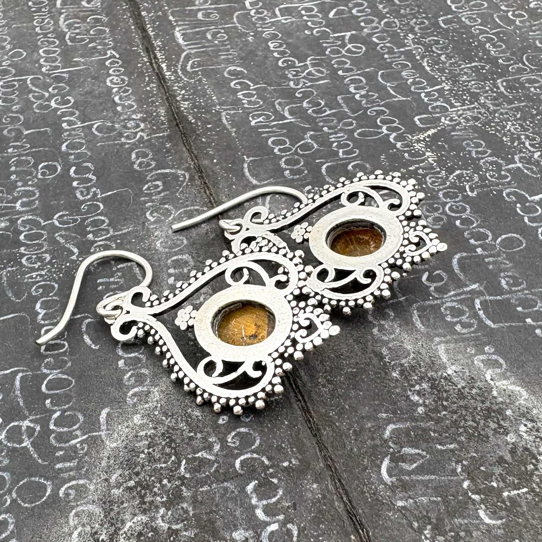 Tiger's Eye Heart Doily Lace White Brass Earrings