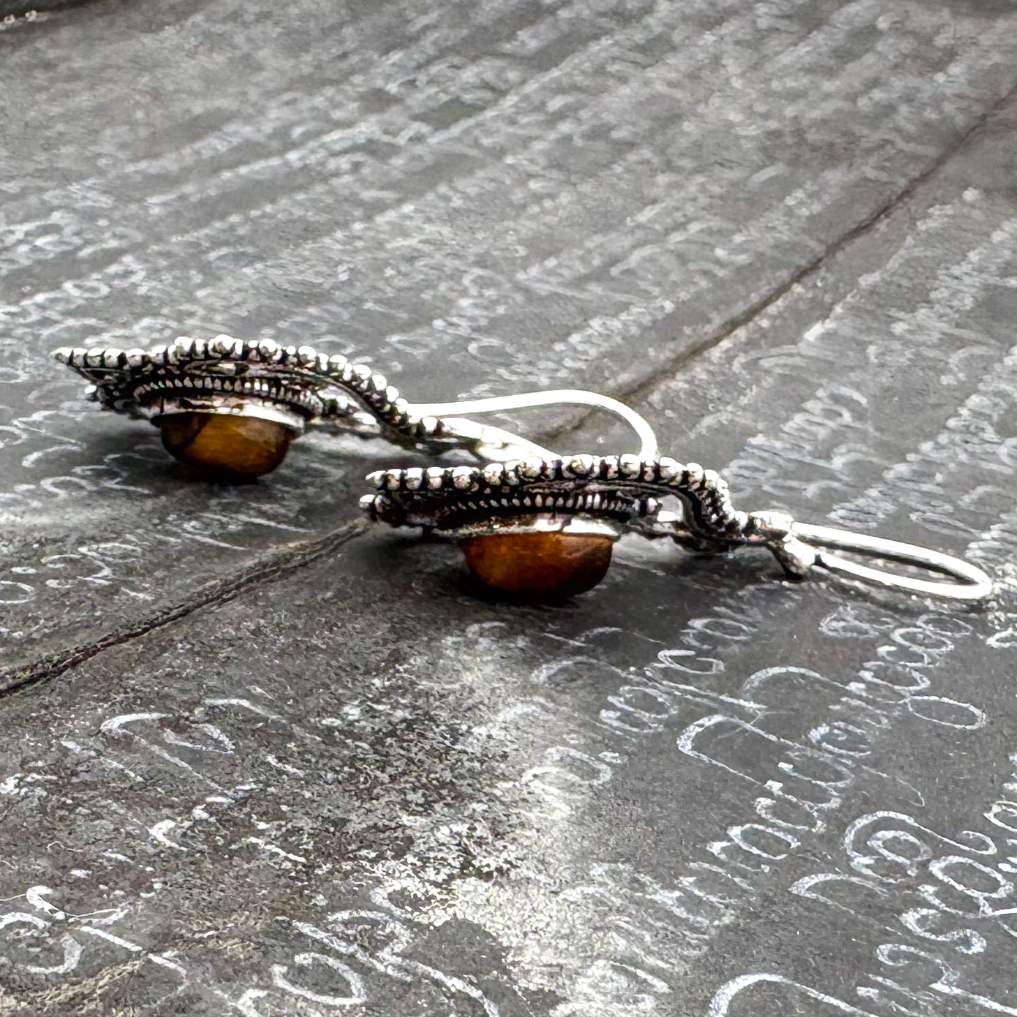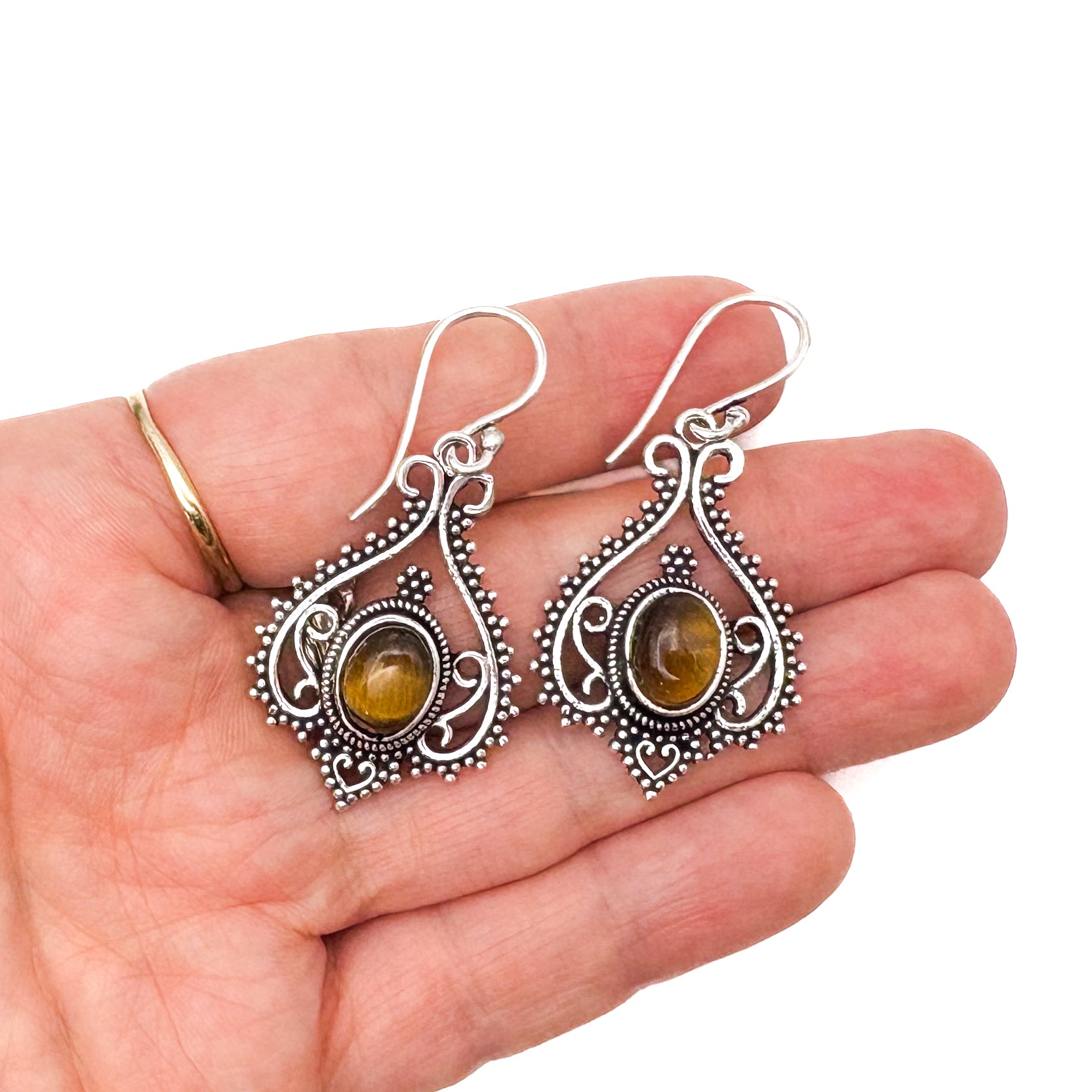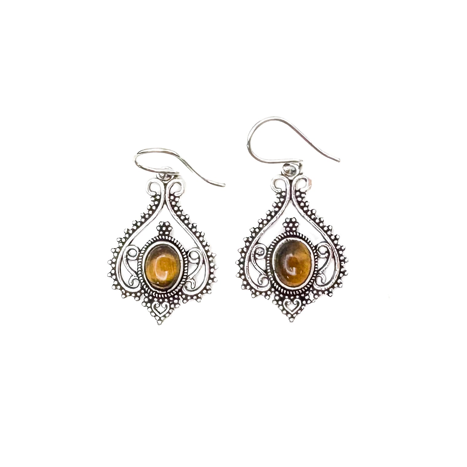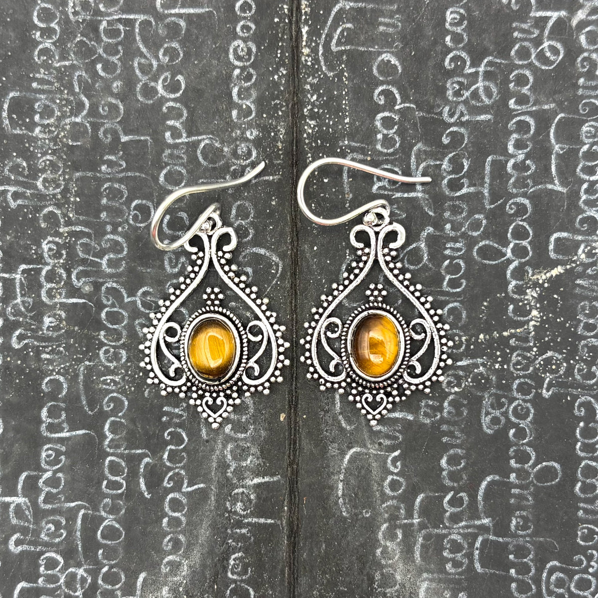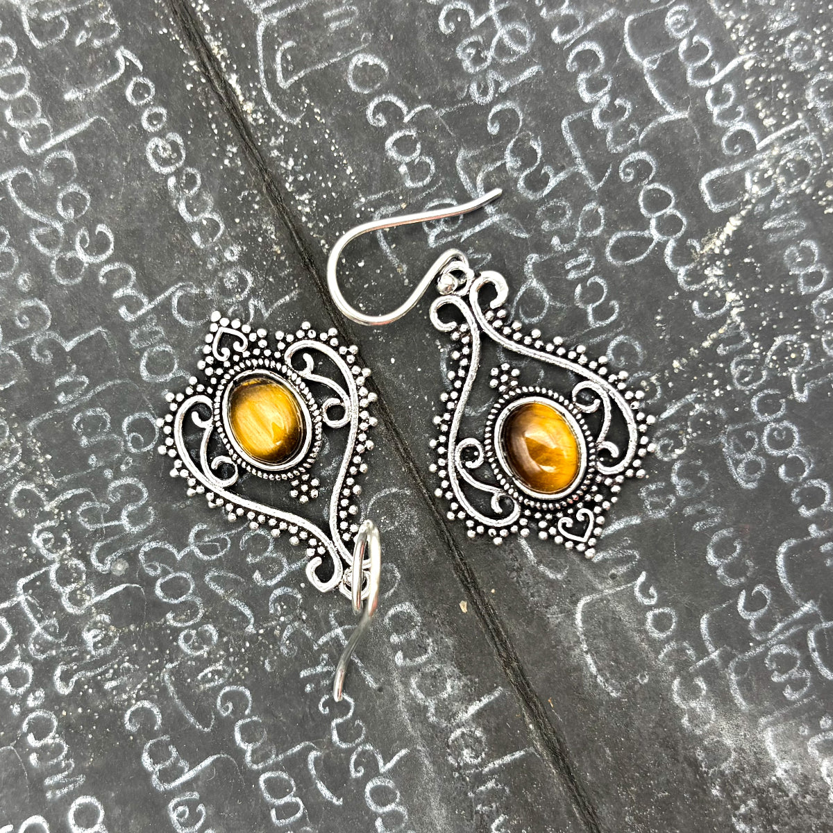 Tiger's Eye Heart Doily Lace White Brass Earrings
