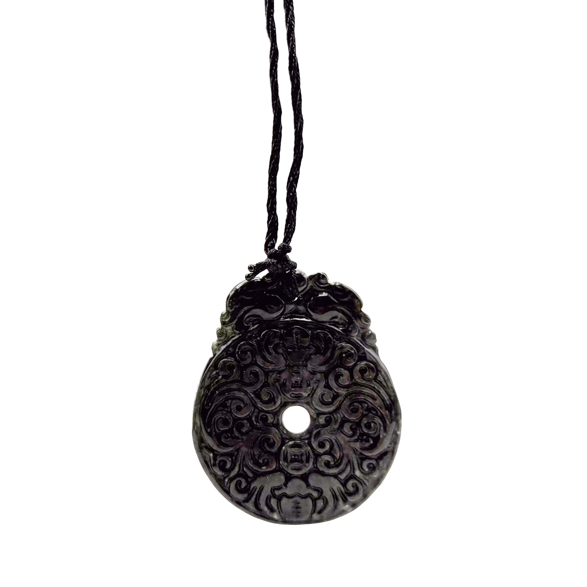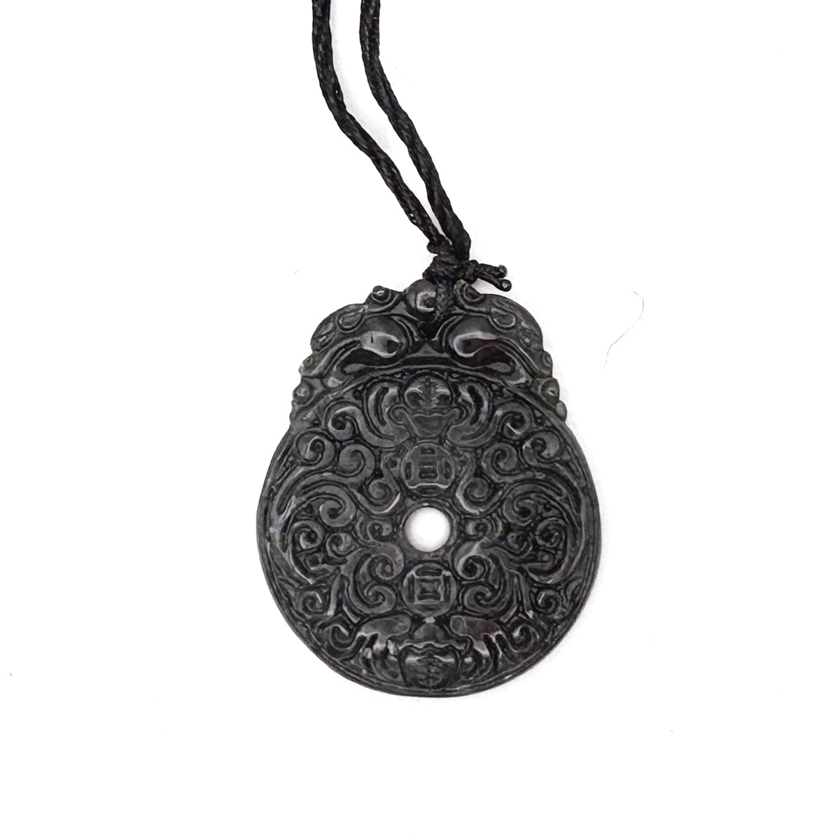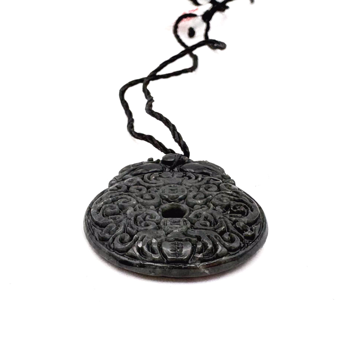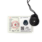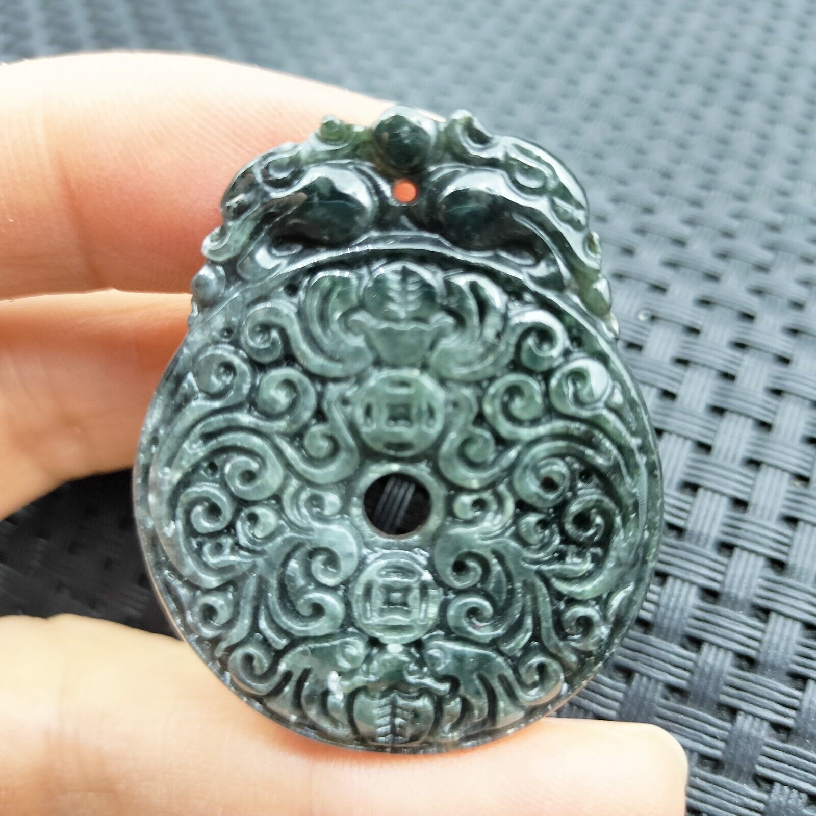 Certified Black Green Natural Type A Jade Jadeite Carved Bat Coin Moire Pendant