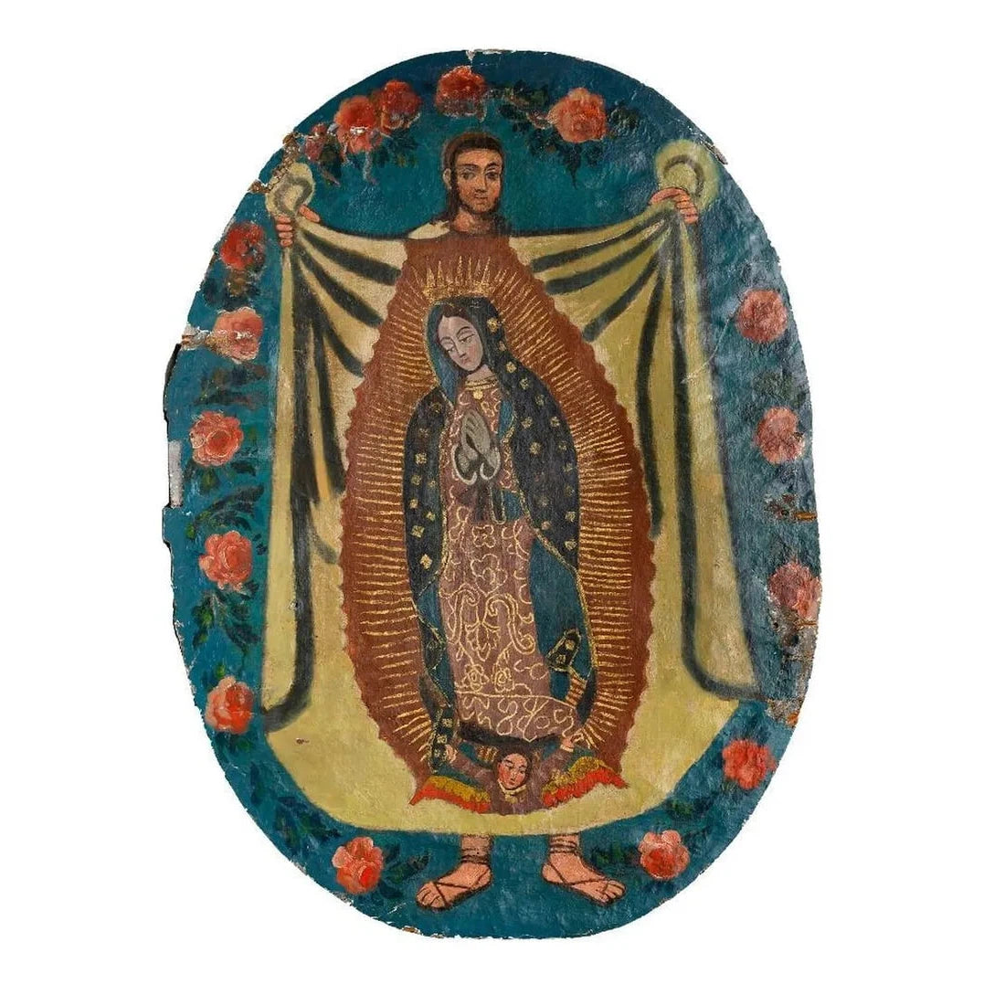 Juan Diego Revealing the Miraculous Image of Our Lady of Guadalupe Early 20th Century Mexican School Retablo Oil Painting on Canvas