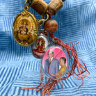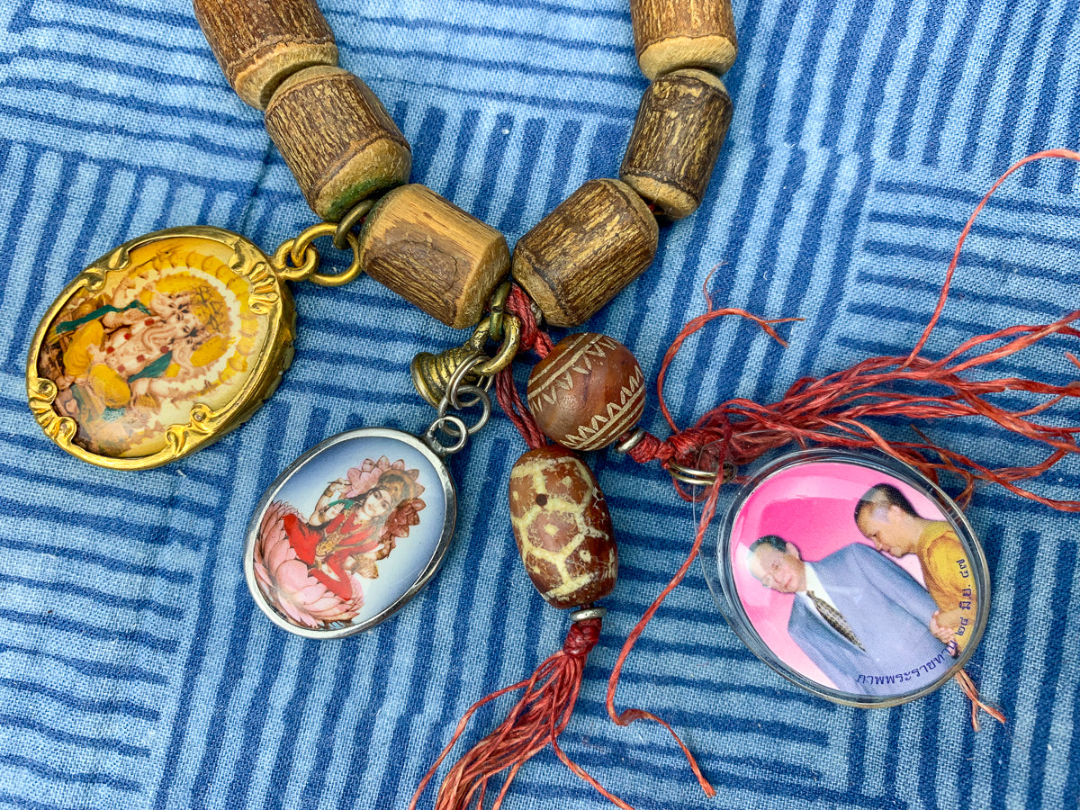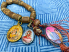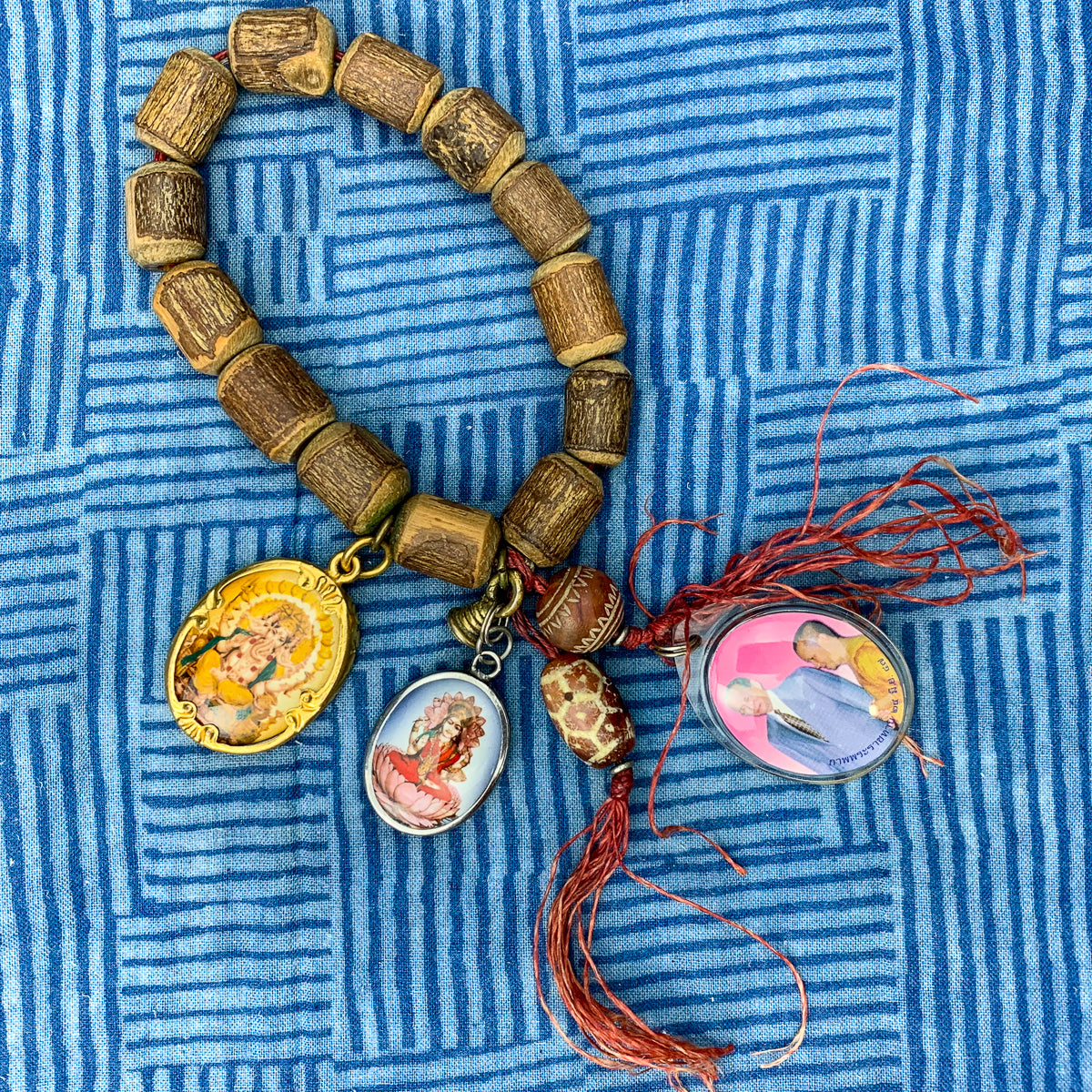 Tulsi Wooden Bracelet with Hindu Charms and Ancient Indus Valley Etched Carnelian Beads