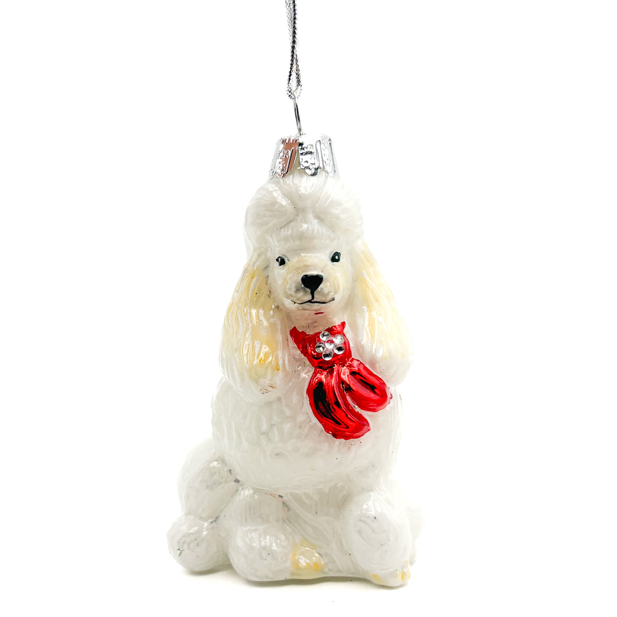 • Our Elegant Poodle is wearing a festive red scarf with rhinestone accents.