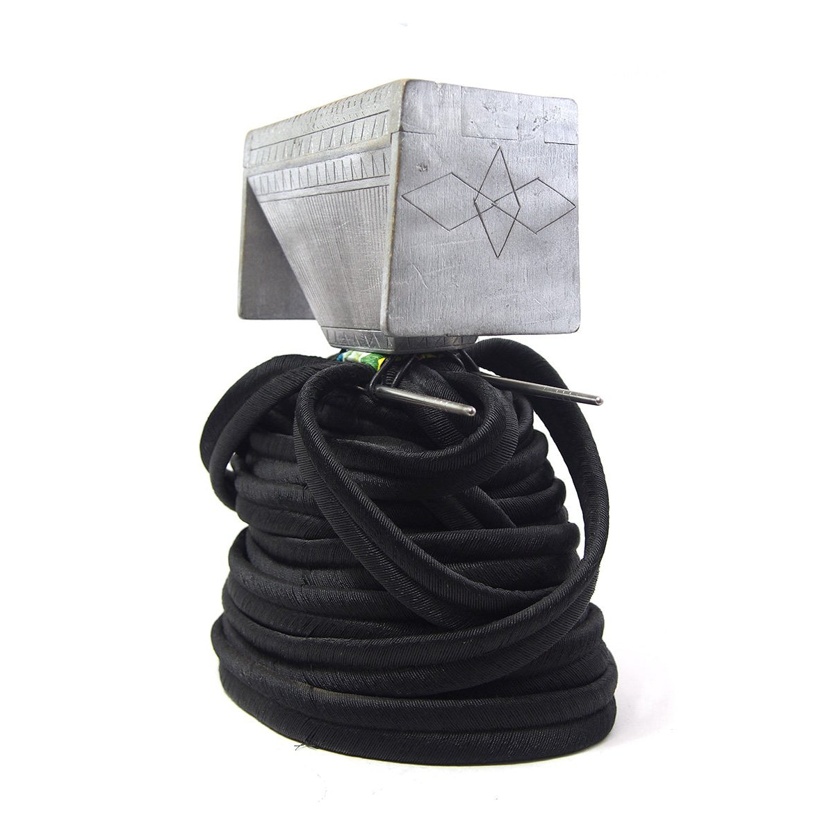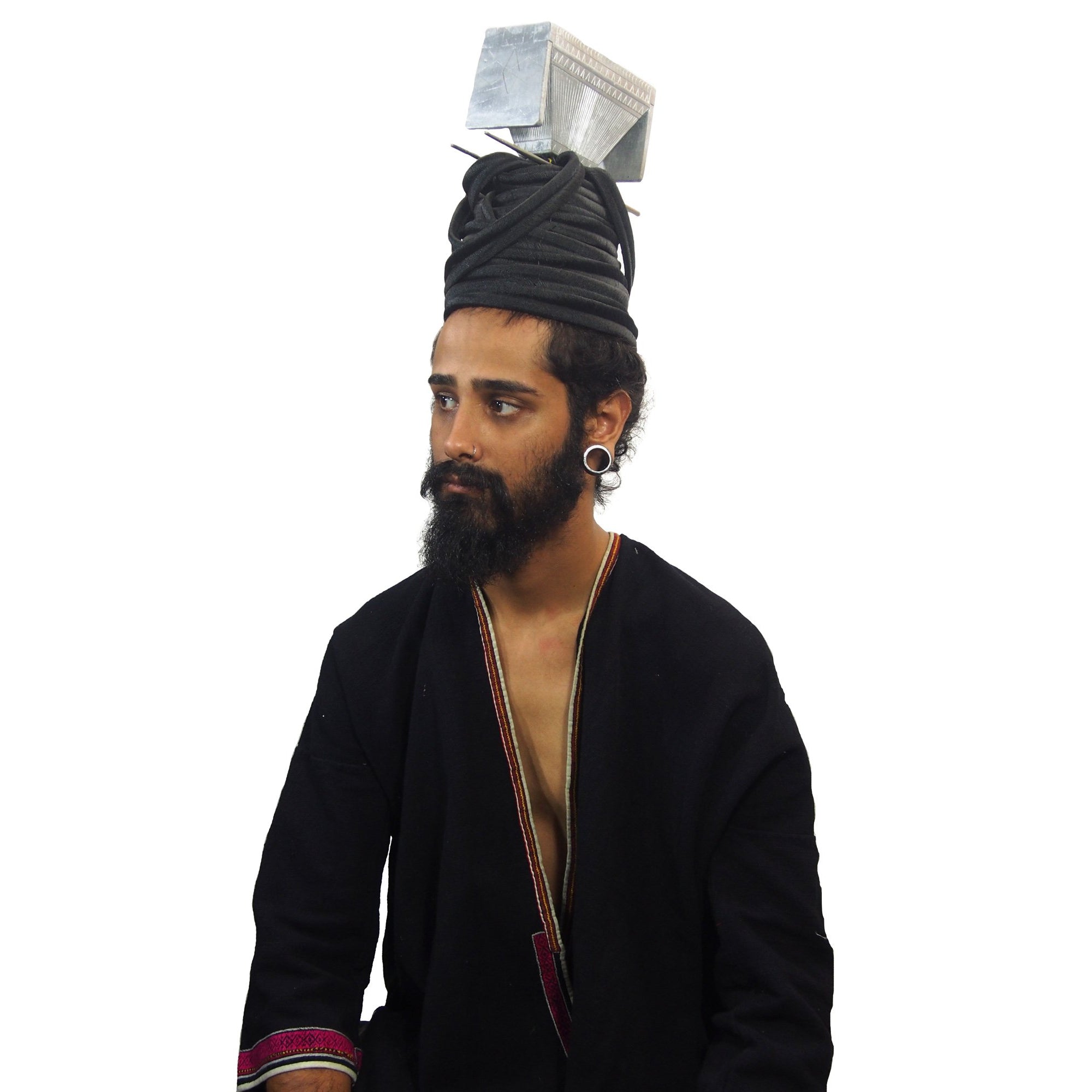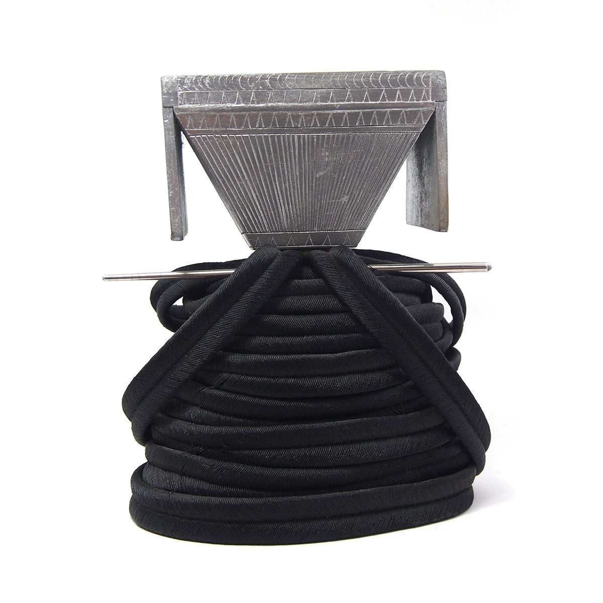 • This example is very rare and rather than aluminum or silver, is actually carved wood that is painted silver. Sinuous "hair braids" made of flat finely braided nylon fiber create the Crown's base, and add to the height. The wooden Crown is secured to the nylon coiled hair base by a set of aluminum chopsticks that attach the Crown element to the nylon hair base.