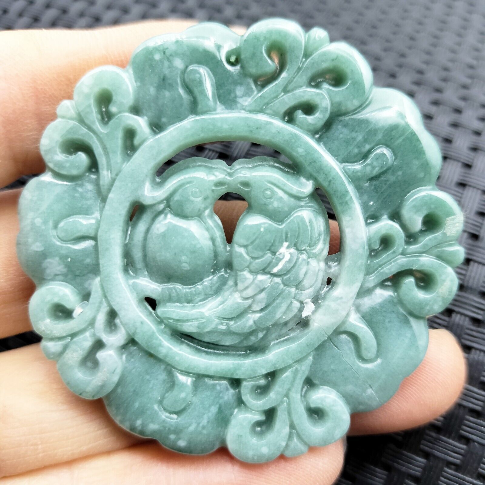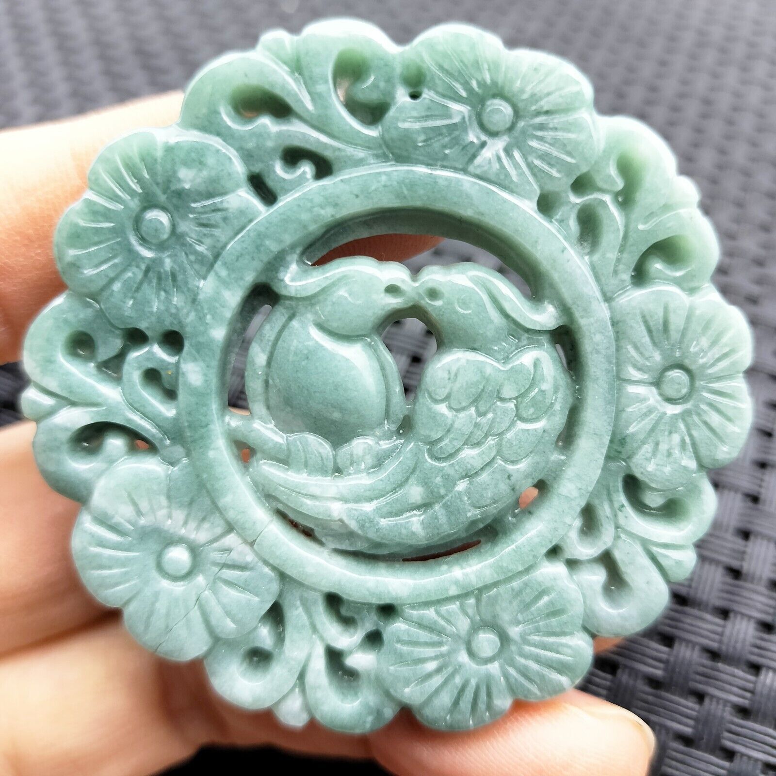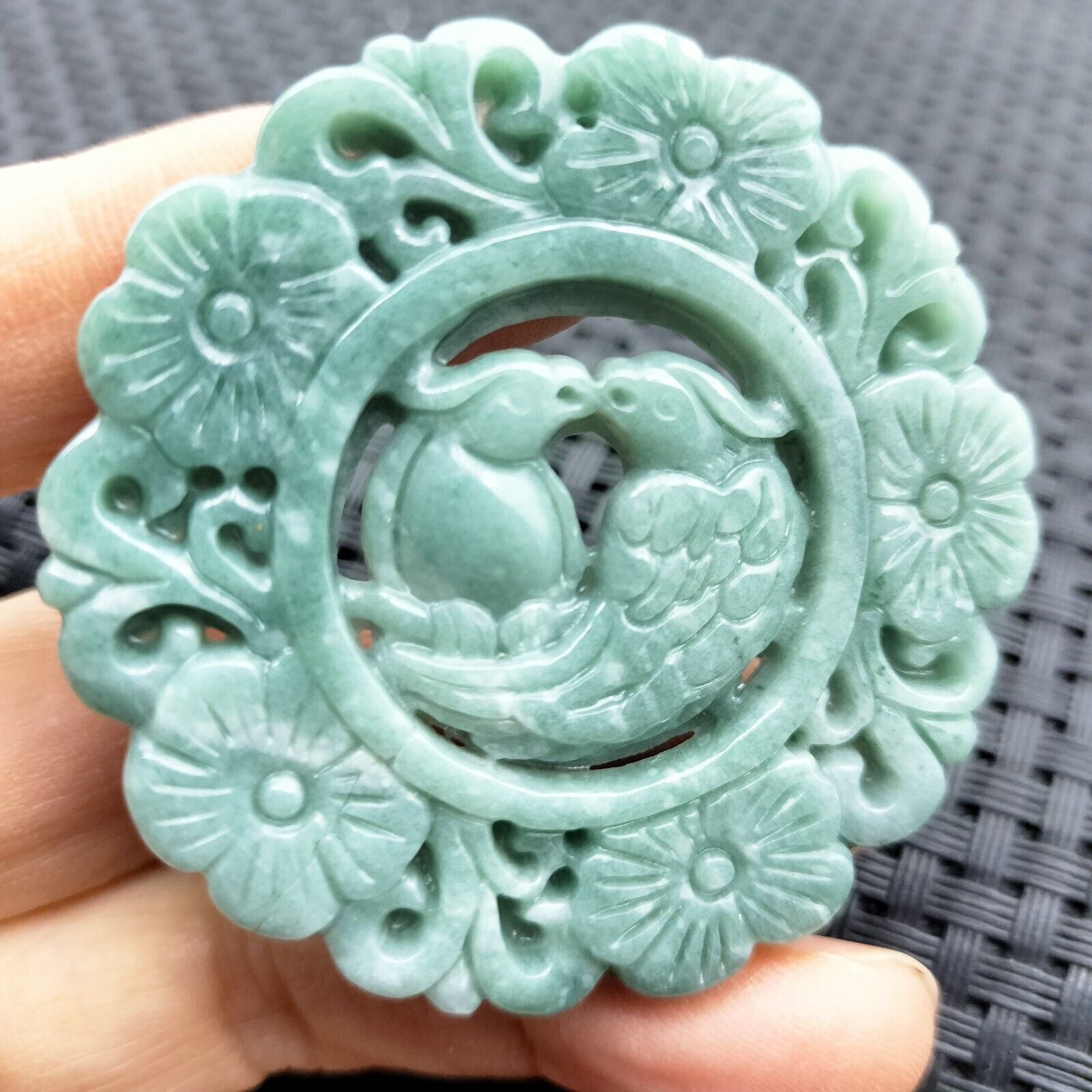 Certified Green Natural Type A Jade Jadeite Carved Double Bird Flower Pendant