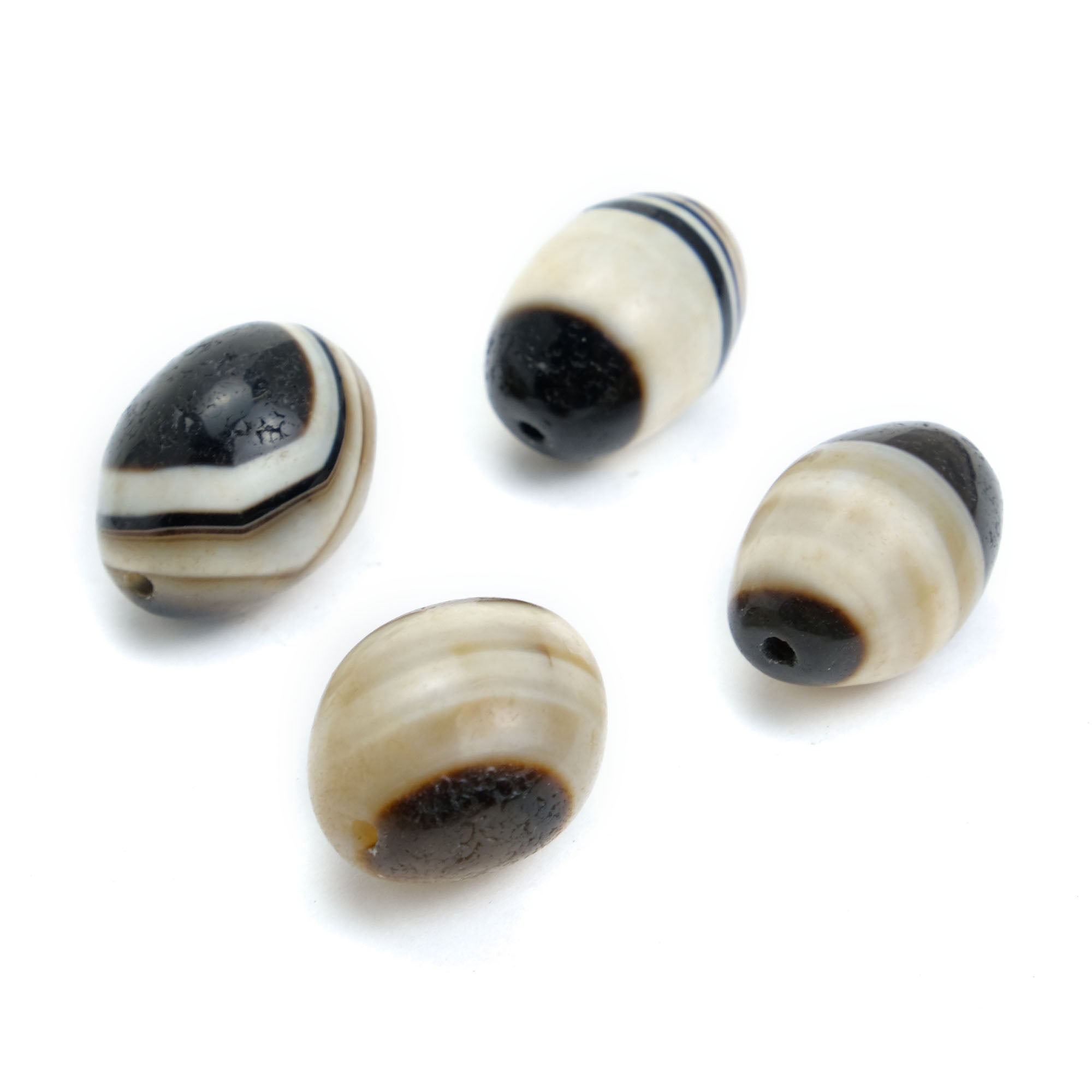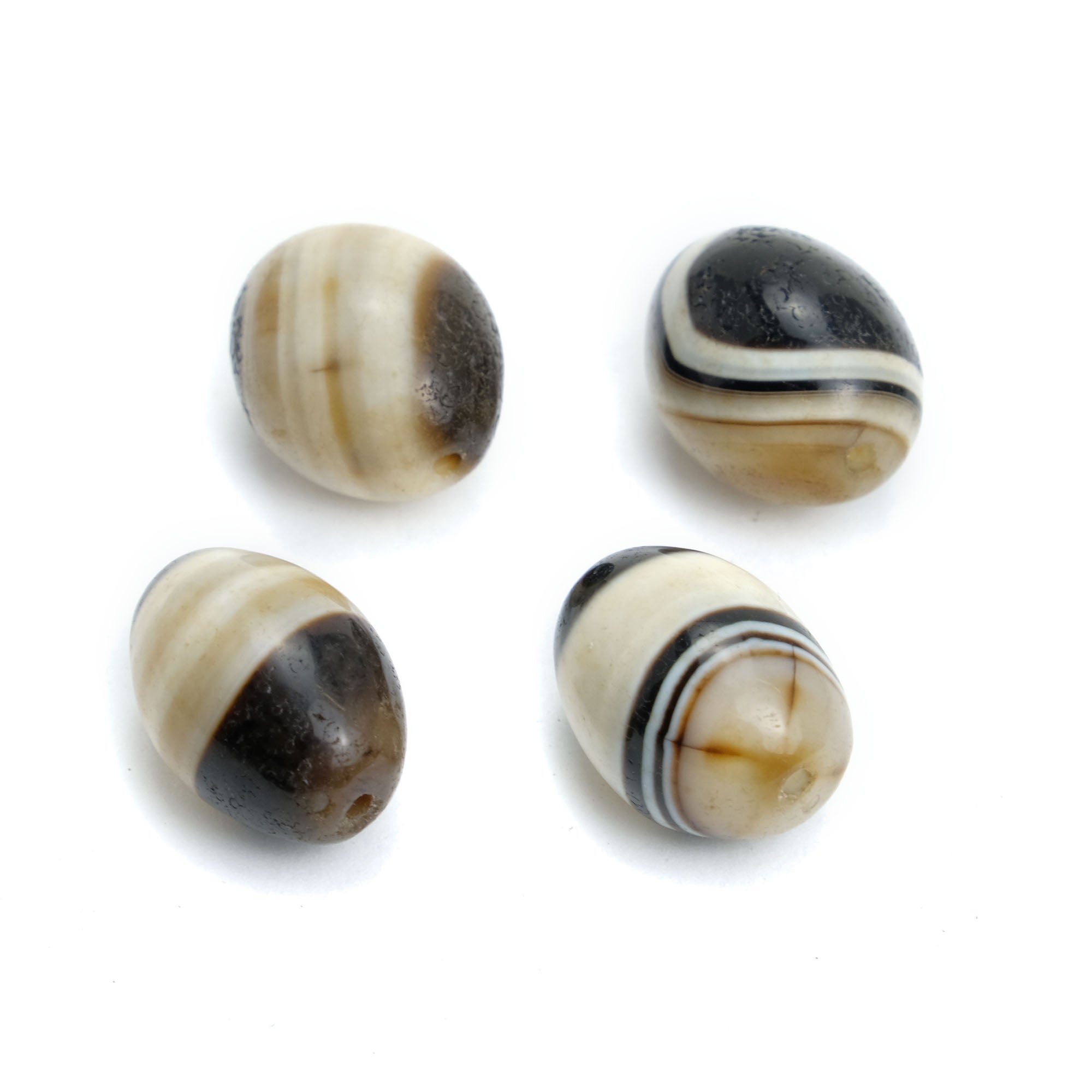 • Suleiman Agates, or Solomon’s Agates, are a highly revered bead throughout the Near East and Central Asia that has been shrouded in mystery for centuries. While some say the name comes from the secret location they were originally mined from, which only King Solomon knew, others say that they were once plain, unpatterned agates that only developed bands after being in the possession of the famous King himself and his fabled wisdom. They were said to impart to the possessor that same knowledge and power, as well as the ability to control djinn (genies).