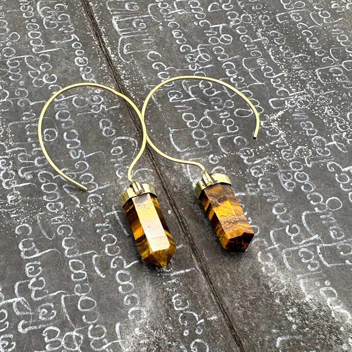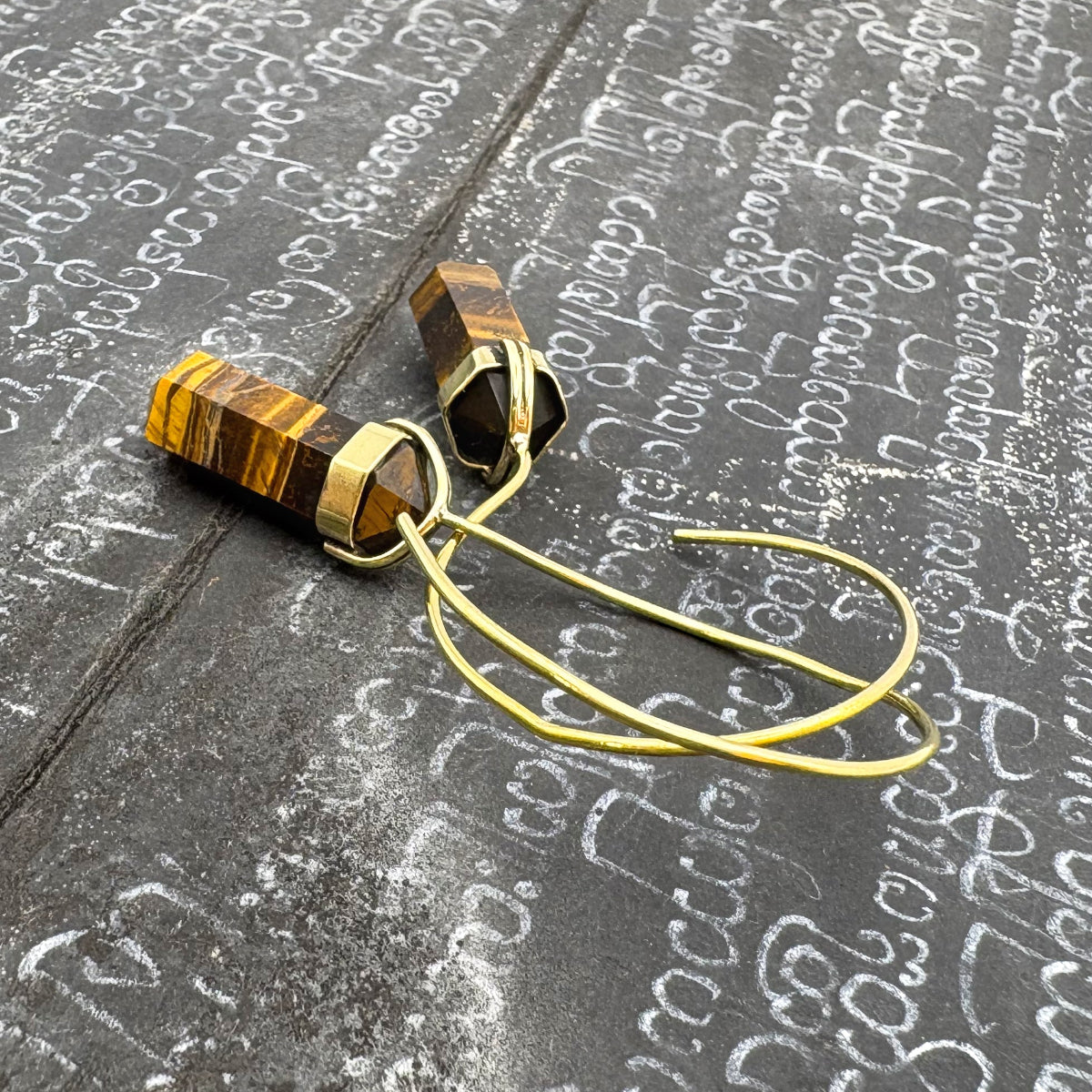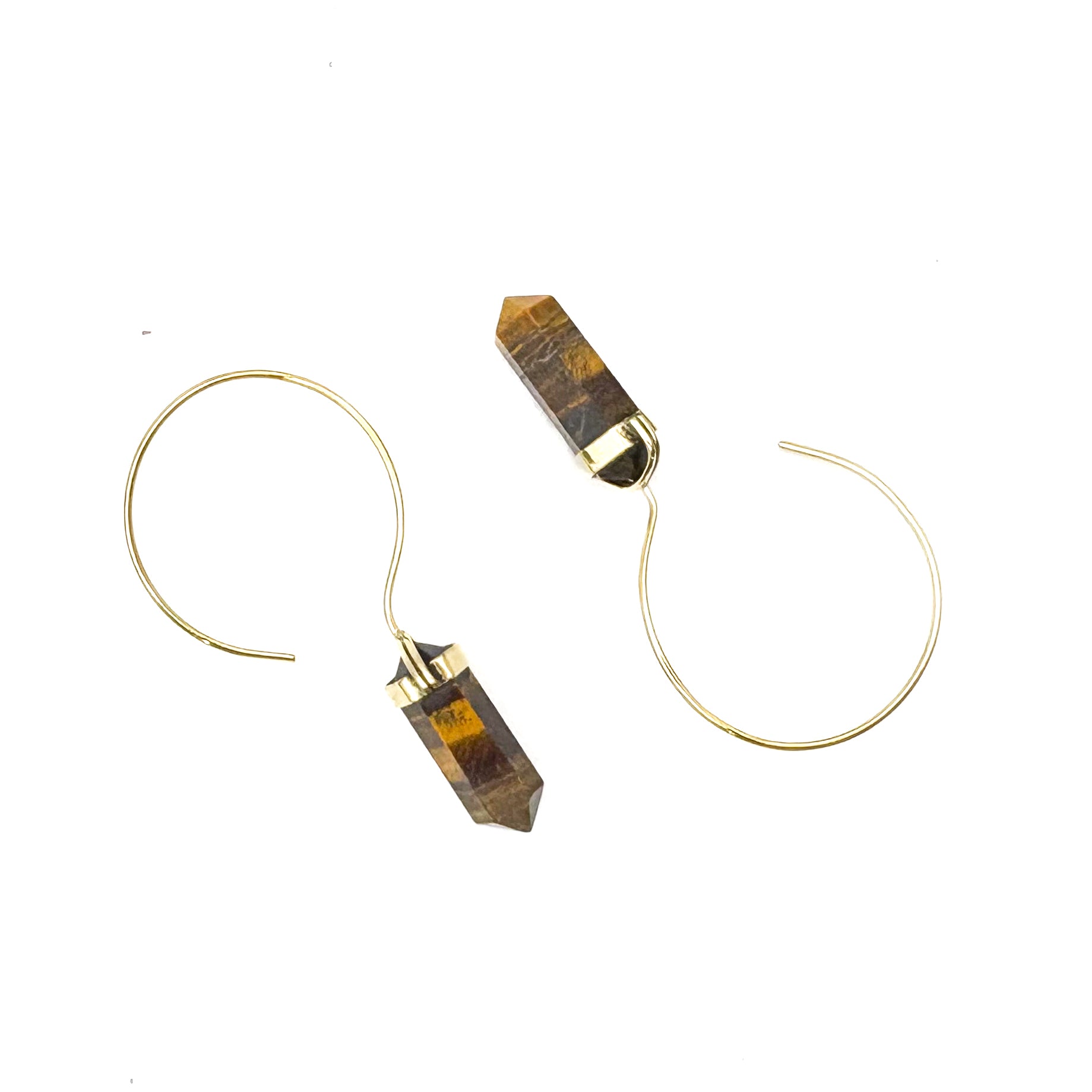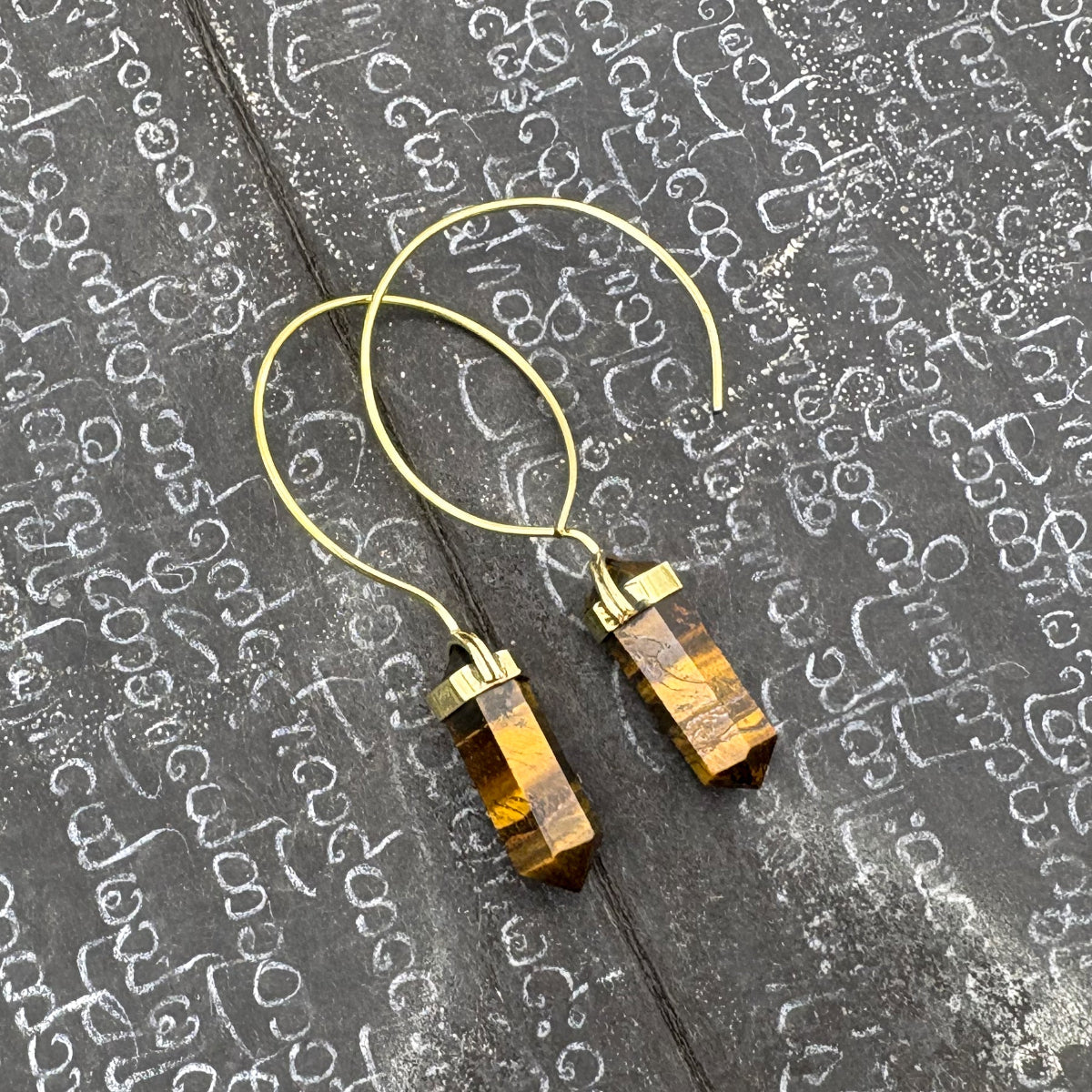 • Tiger's Eye Crystal Point Brass Hoop Earrings