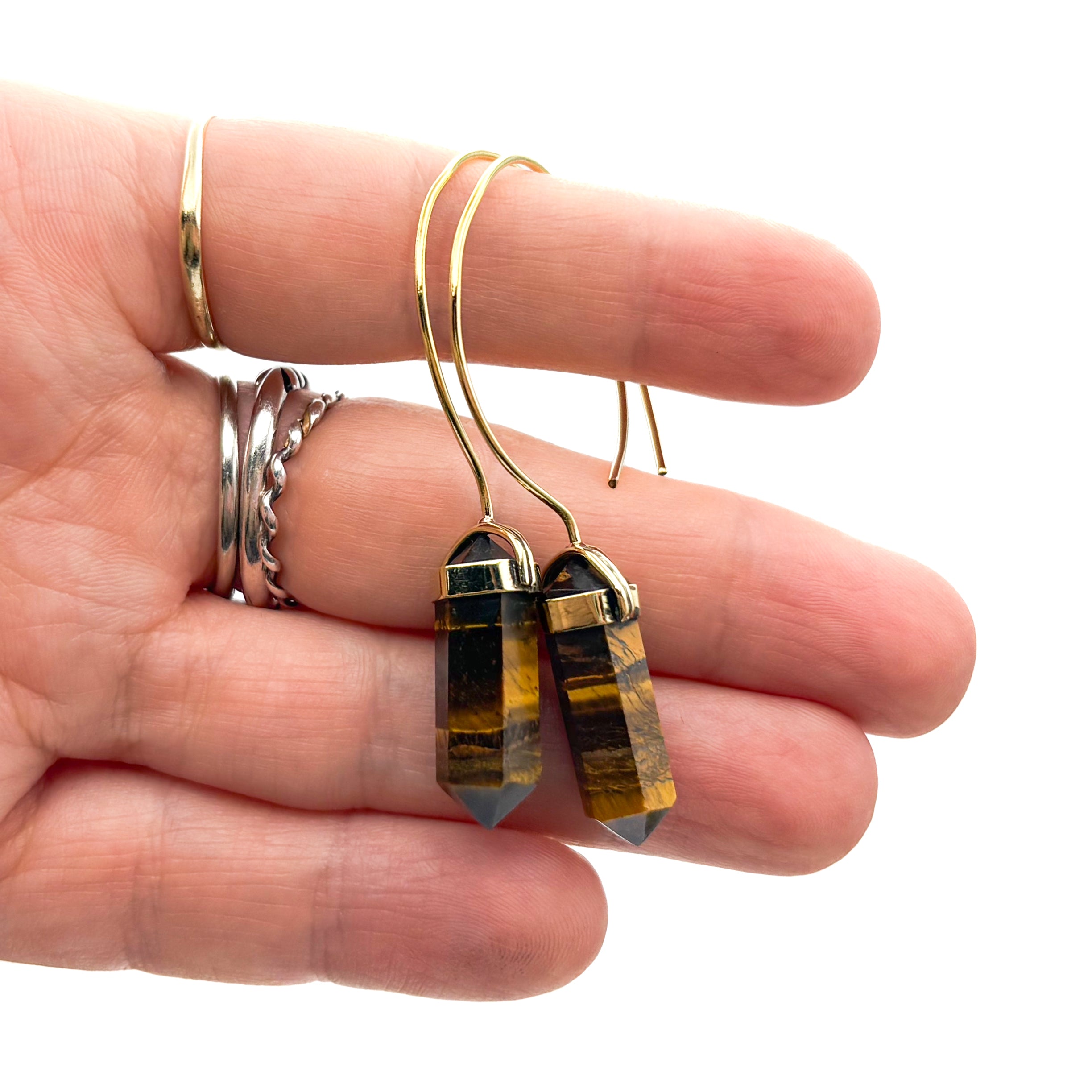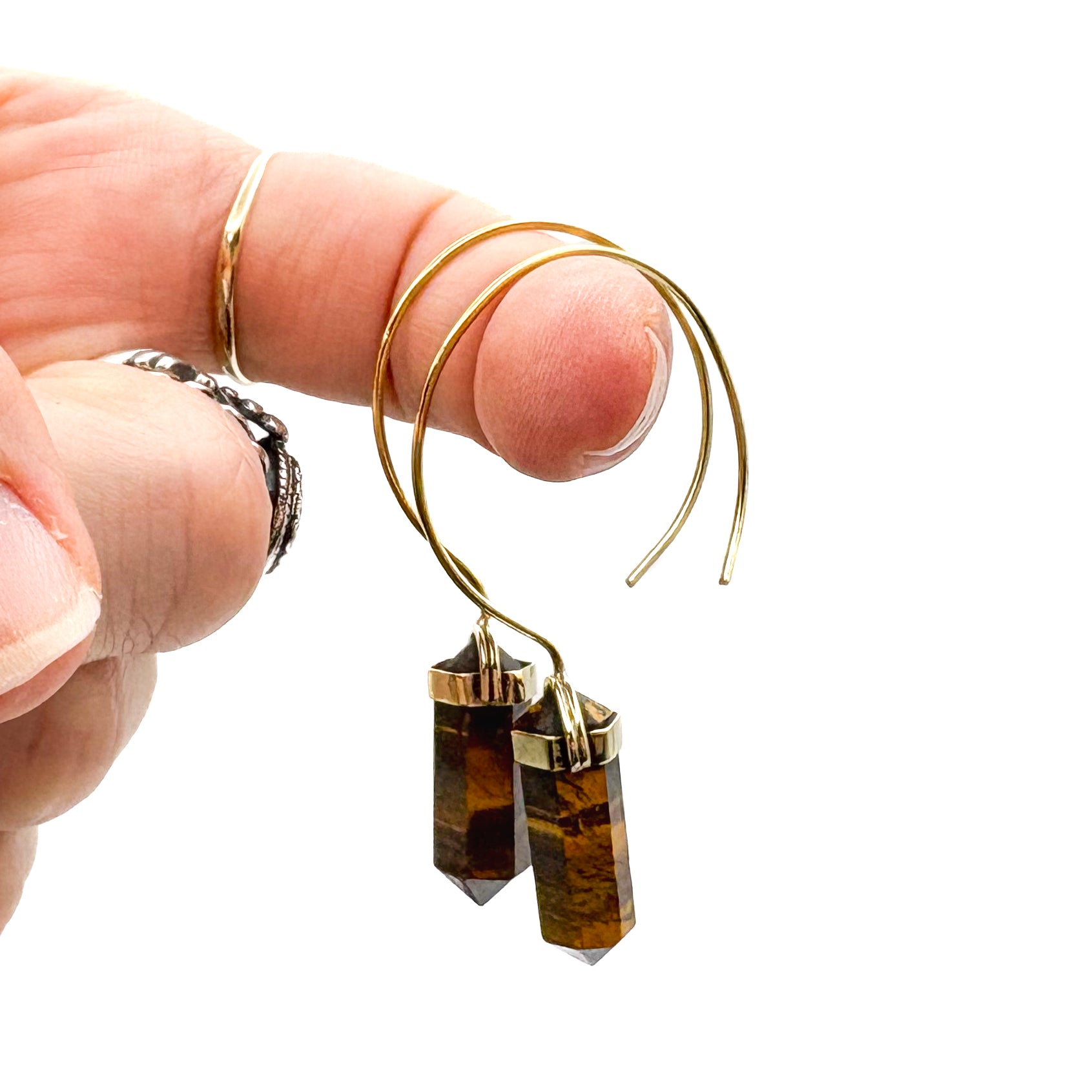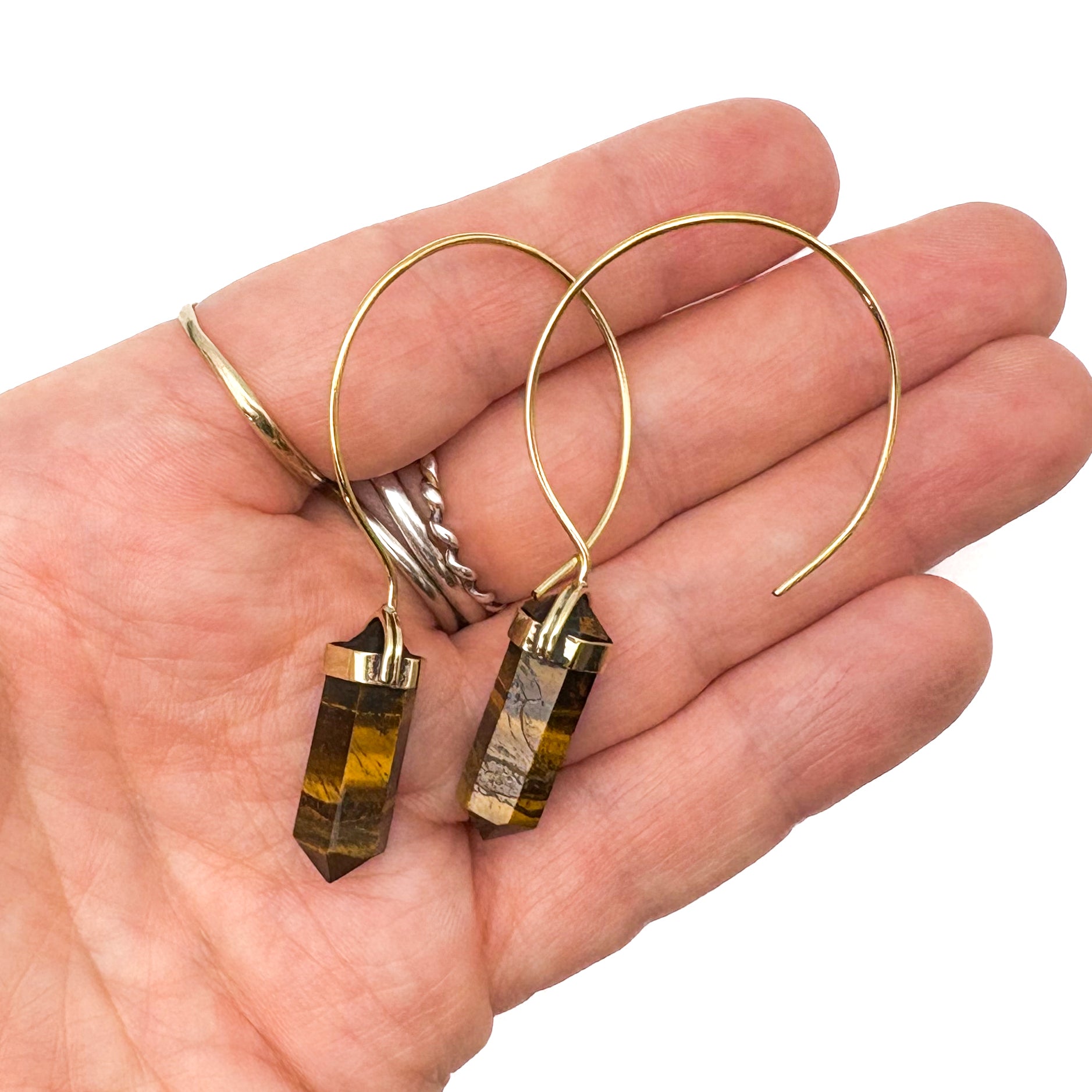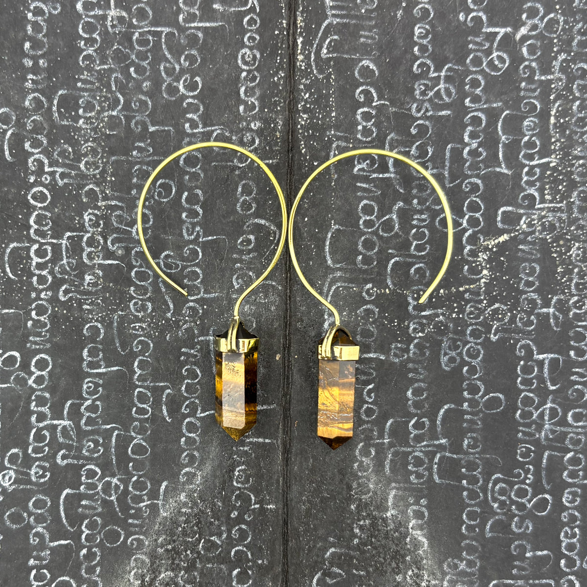 Tiger's Eye Crystal Point Brass Hoop Earrings