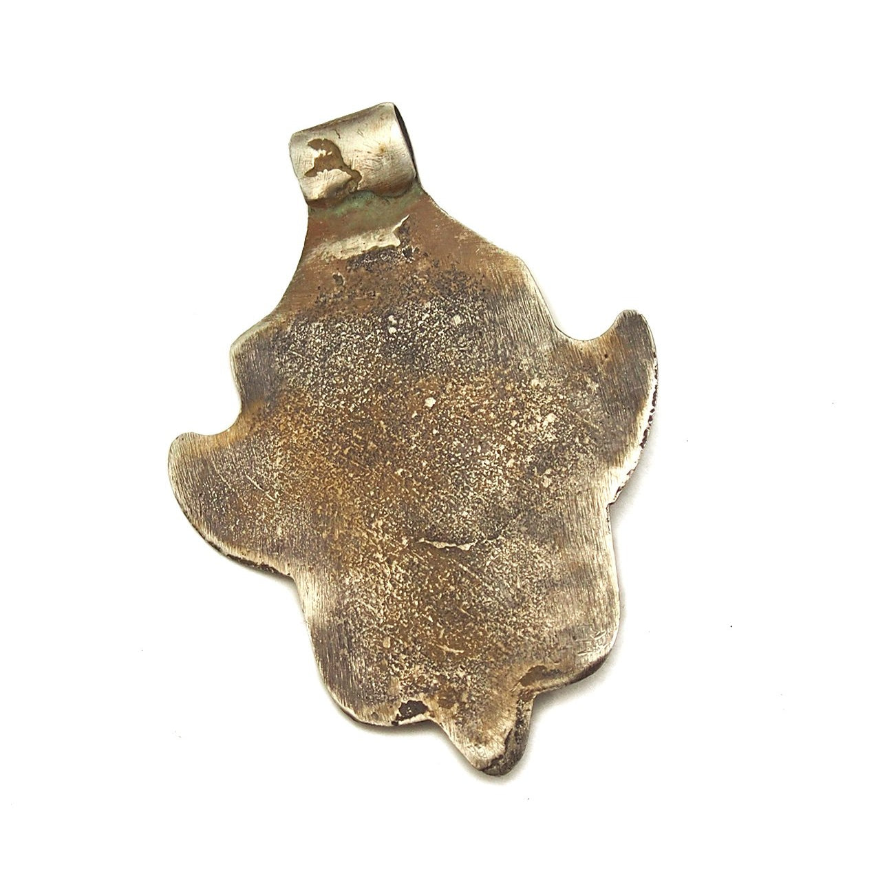 • This particular style of Hamsa is from the town Essaouira. The Hamsa body appears to be cast 800 Silver (80% silver content) which was then hand finished and stamped with a pattern. The stamped Hamsa then received a Salamander Totem, which was cast in 92.5 Sterling Silver, and soldered on to the 800 Silver base. This addition to the Hamsa base accounts for the discoloration surrounding the Totem. The Hamsa also received an Egg Totem, also in 92.5 Sterling Silver. The symbolic effect becomes a Motherhood Charm. This would be a very Potent Protective Charm for a woman with children, or a woman expecting a child.