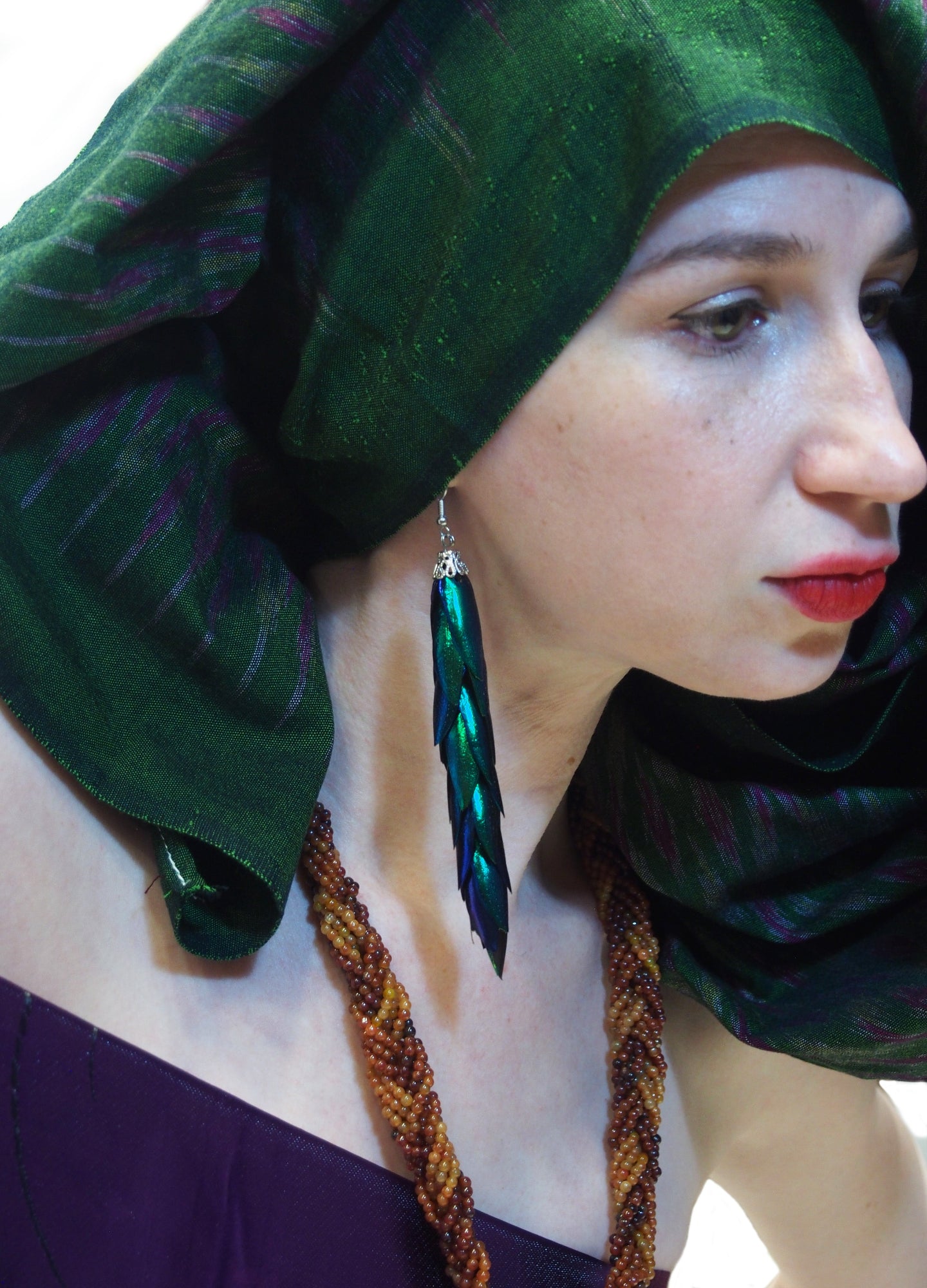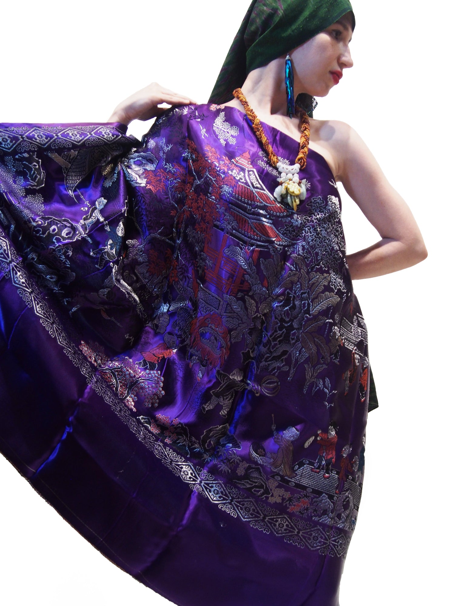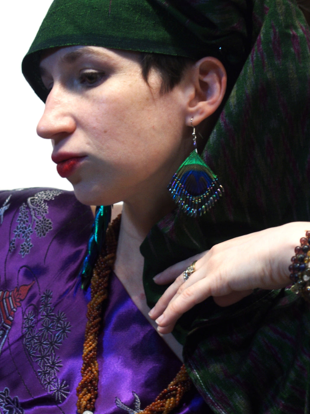 Ensemble 3: Chinese Wall Hanging and Indonesian Sarong with Peacock Feather Earrings and Jade Necklace - Each Item Sold Separately