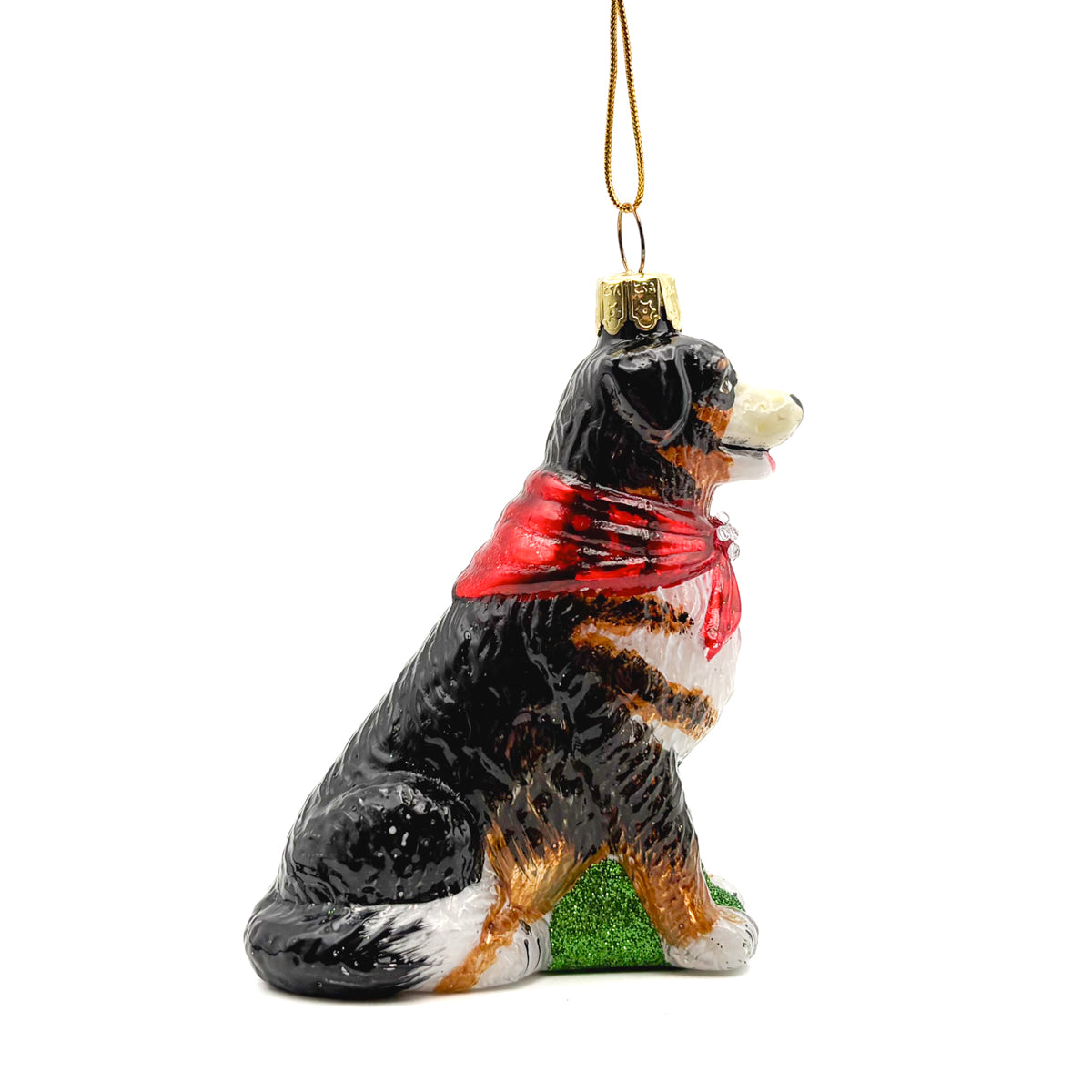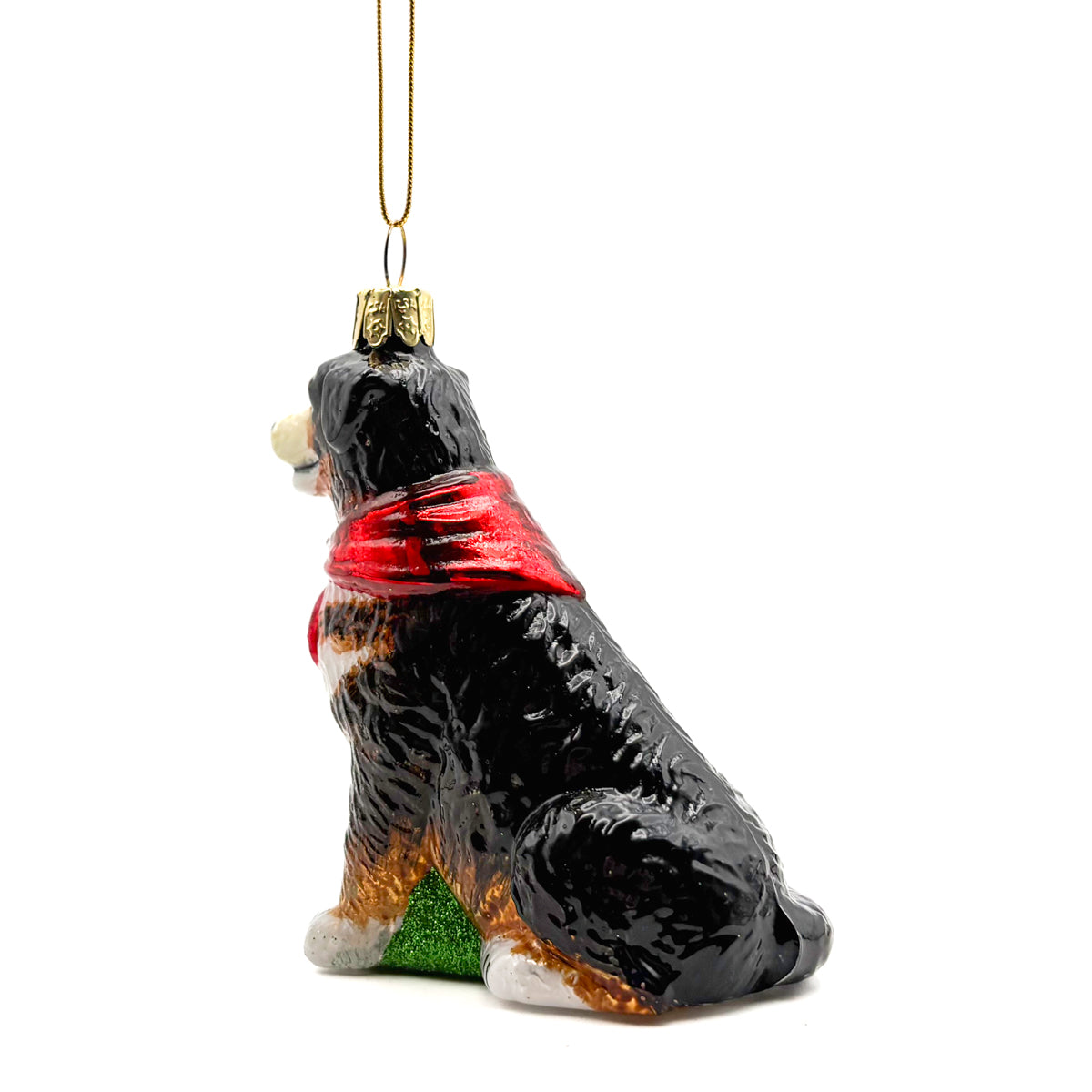 • This ornament features a Bernese Mountain Dog wearing a festive red scarf with rhinestone accents.