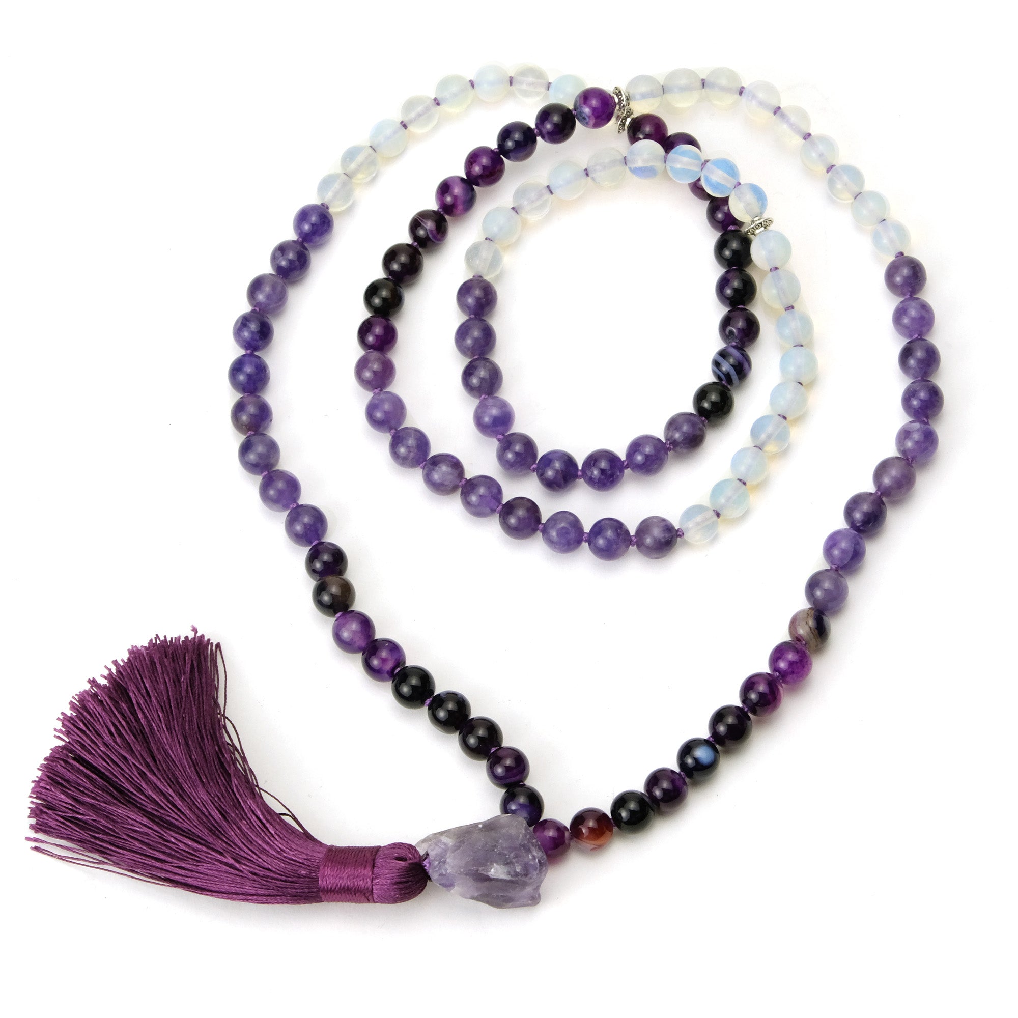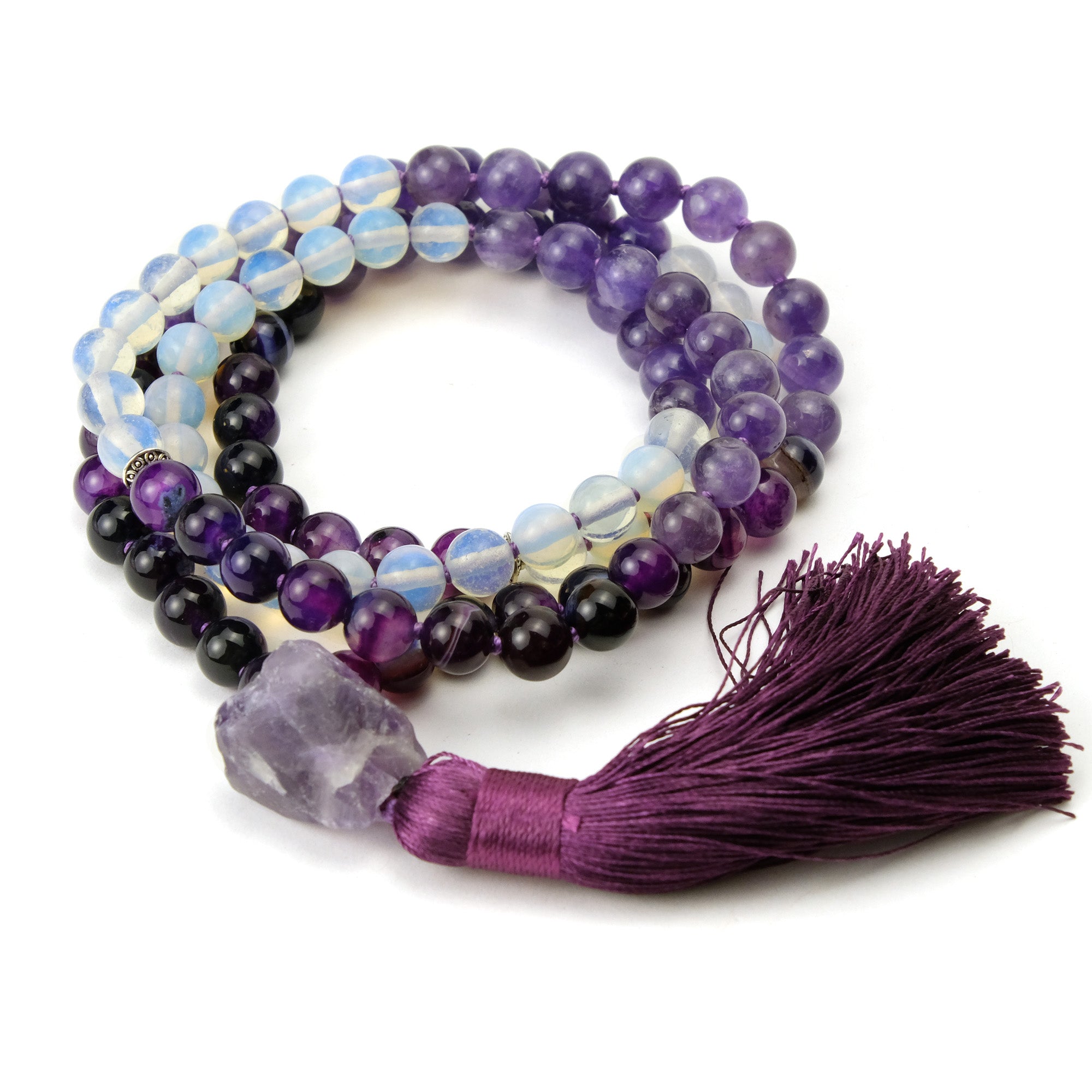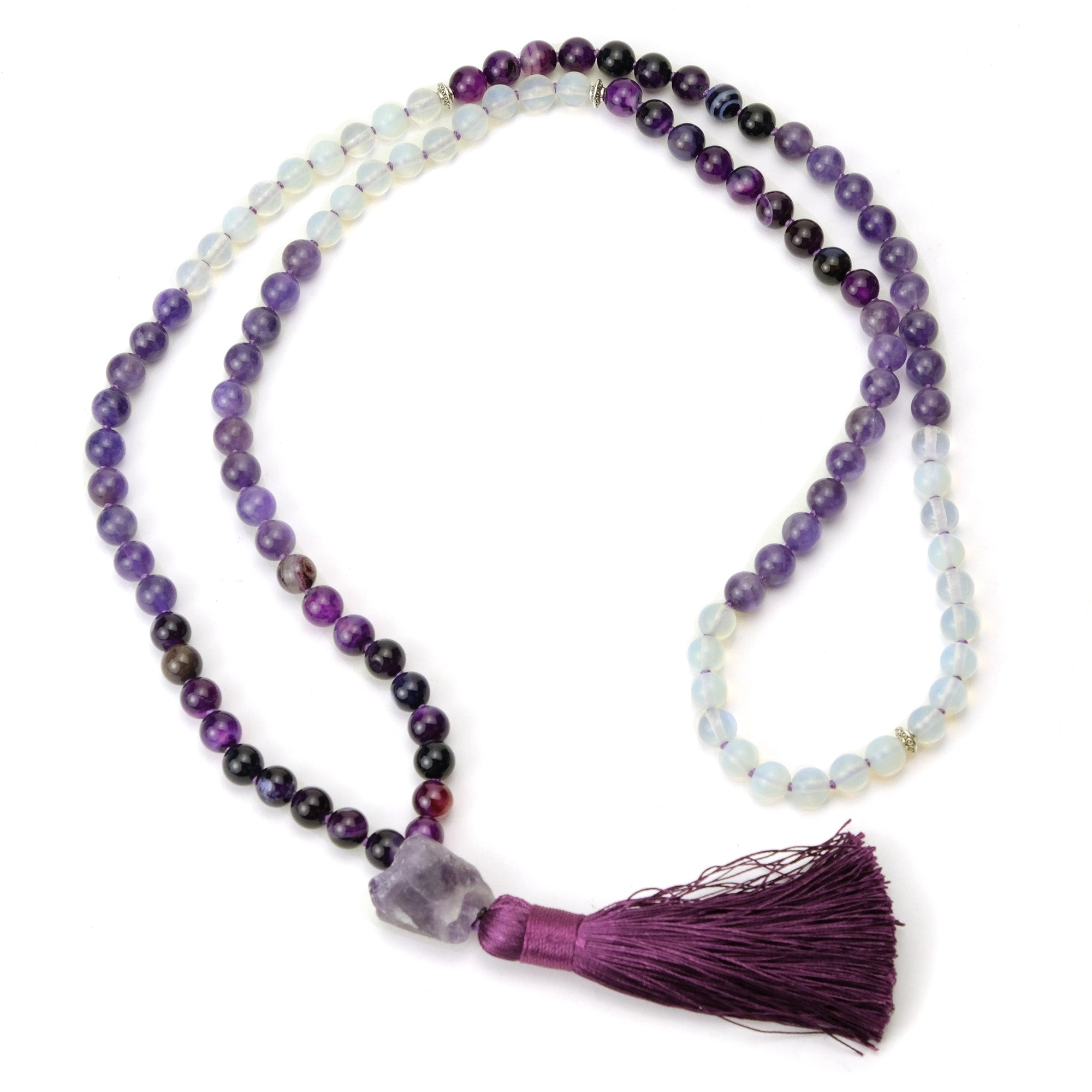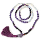 Amethyst, Fluorite and Opalite 8mm Knotted Mala with Silk Tassel #98