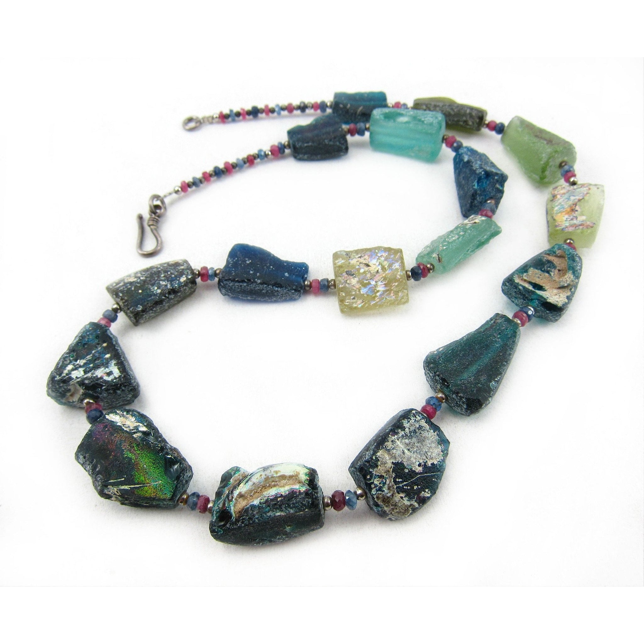 Antique Excavated Afghan Glass Bead Necklace with Faceted Ruby and Sapphire Accent Beads