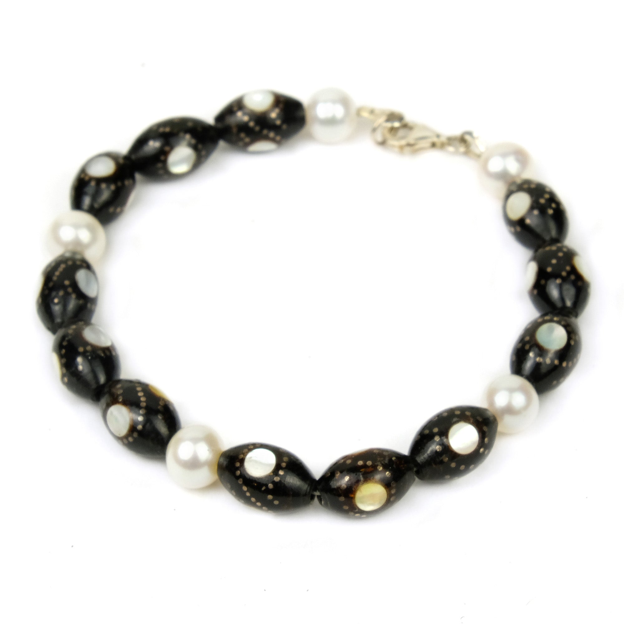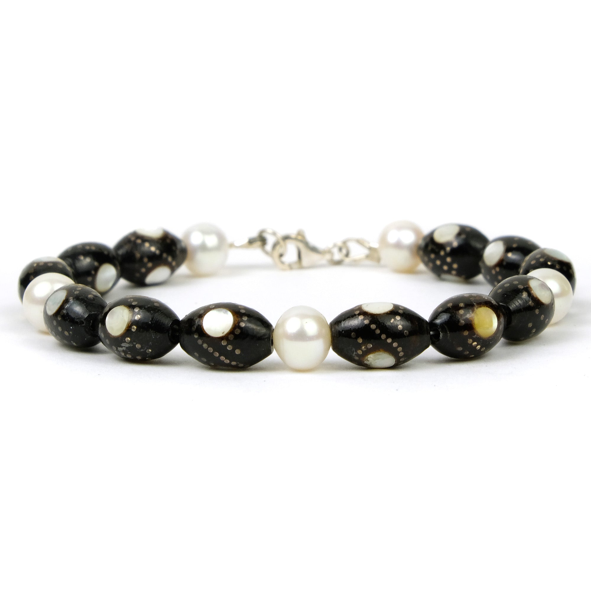 Black Coral and Hand Inlaid Silver and Mother of Pearl Bracelet with Sterling Silver Trigger Clasp