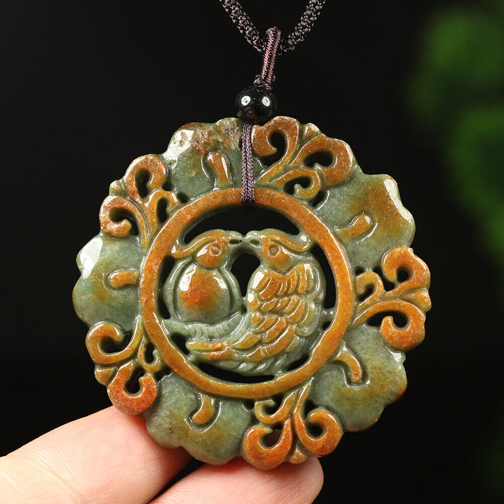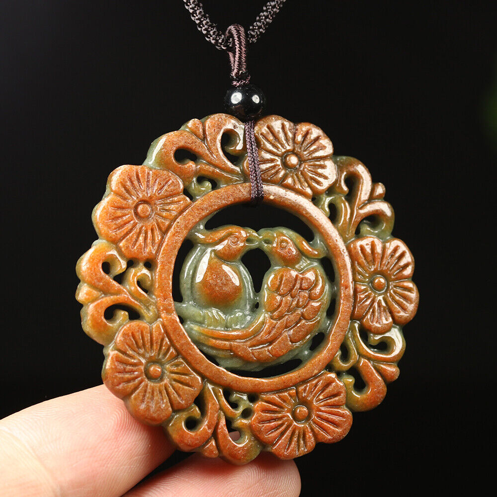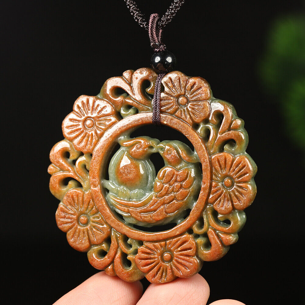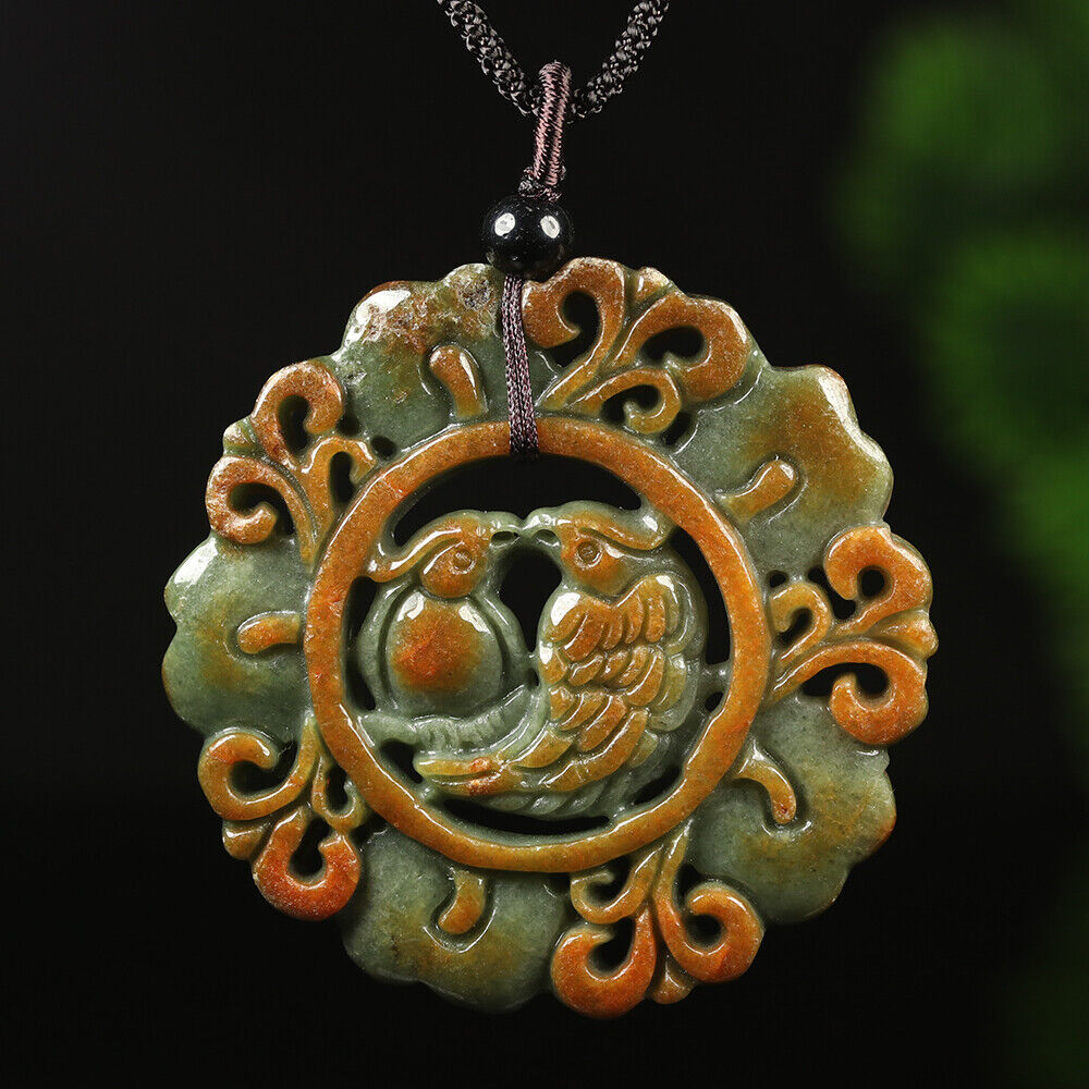 Certified Grade A Red Green Natural Jadeite Jade Pendant Birds Flower Necklace
