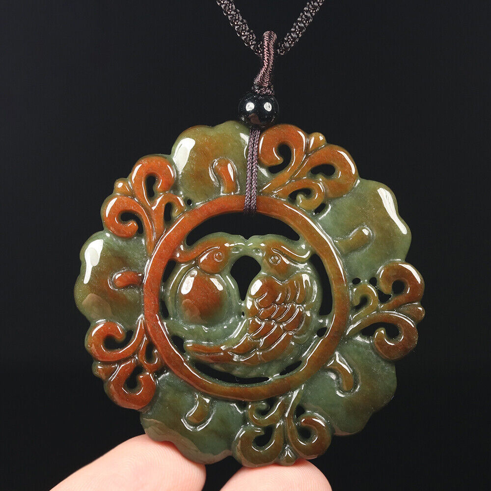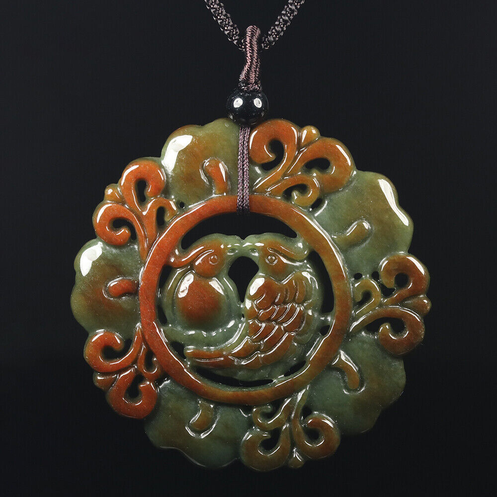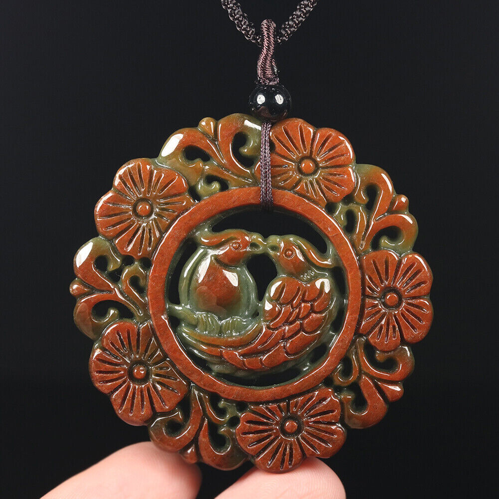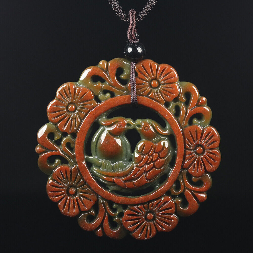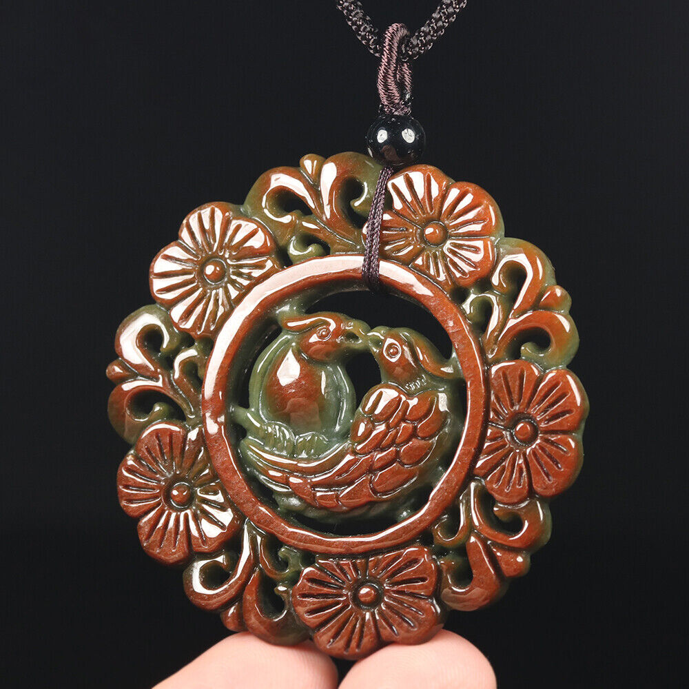 Certified Grade A Red Green Natural Jadeite Jade Pendant Flower Birds