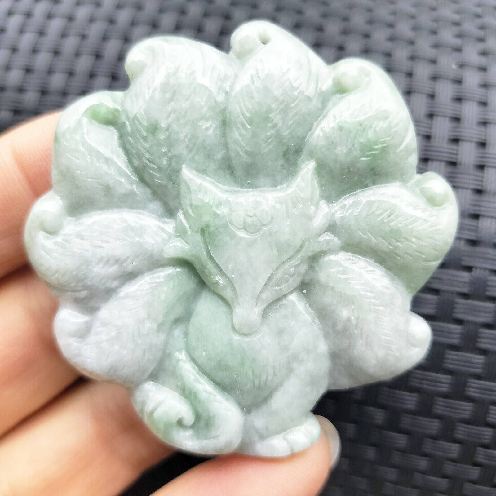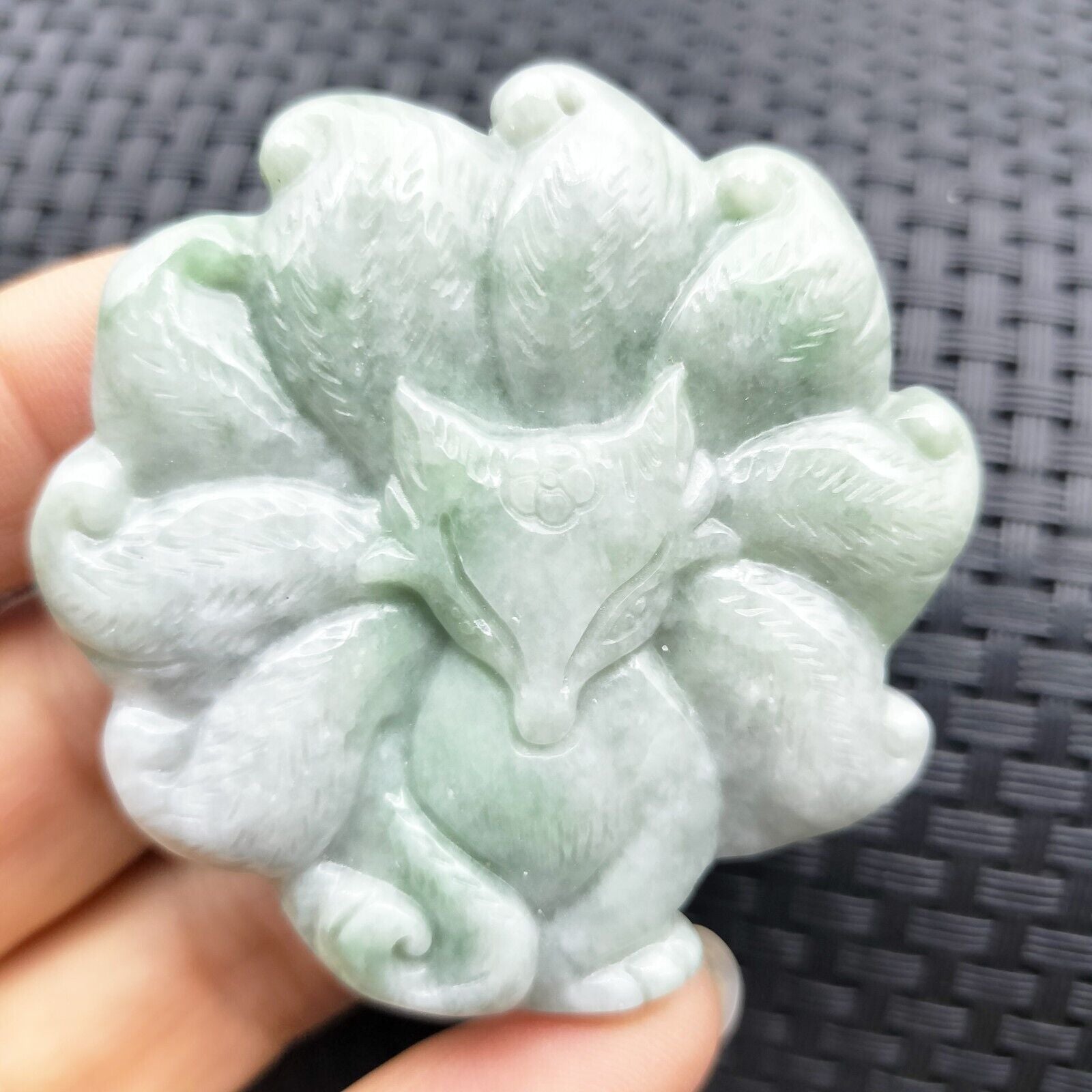 Certified Green Natural Type A Jade Jadeite Carved Nine-Tailed Fox Pendant