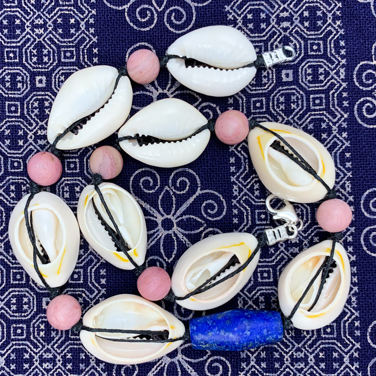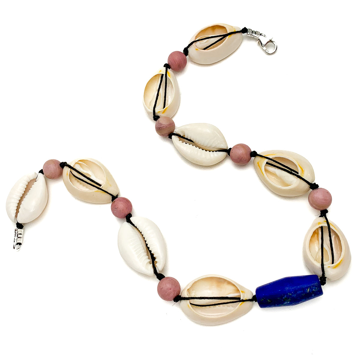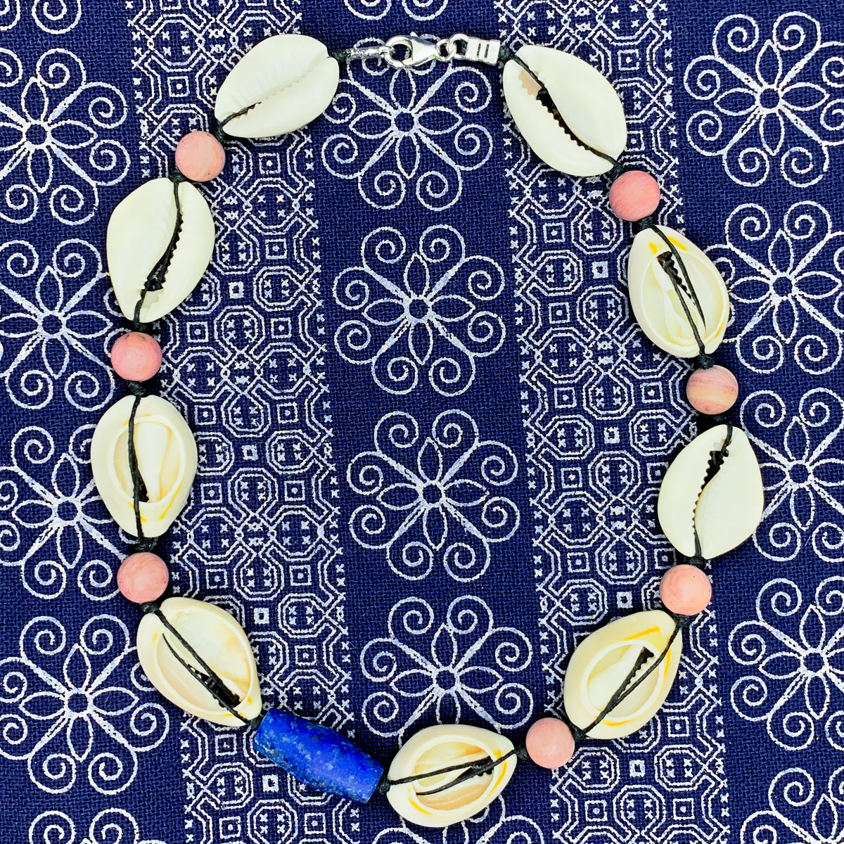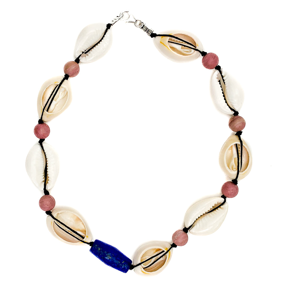 Cowrie Shell, Lapis Lazuli and Thulite Choker Necklace With Sterling Silver Trigger Clasp