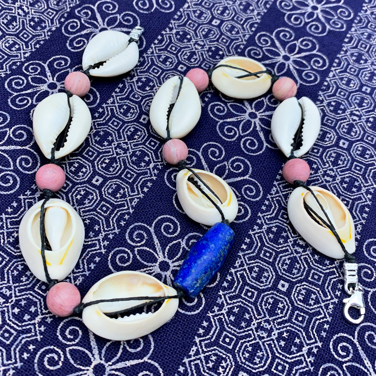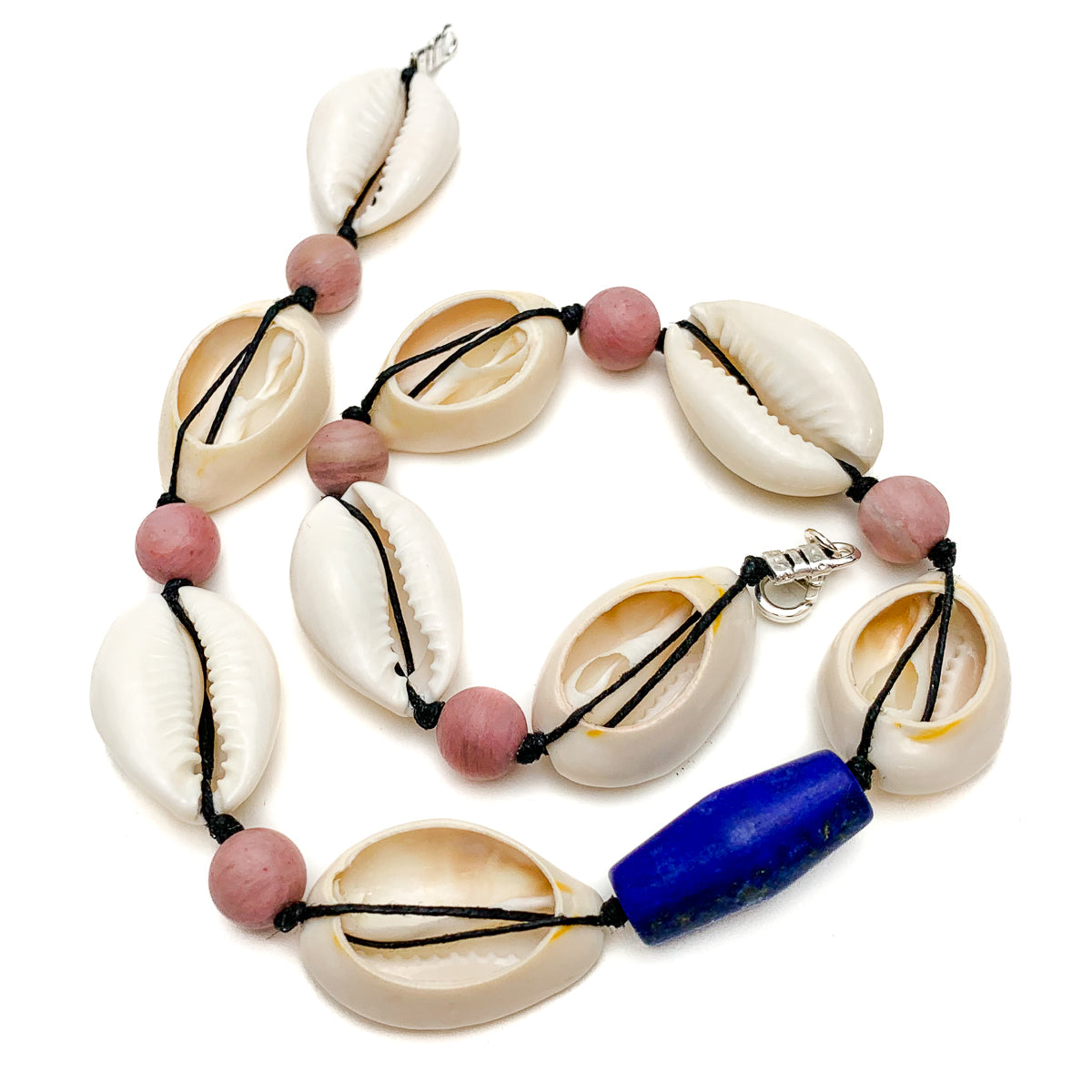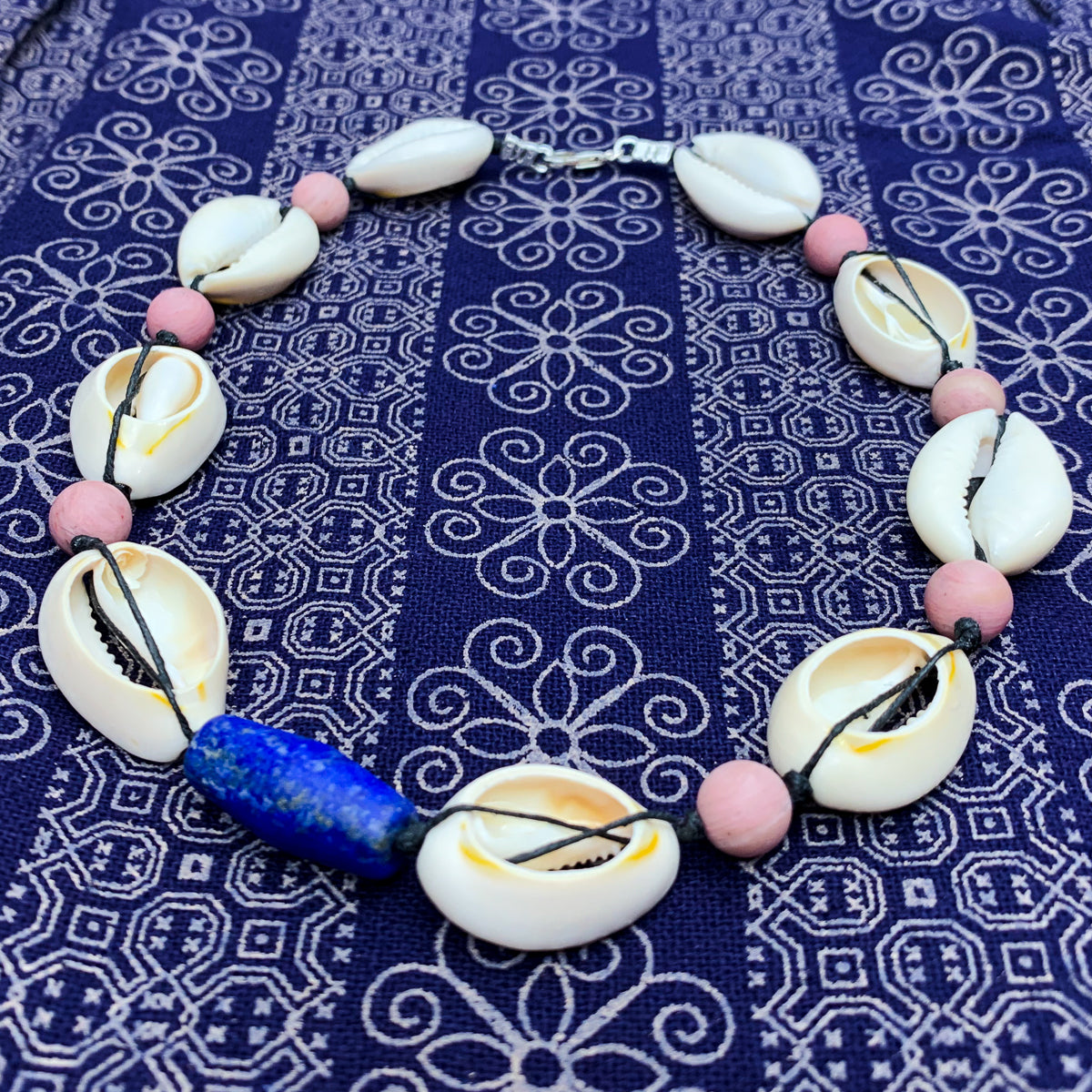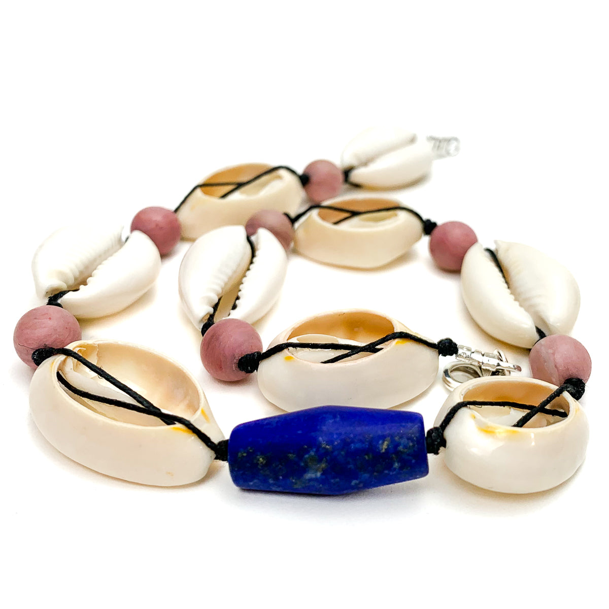 Cowrie Shell, Lapis Lazuli and Thulite Choker Necklace With Sterling Silver Trigger Clasp