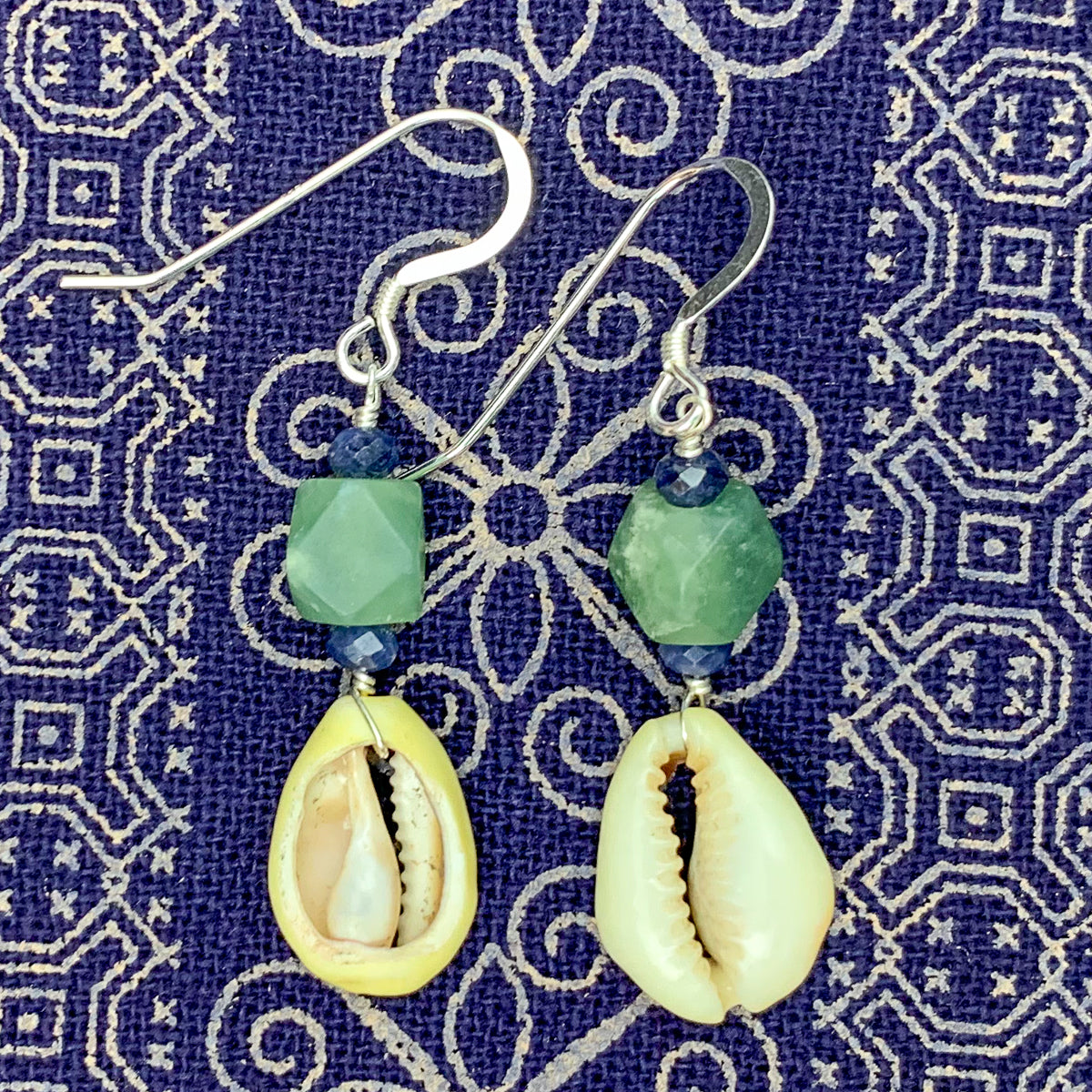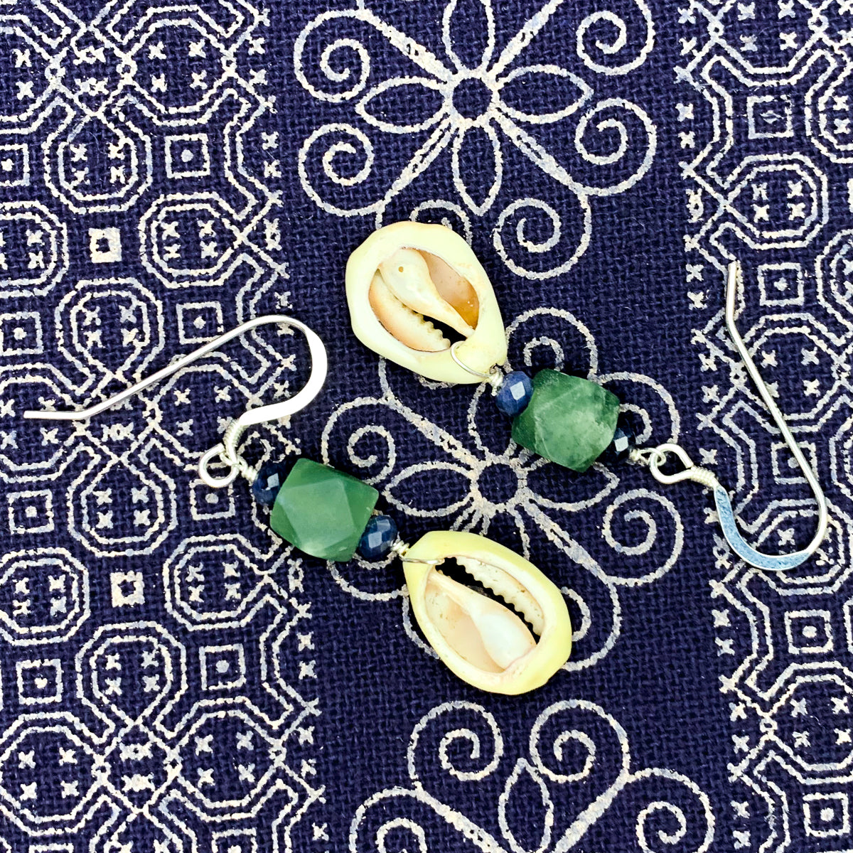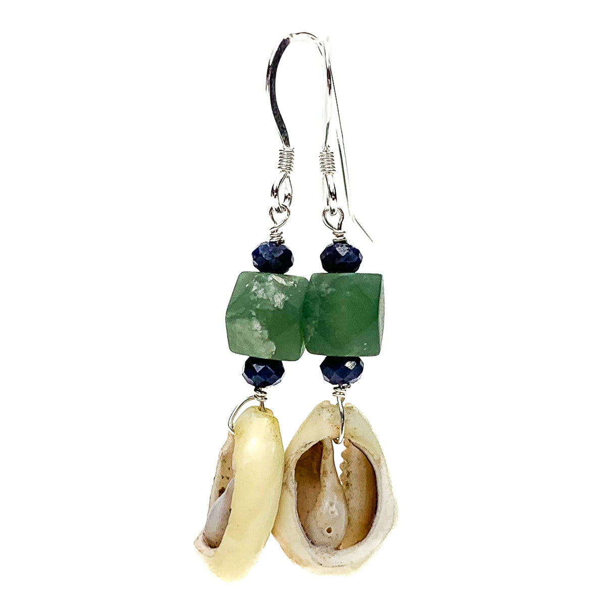 • Cowrie Shell With Serpentine and Sapphire Earrings With Sterling Silver French Wires