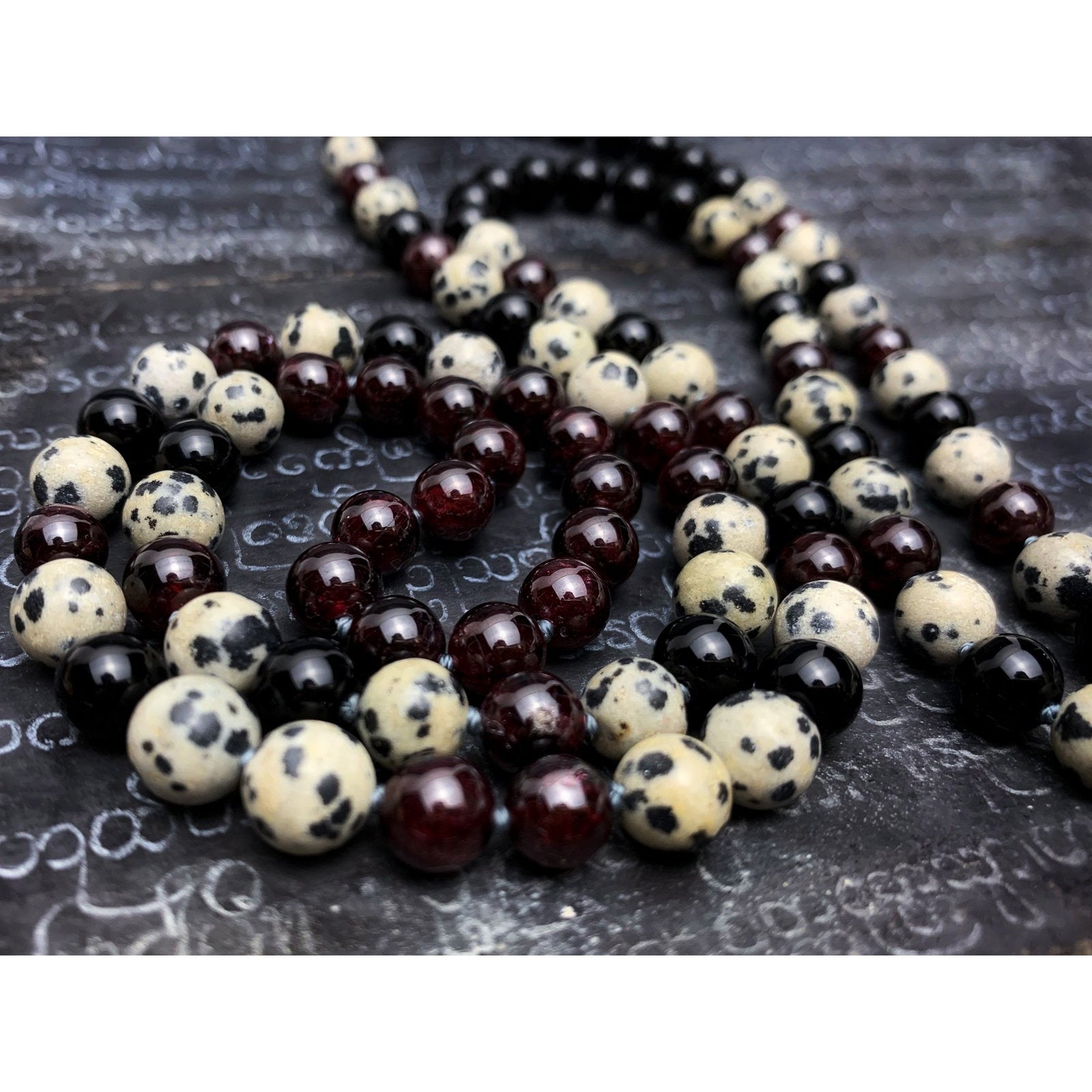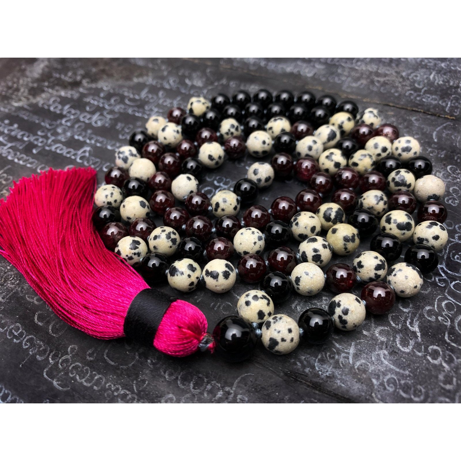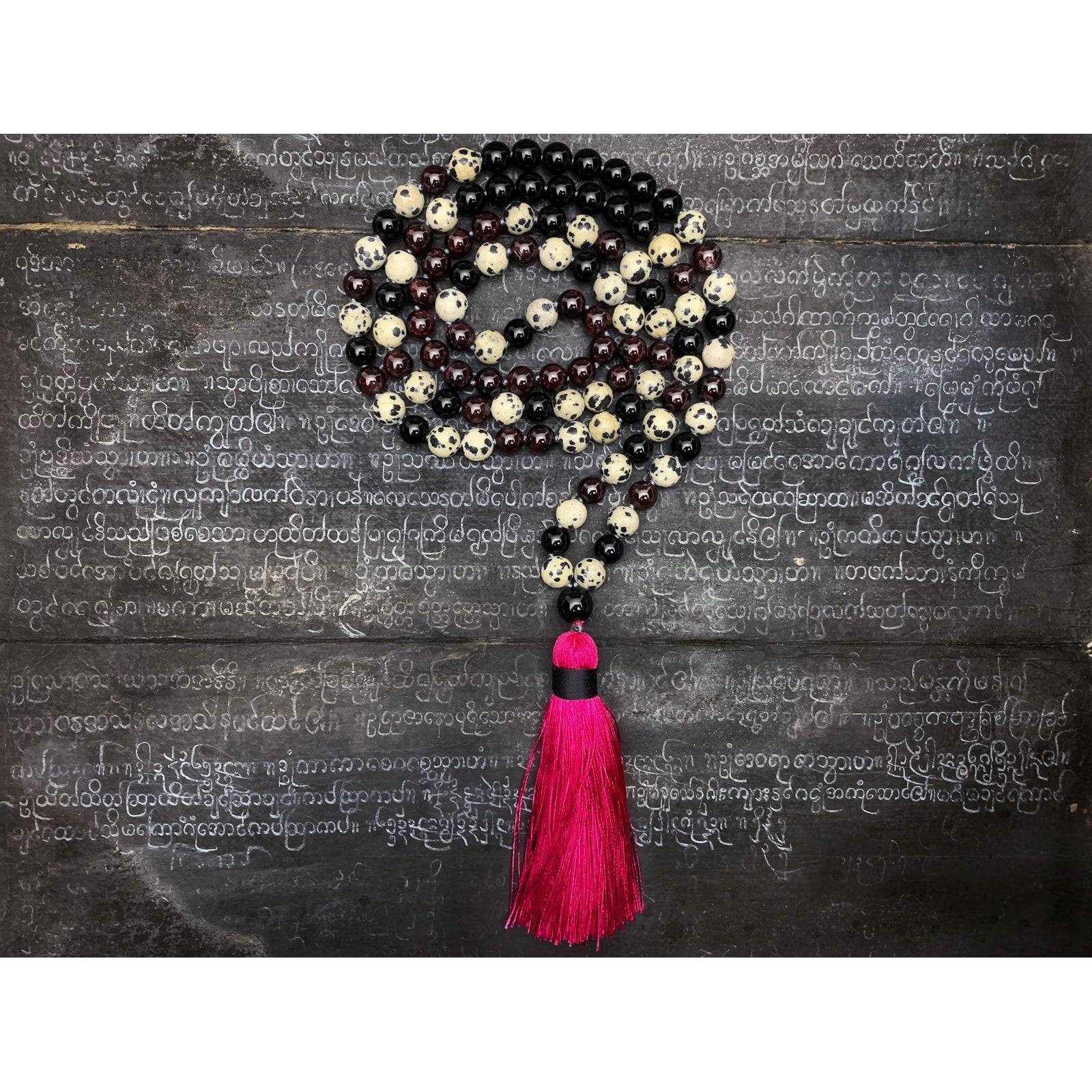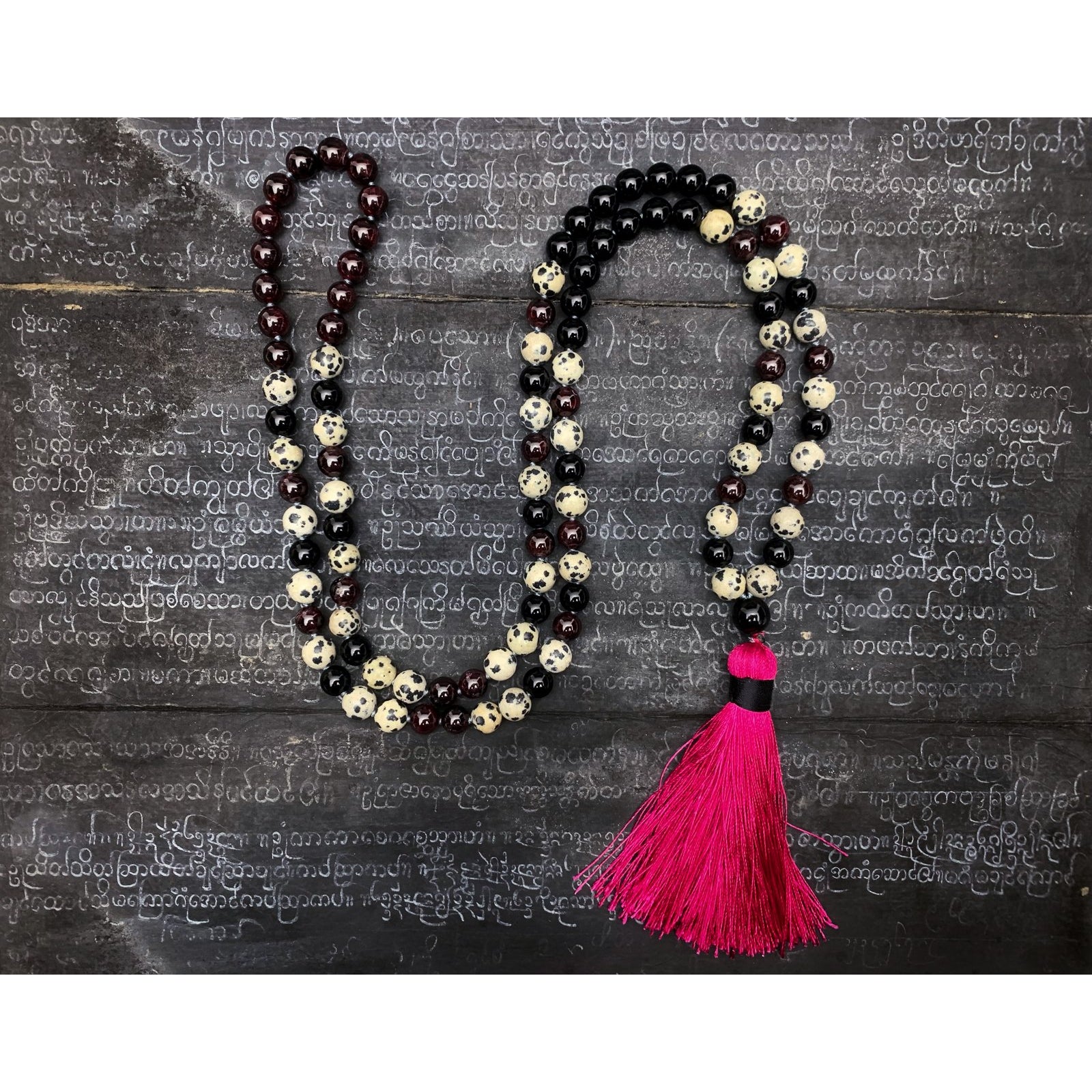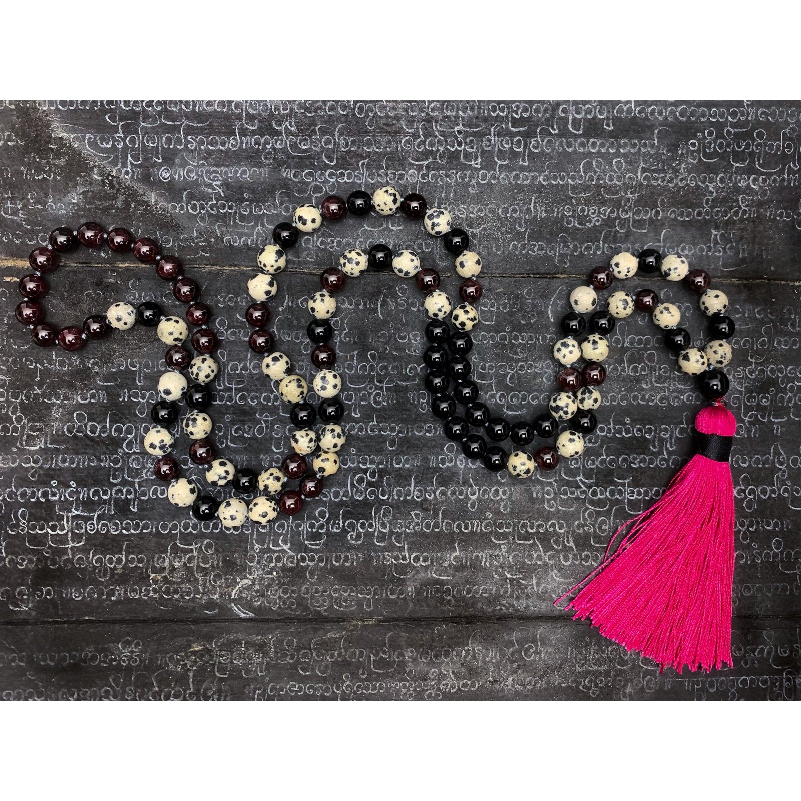 - Garnet, Onyx and Dalmatian Jasper Knotted Mala with Silk Tassel