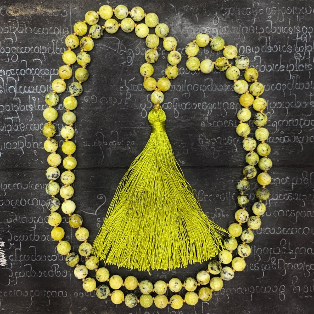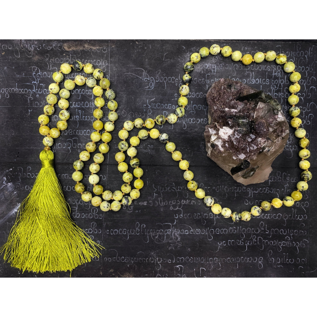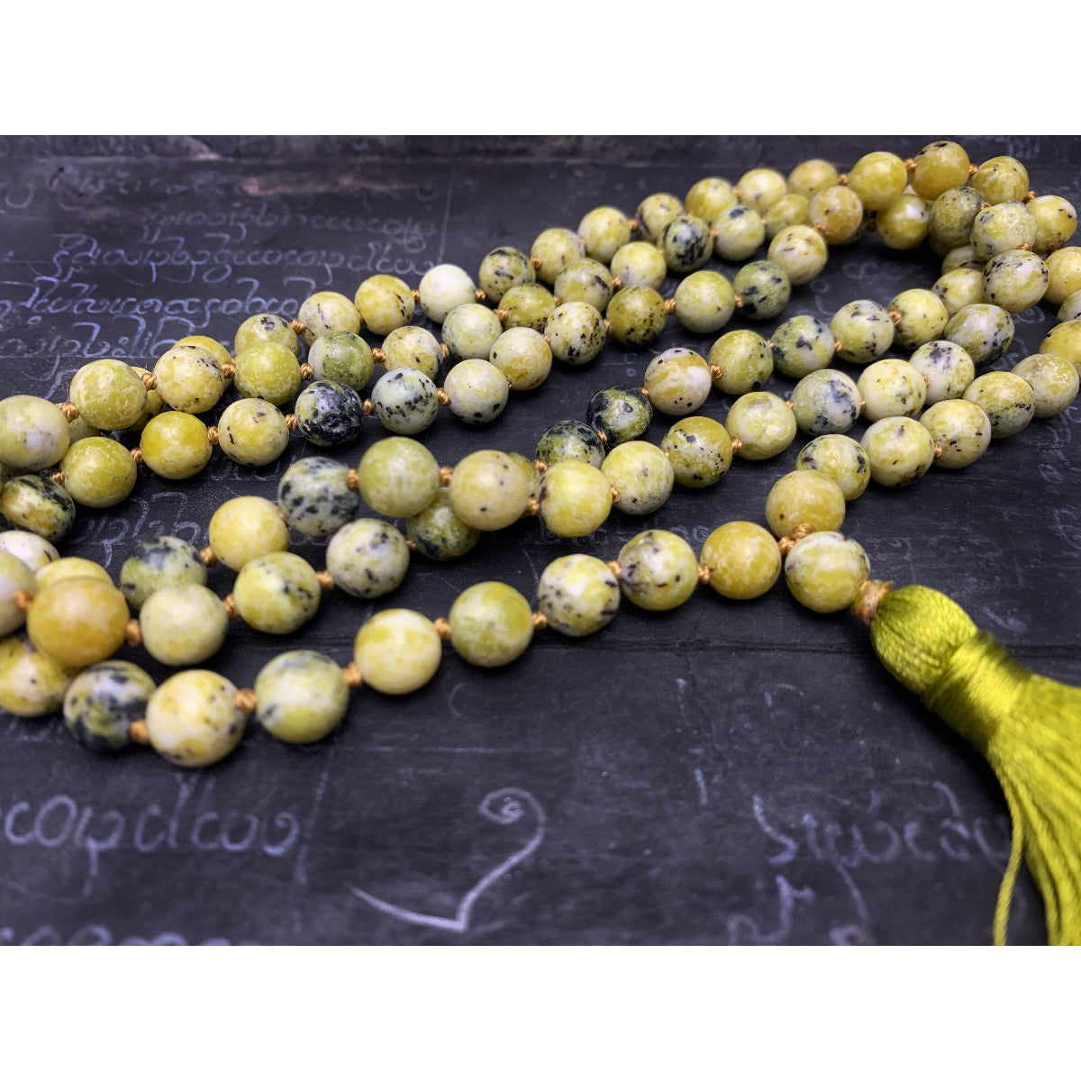Green Serpentine 9mm Knotted Mala with Silk Tassel #113