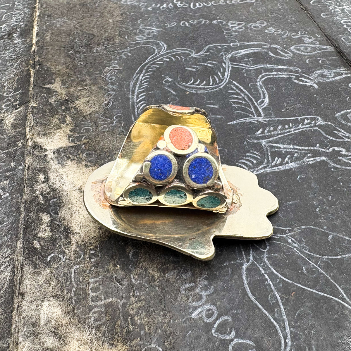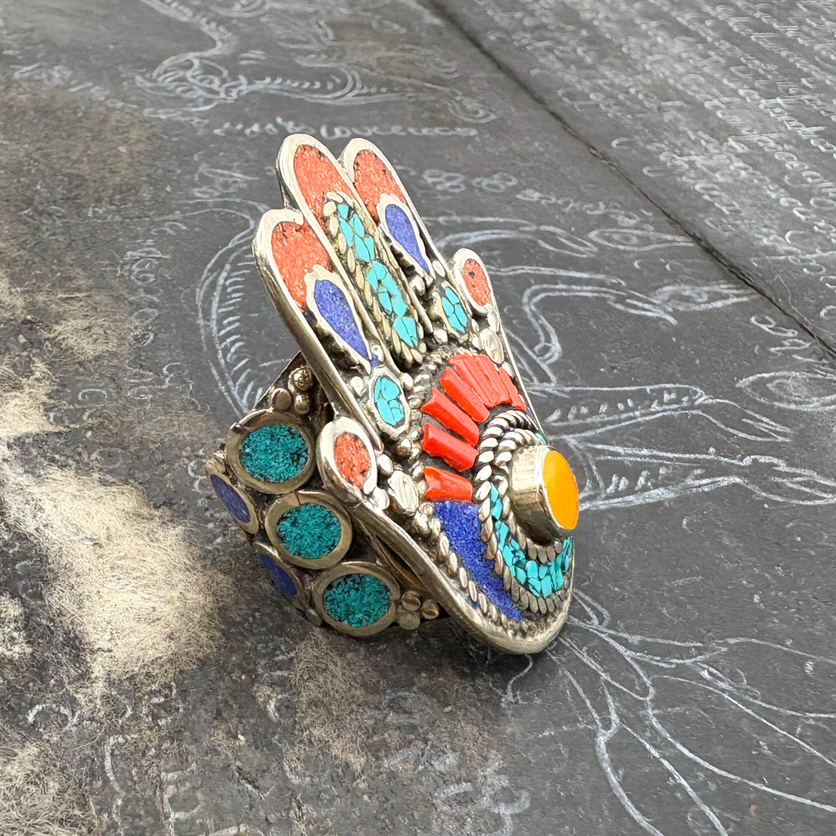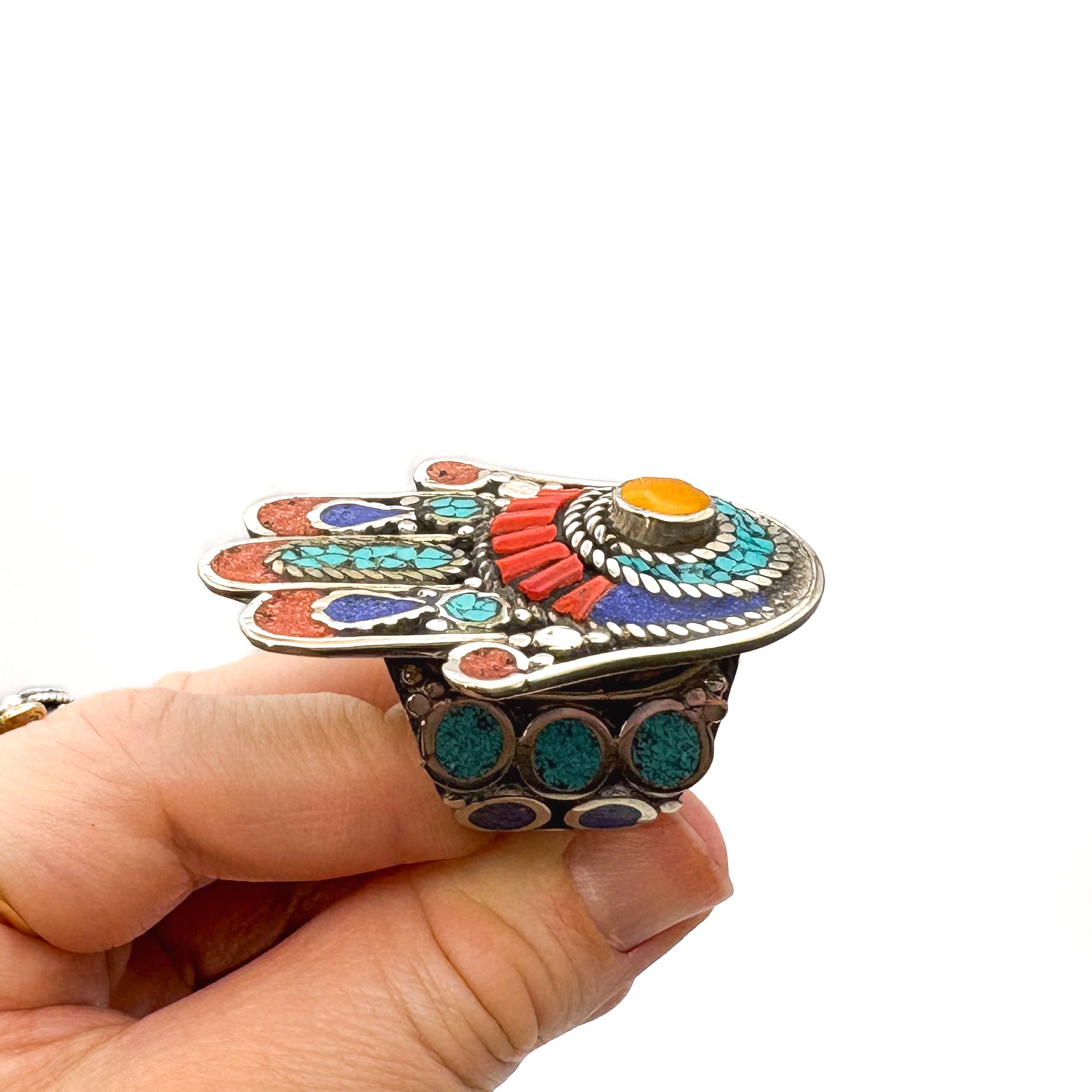 Hamsa Inlaid White Brass Adjustable Ring (A)
