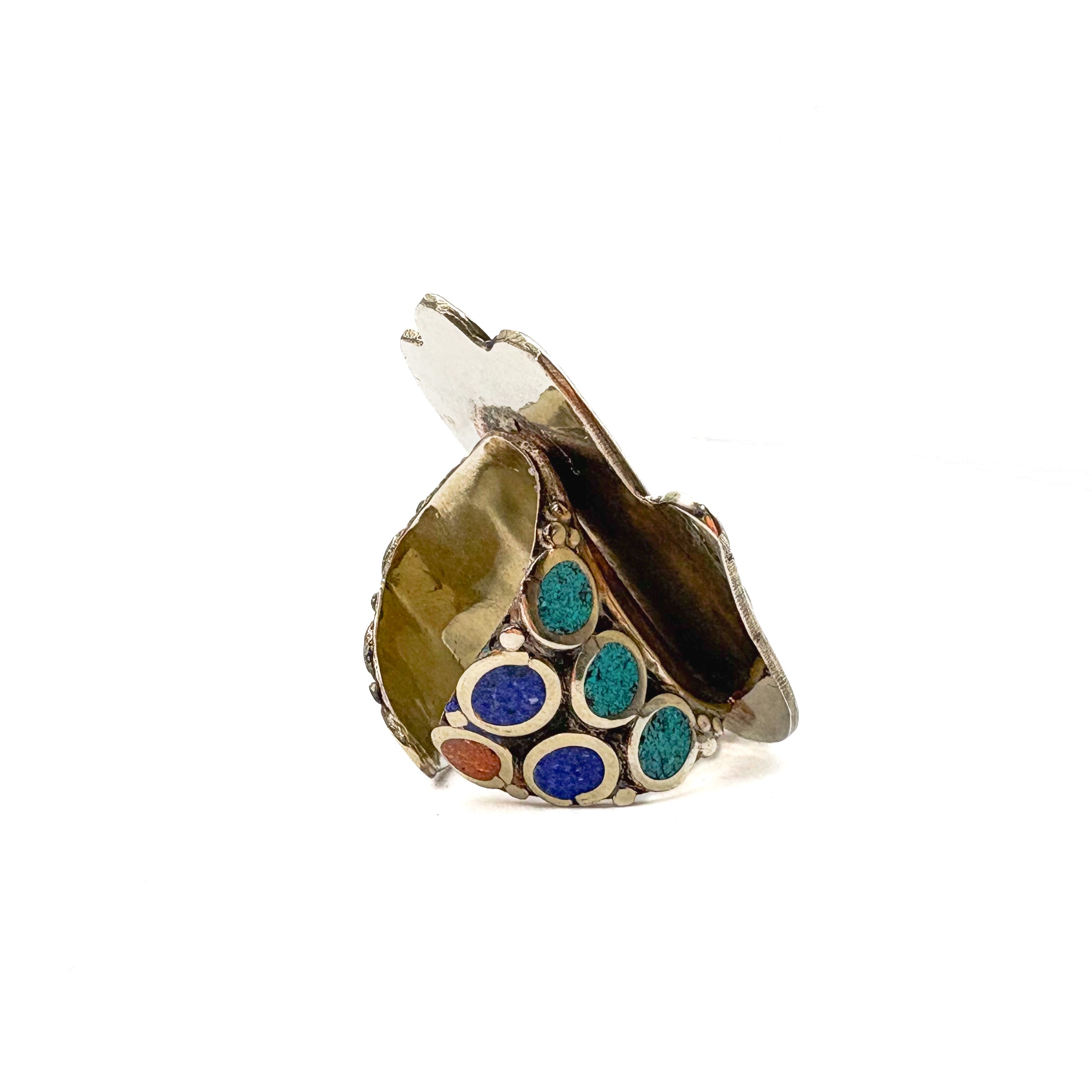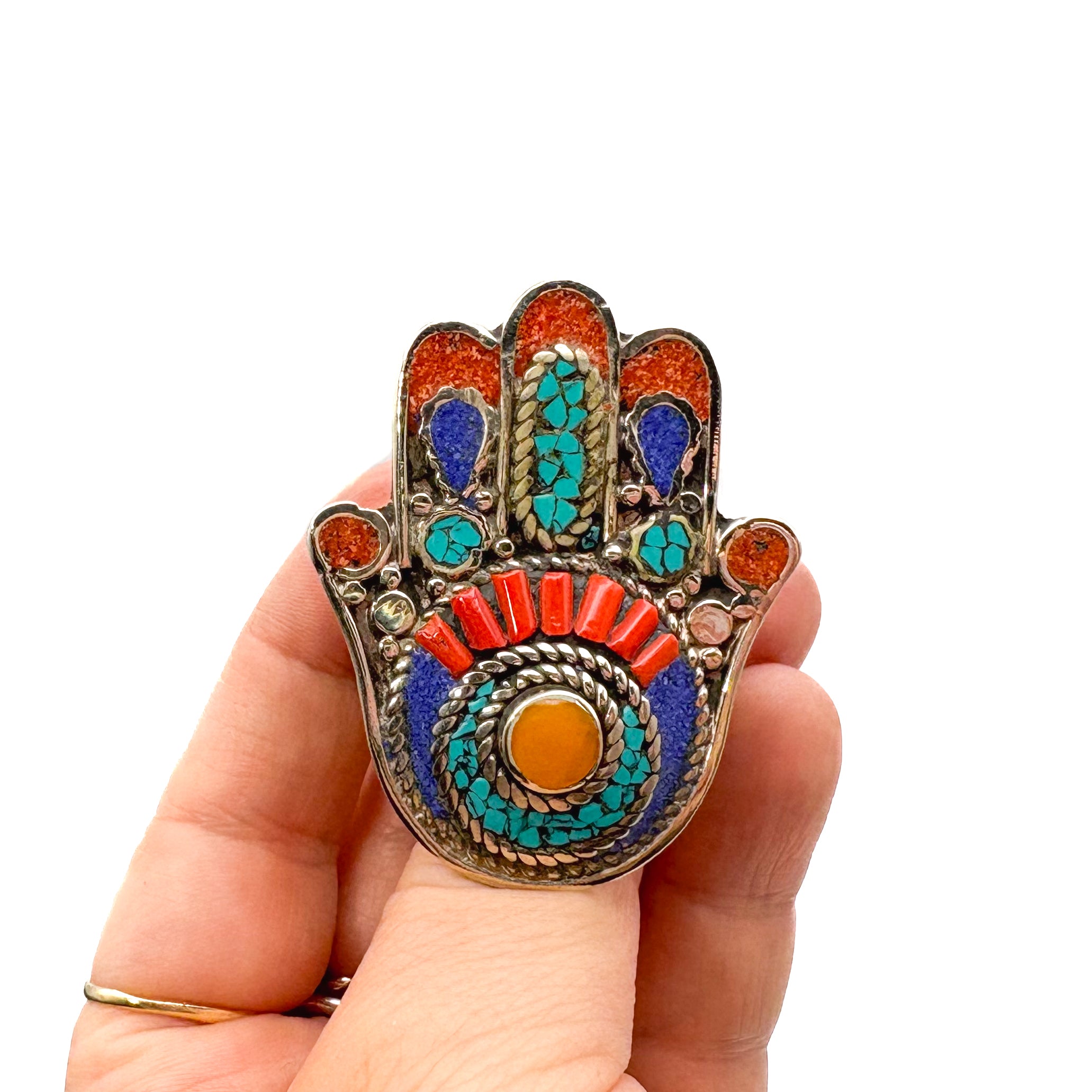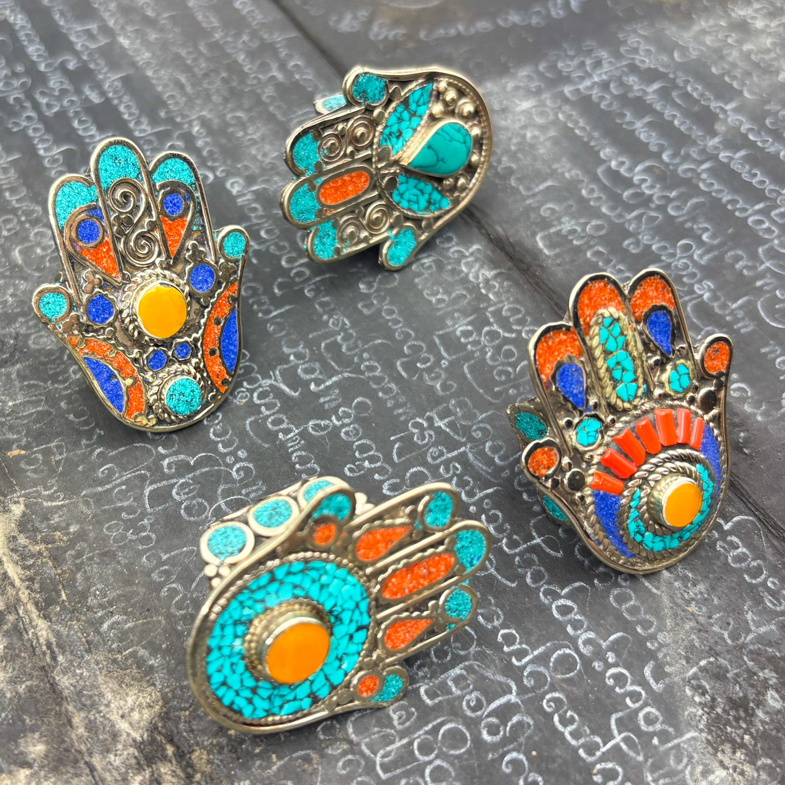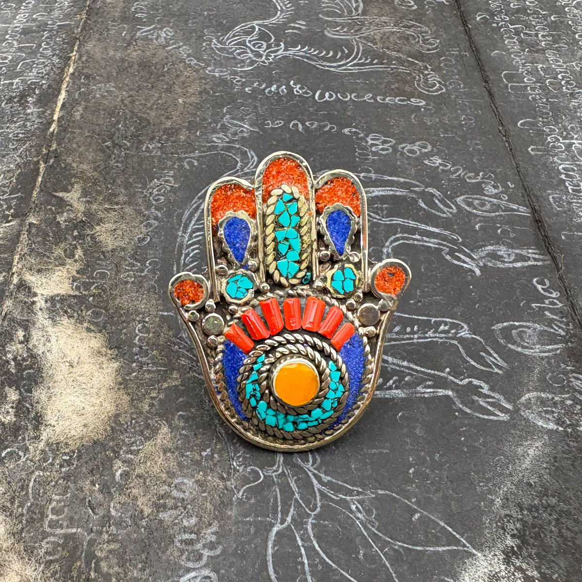 Hamsa Inlaid White Brass Adjustable Ring (A)
