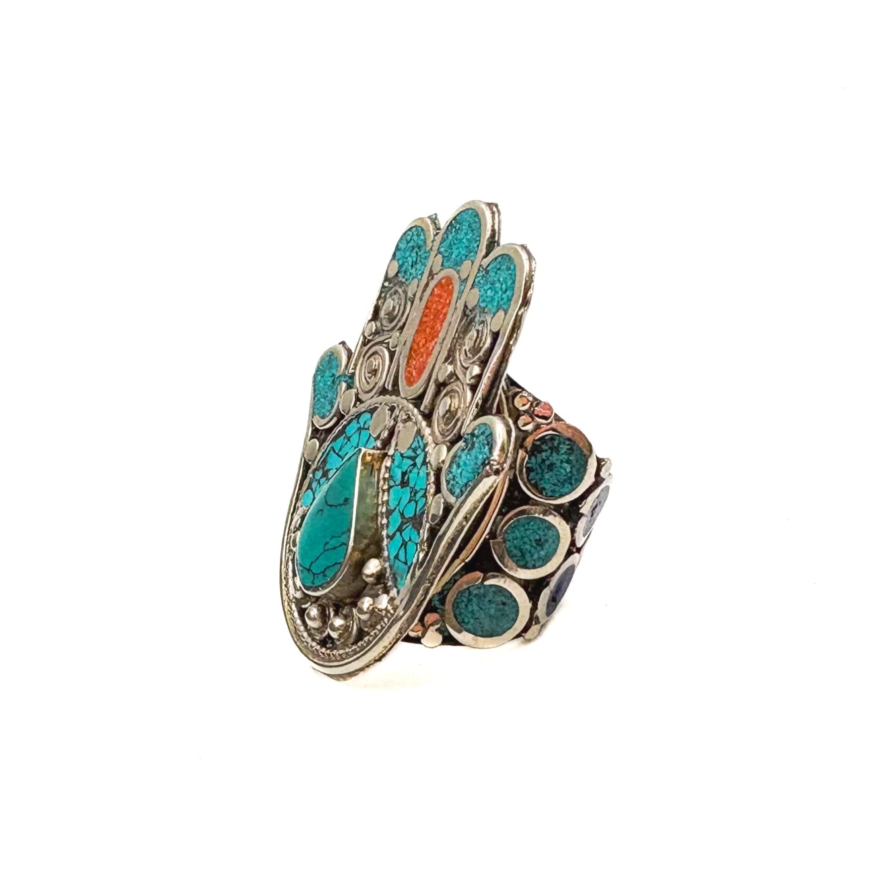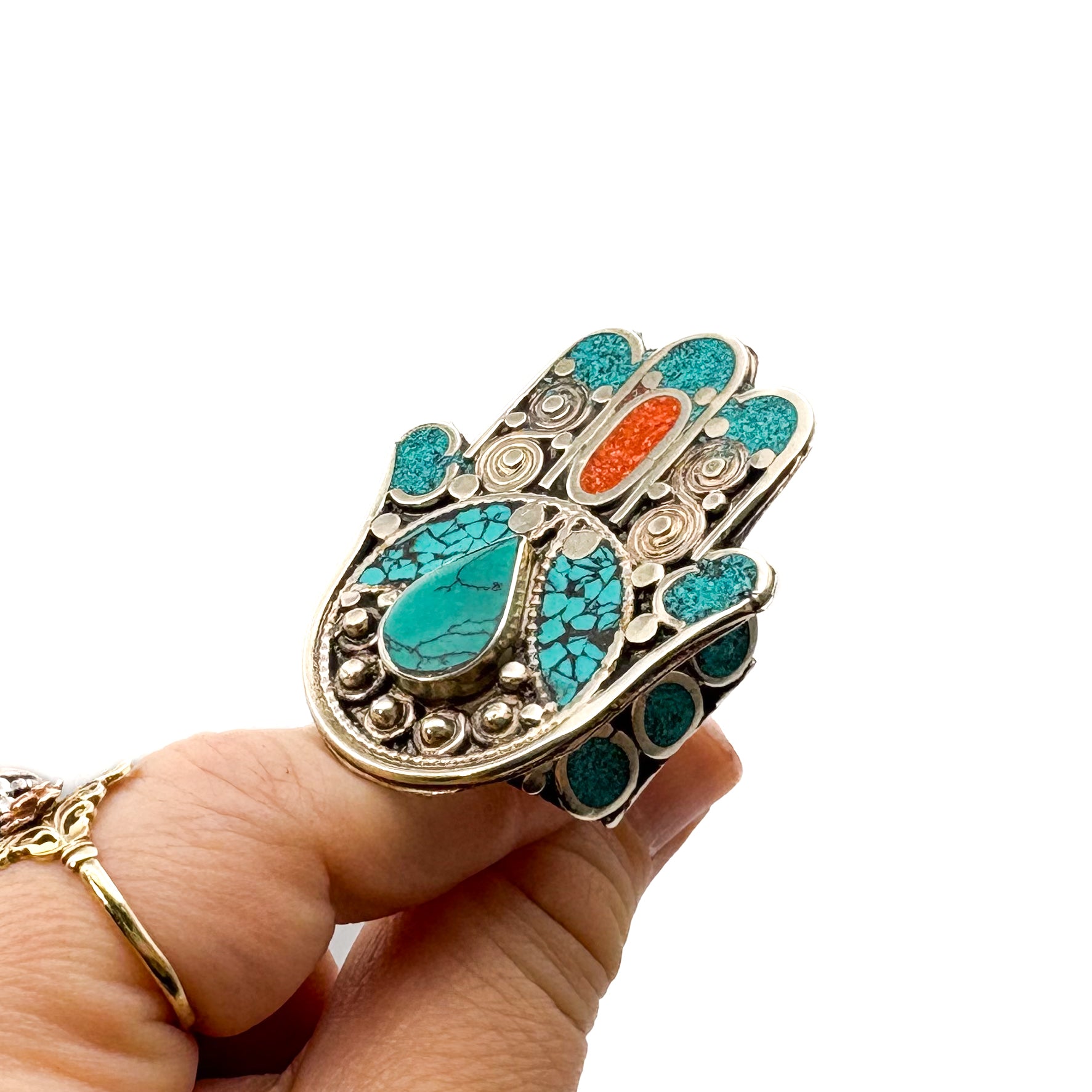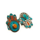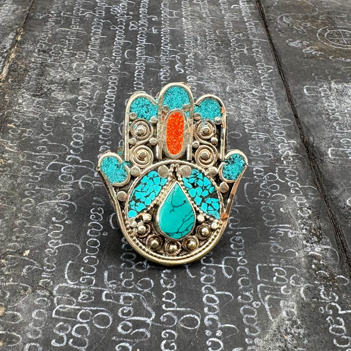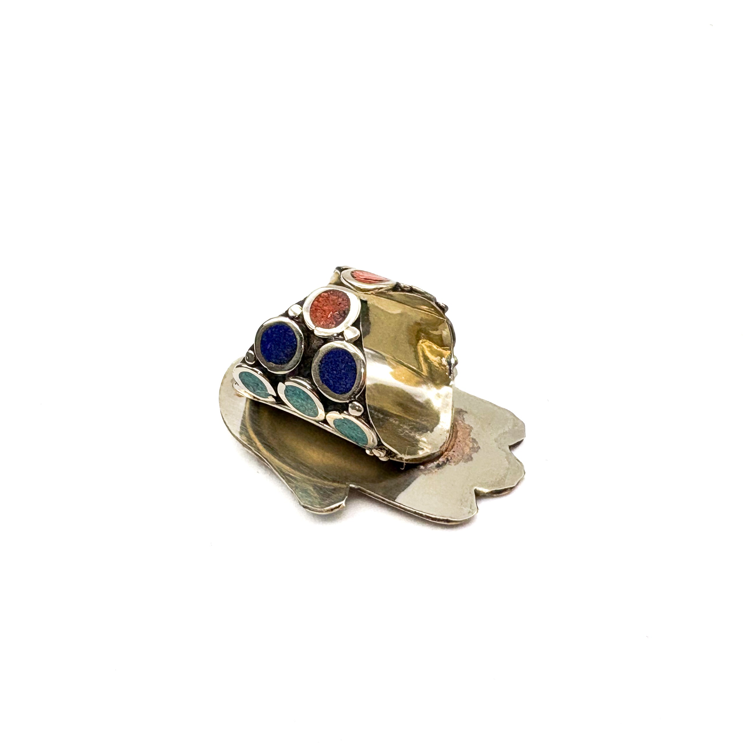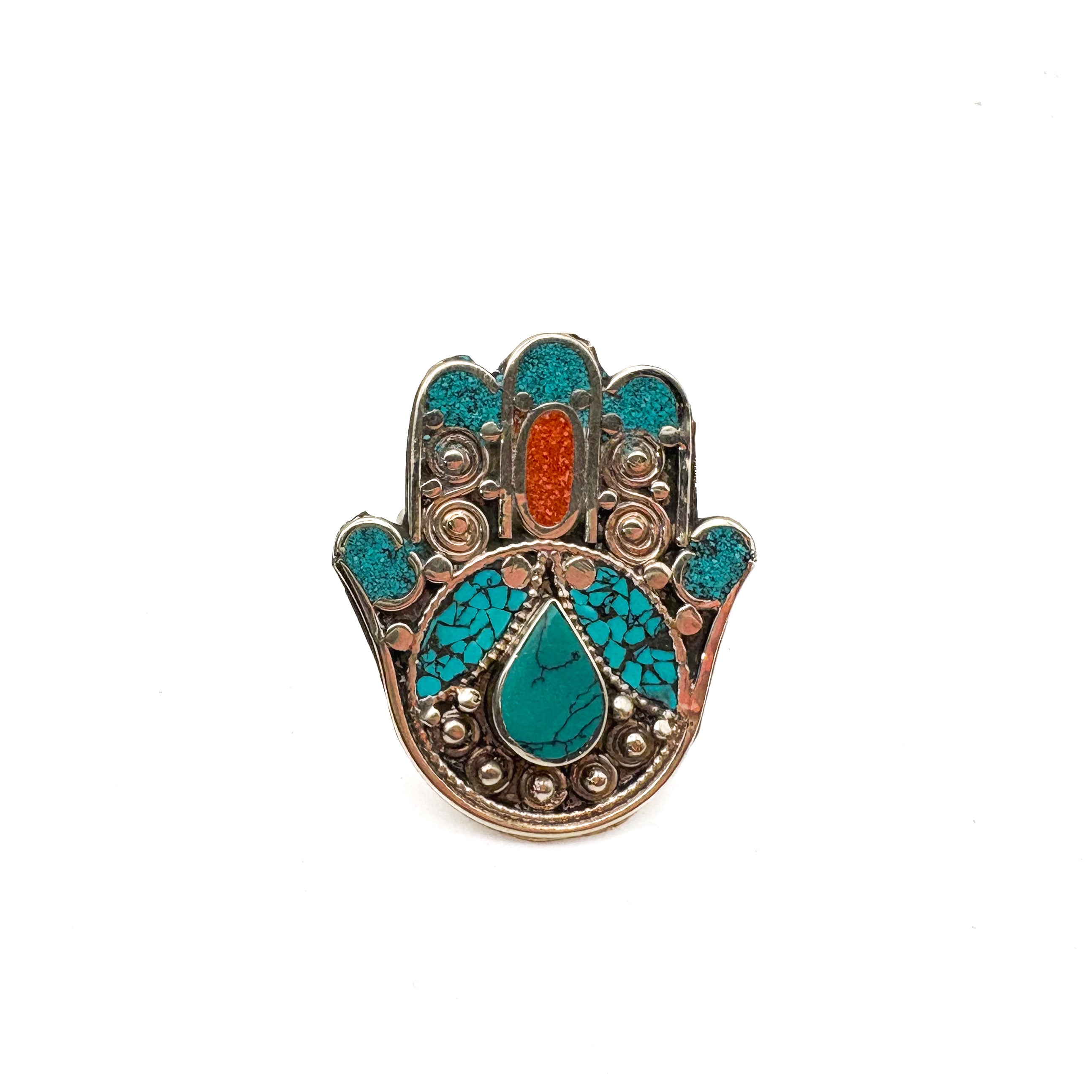 Hamsa Inlaid White Brass Adjustable Ring (C)