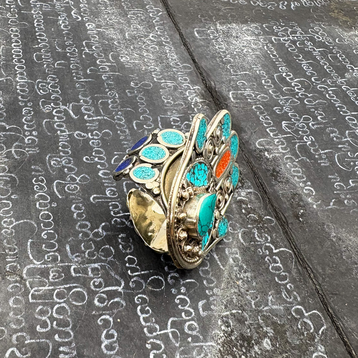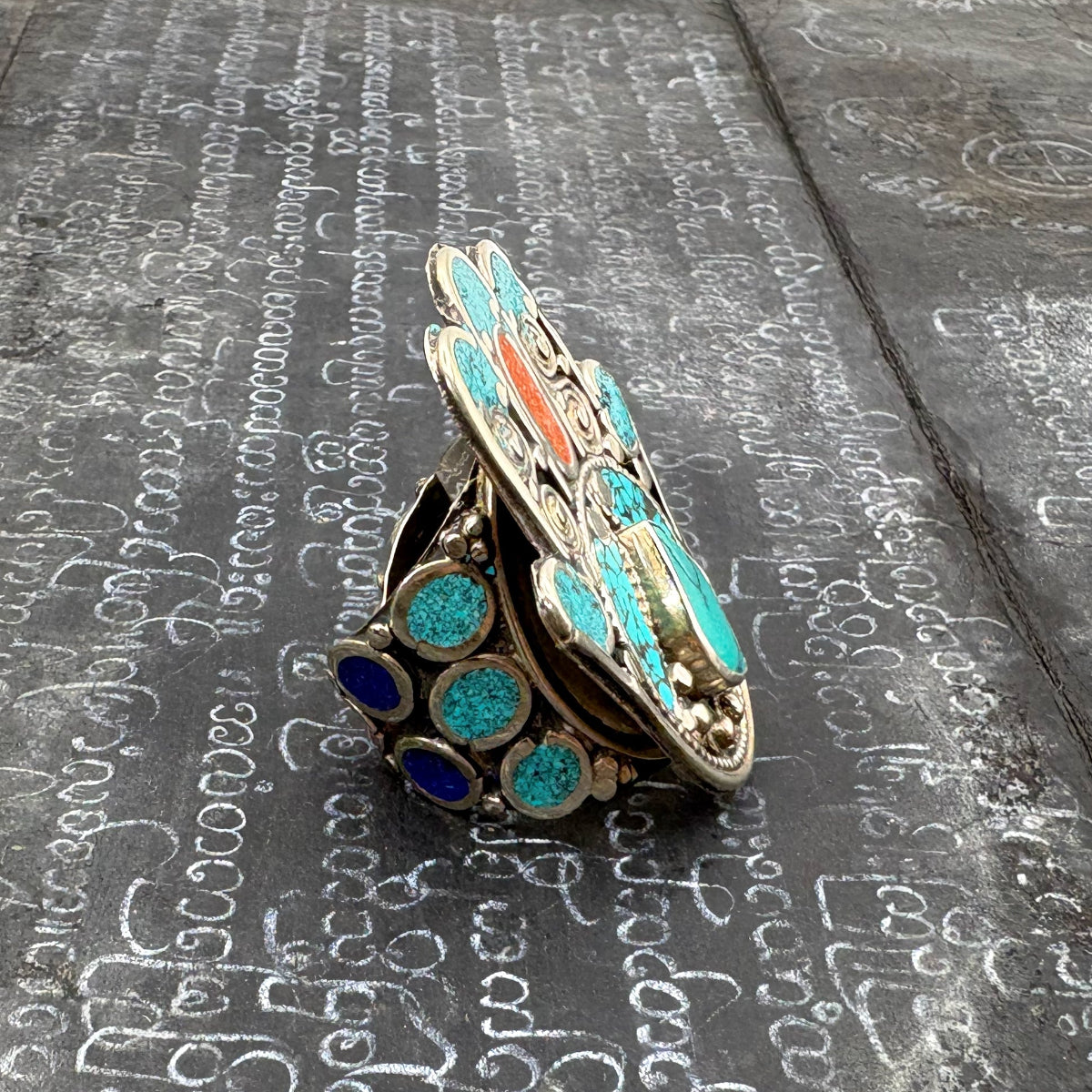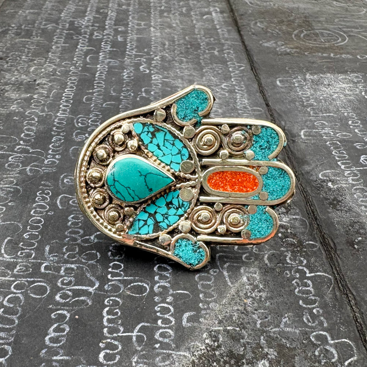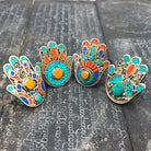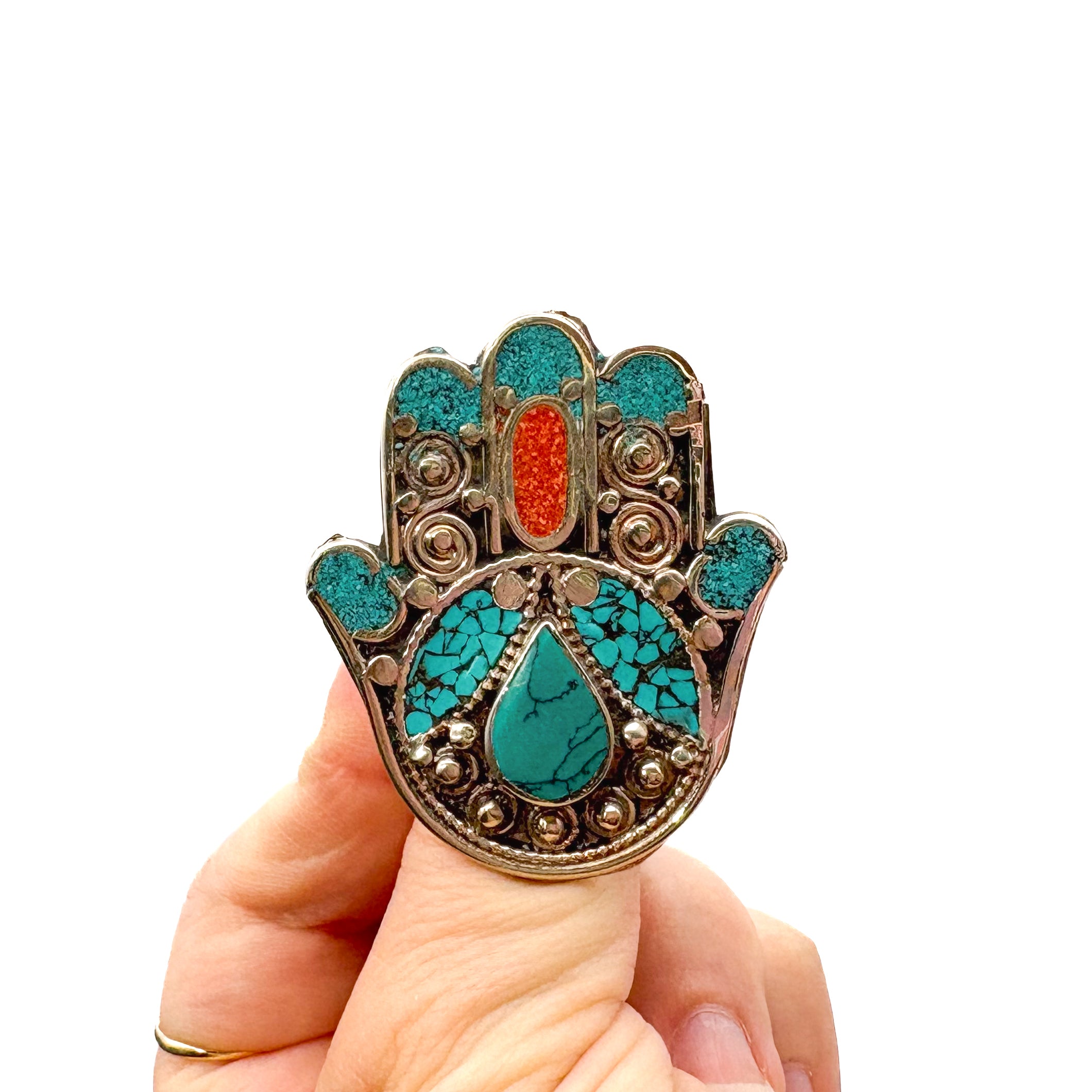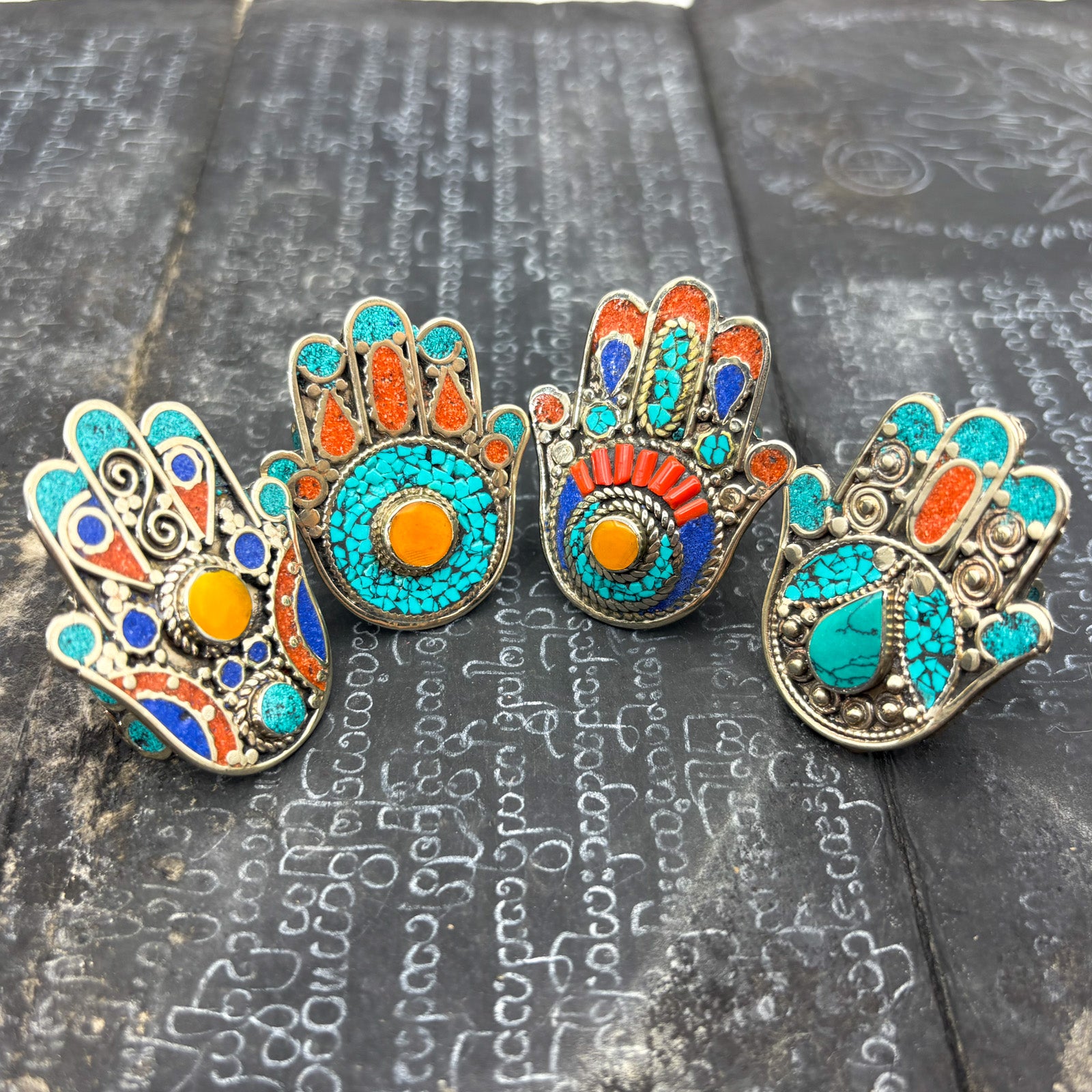 Hamsa Inlaid White Brass Adjustable Ring (C)