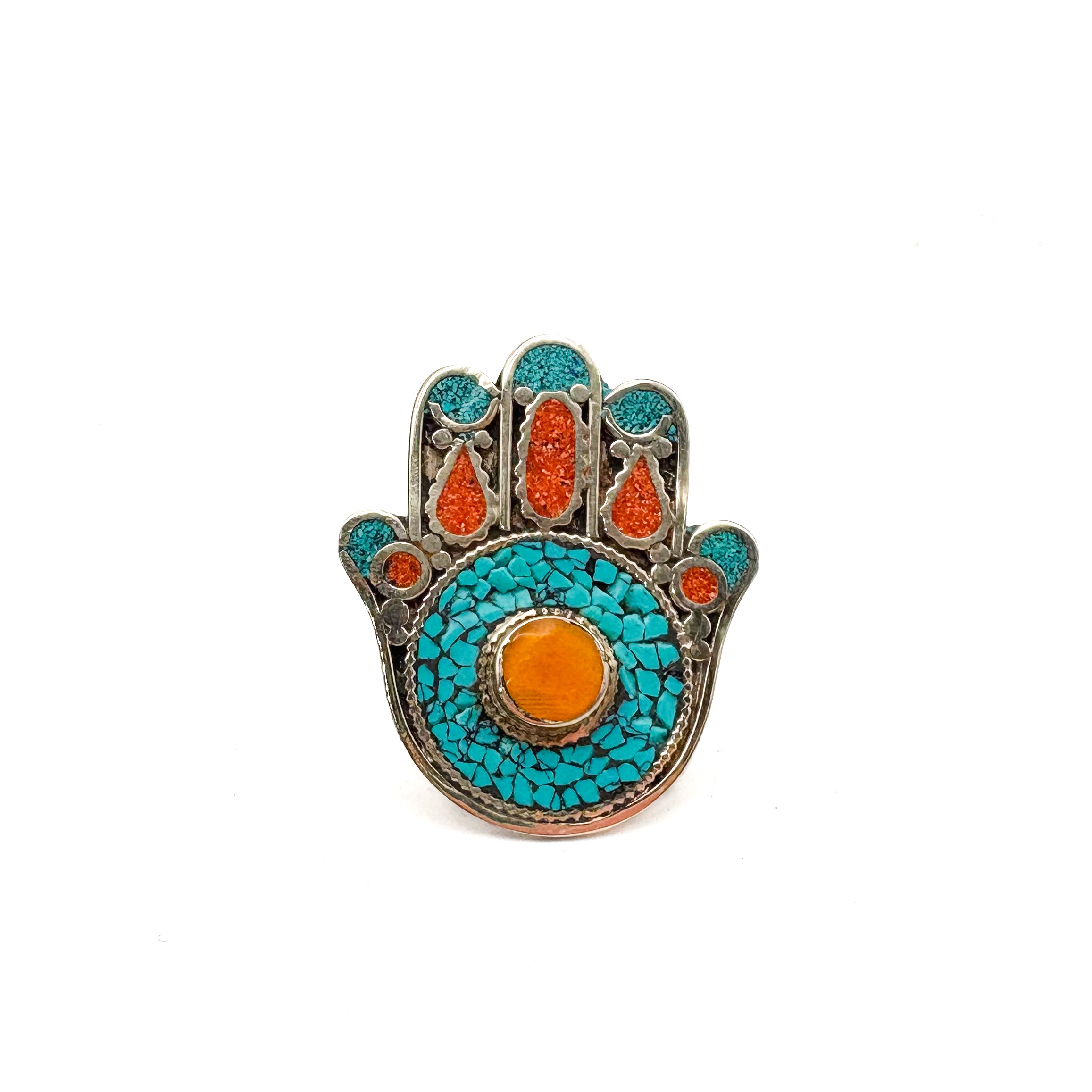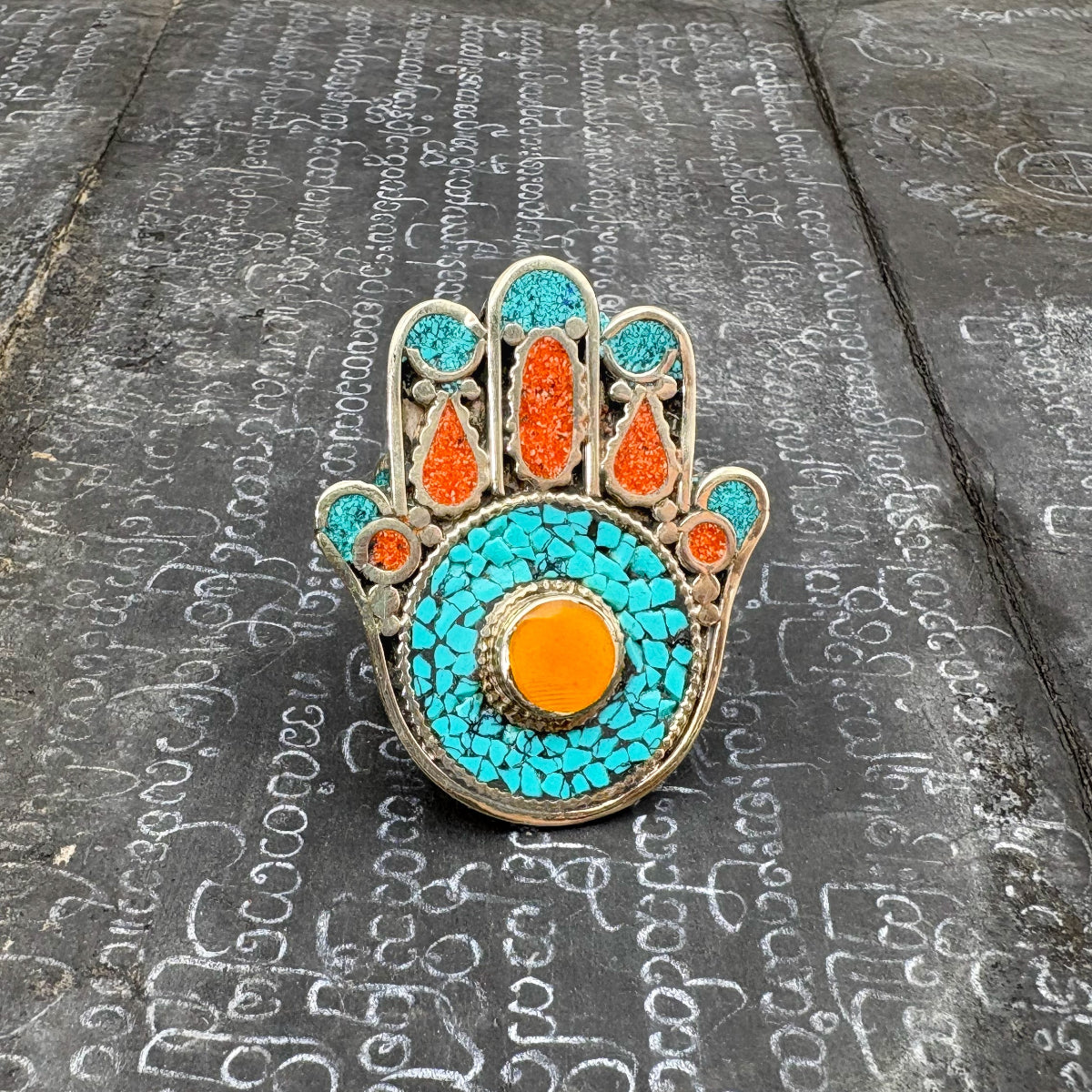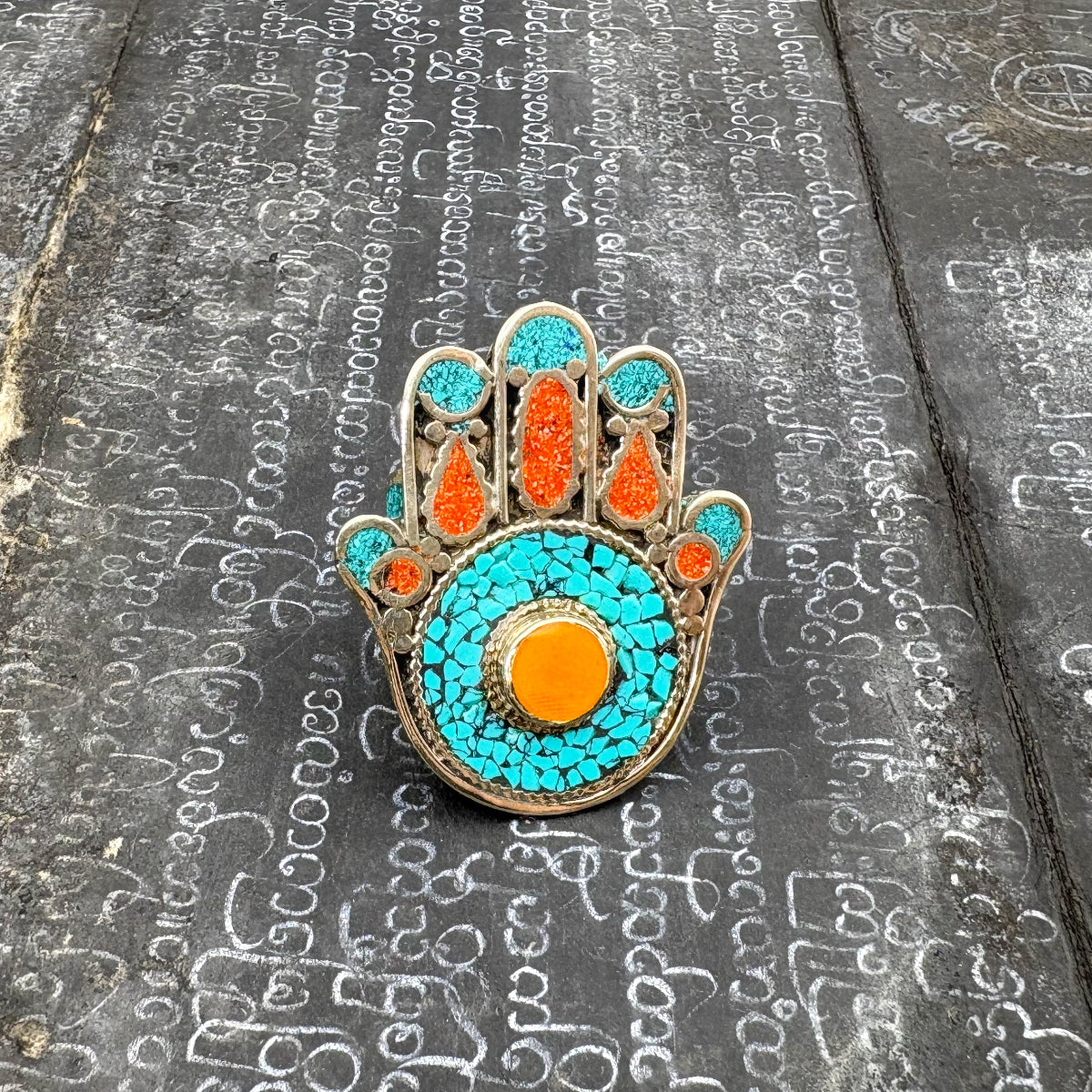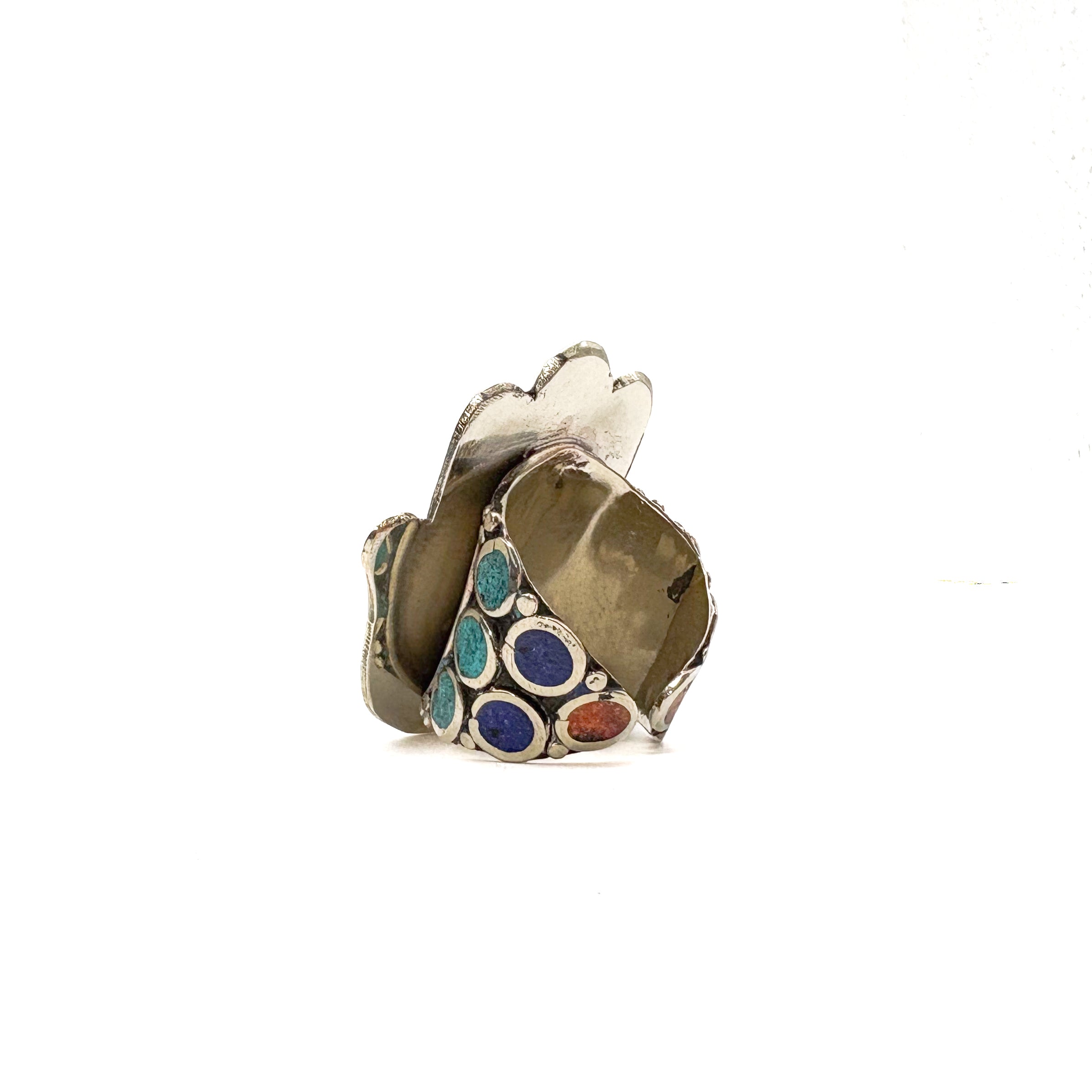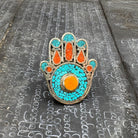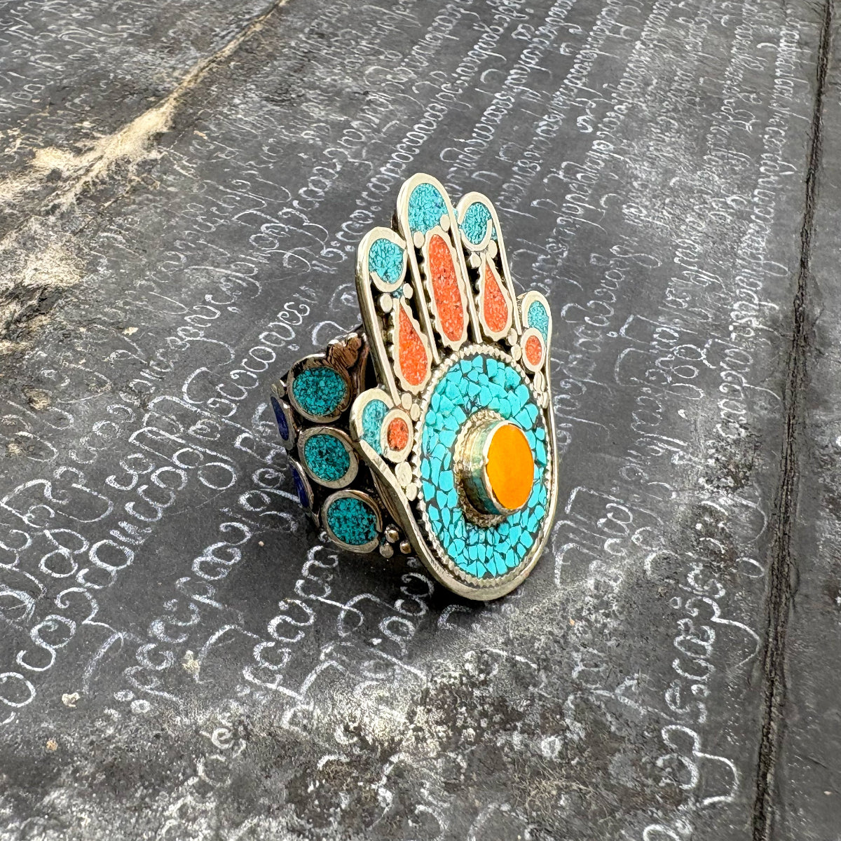 Hamsa Inlaid White Brass Adjustable Ring (D)