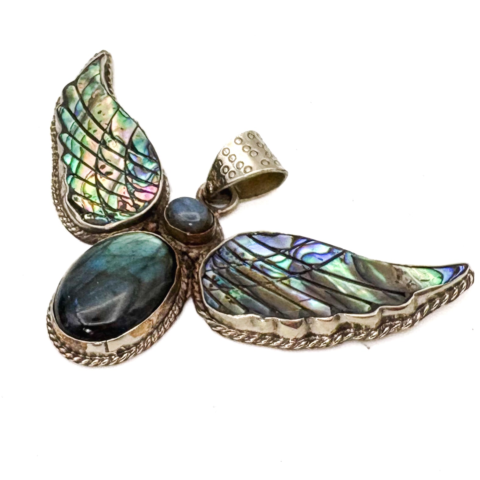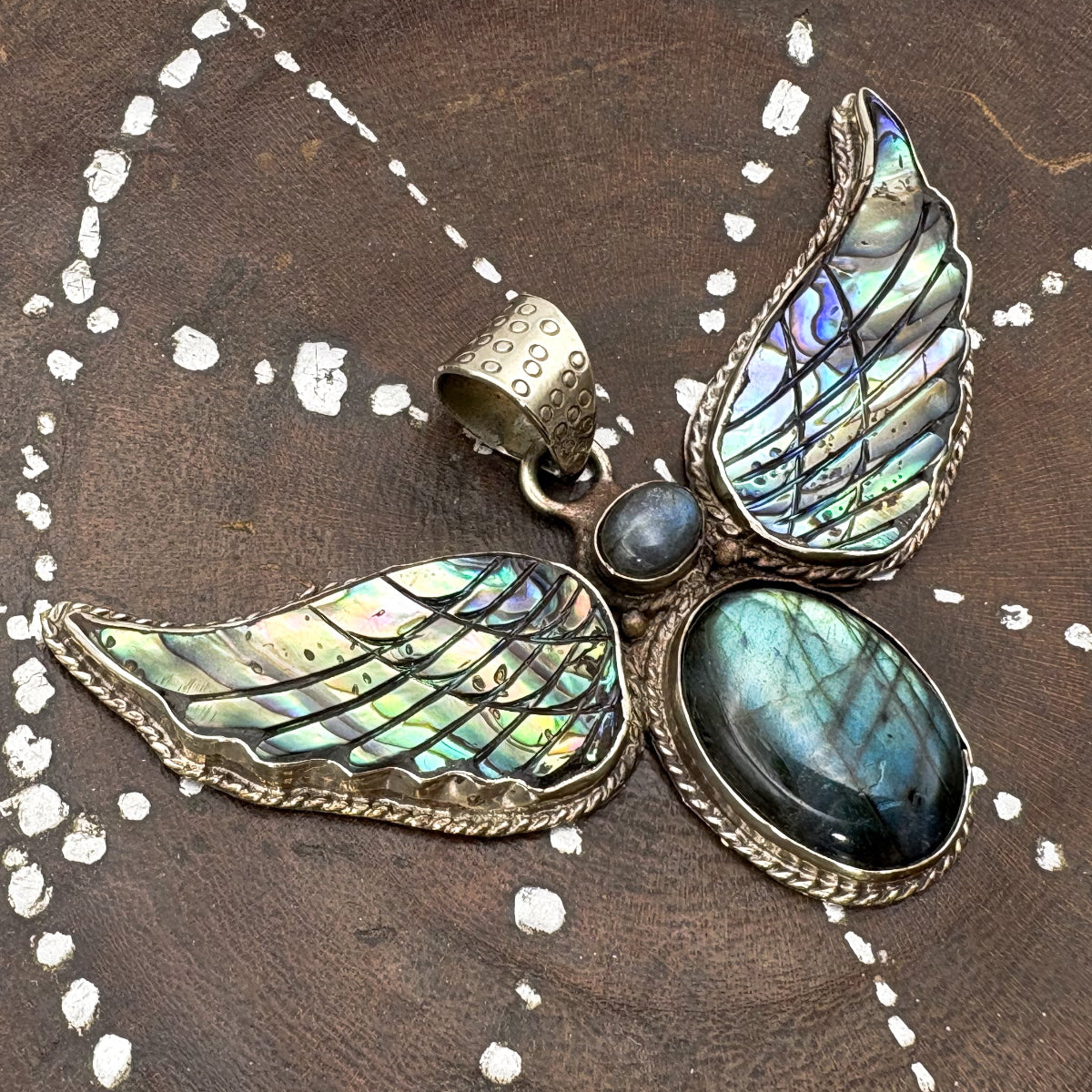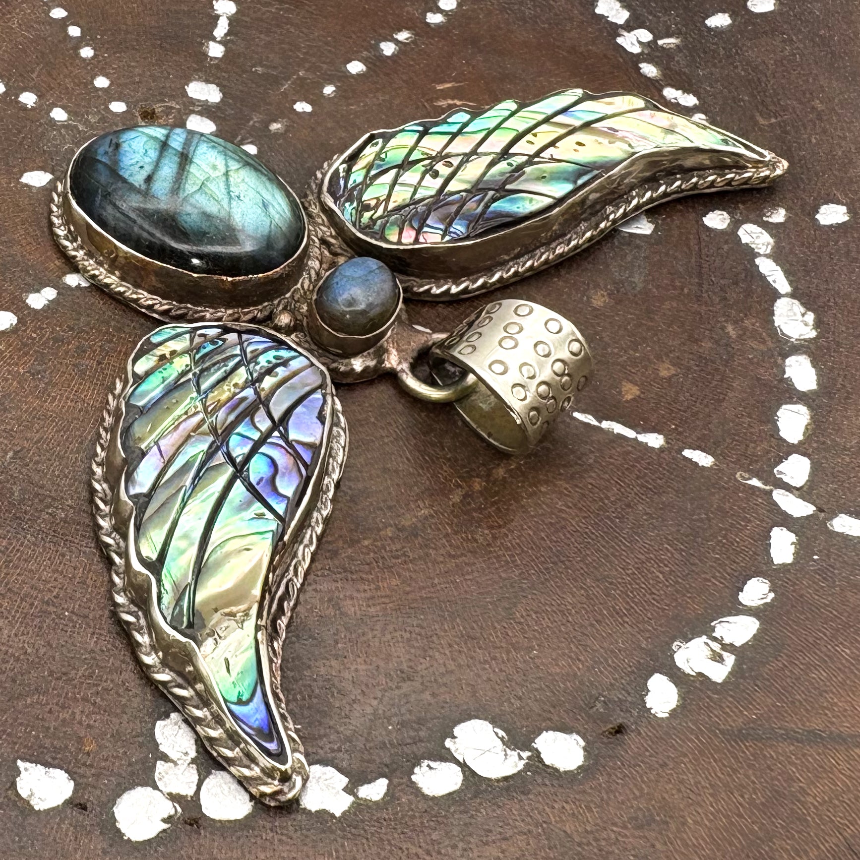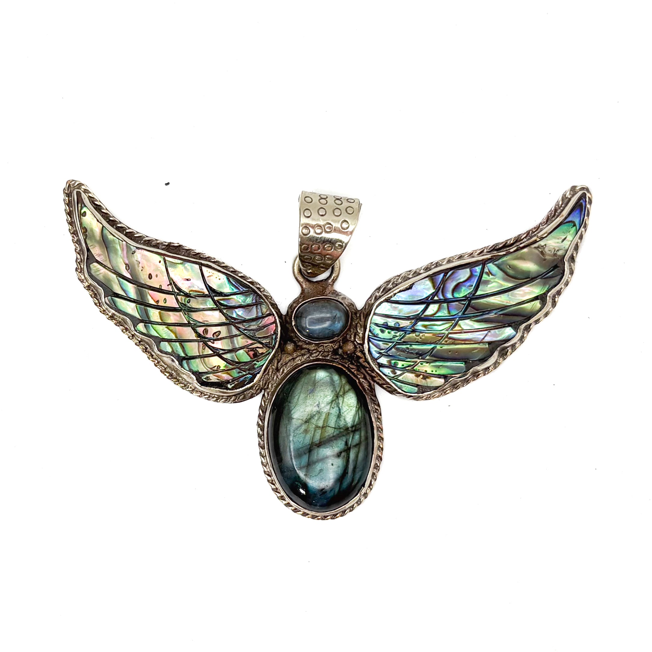 Labradorite and Abalone Brass Winged Pendant Amulet