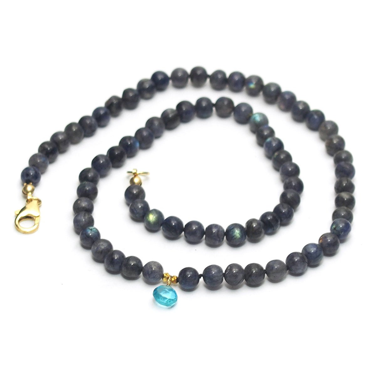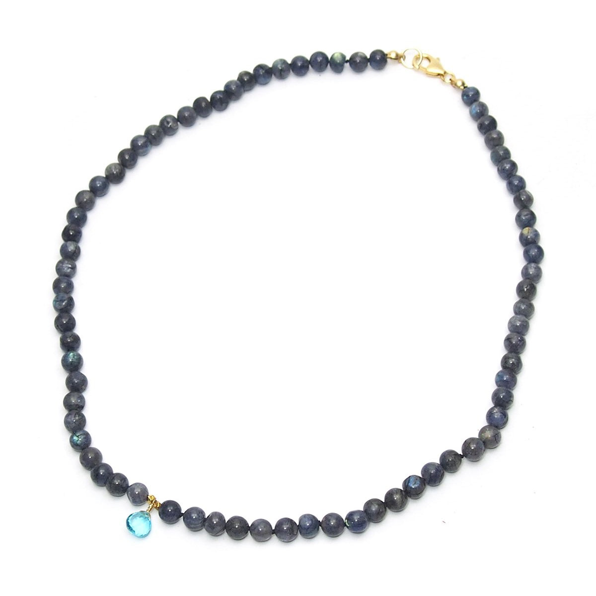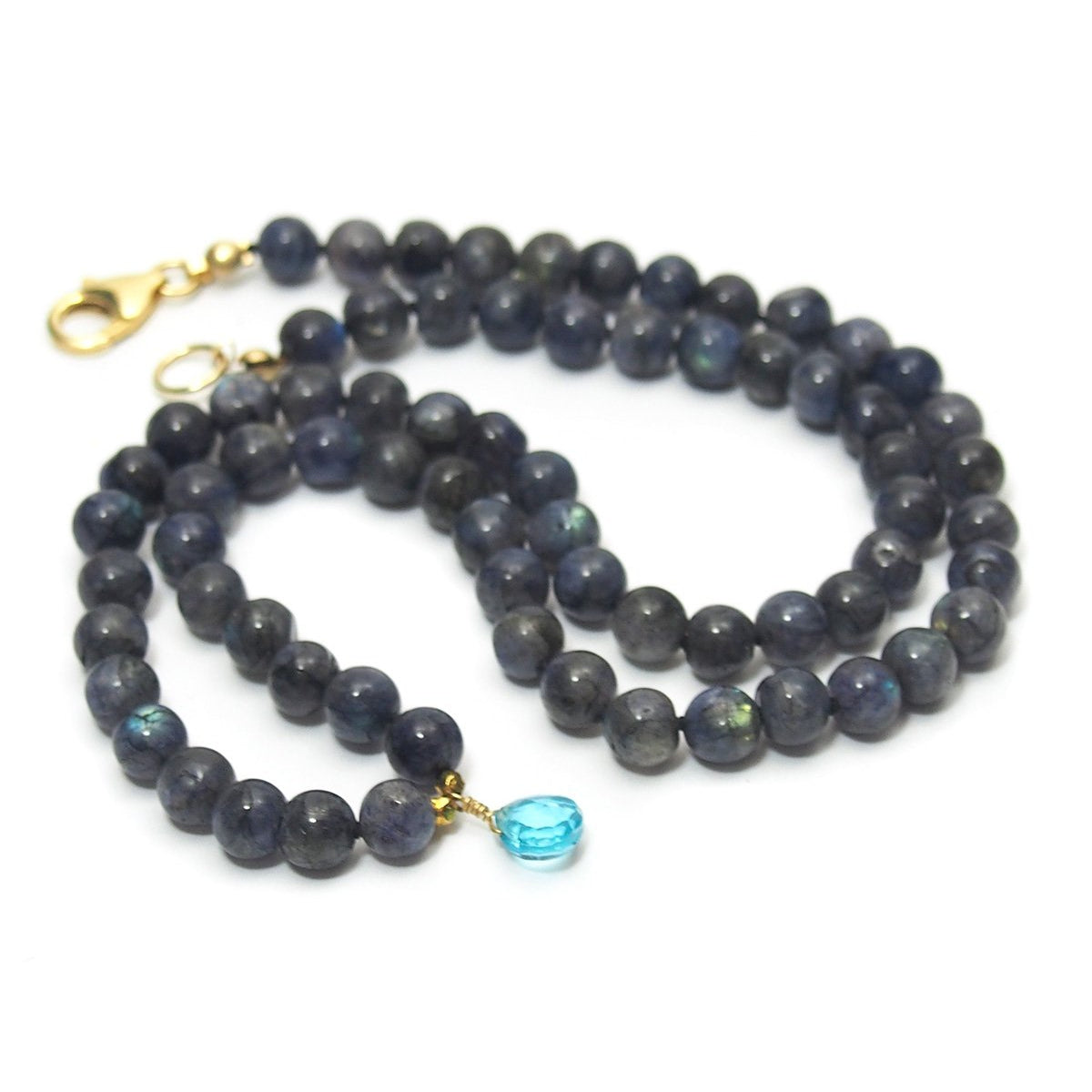 Labradorite Knotted Necklace and Blue Topaz Drop with Gold Filled Trigger Clasp
