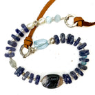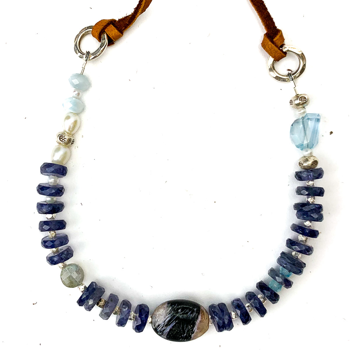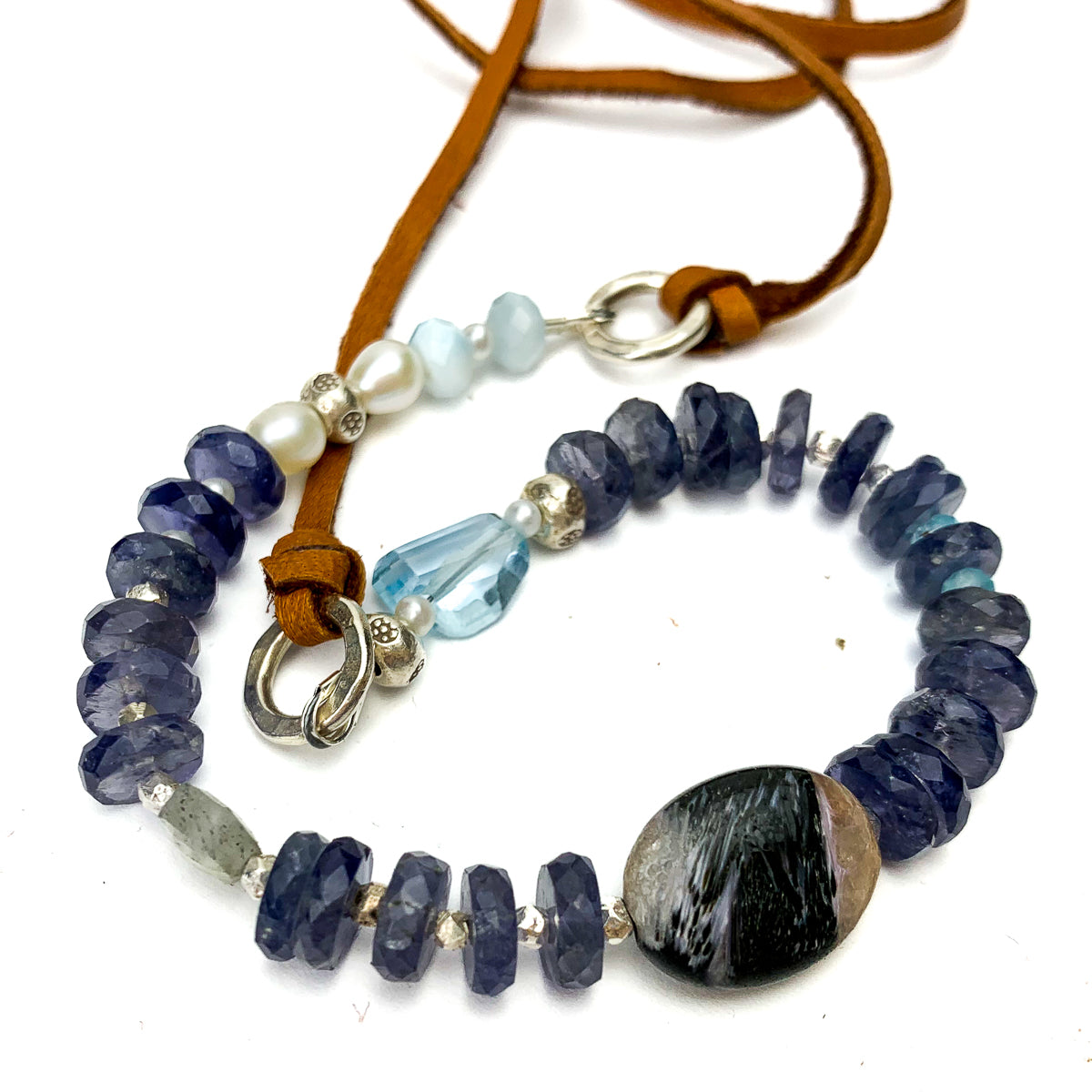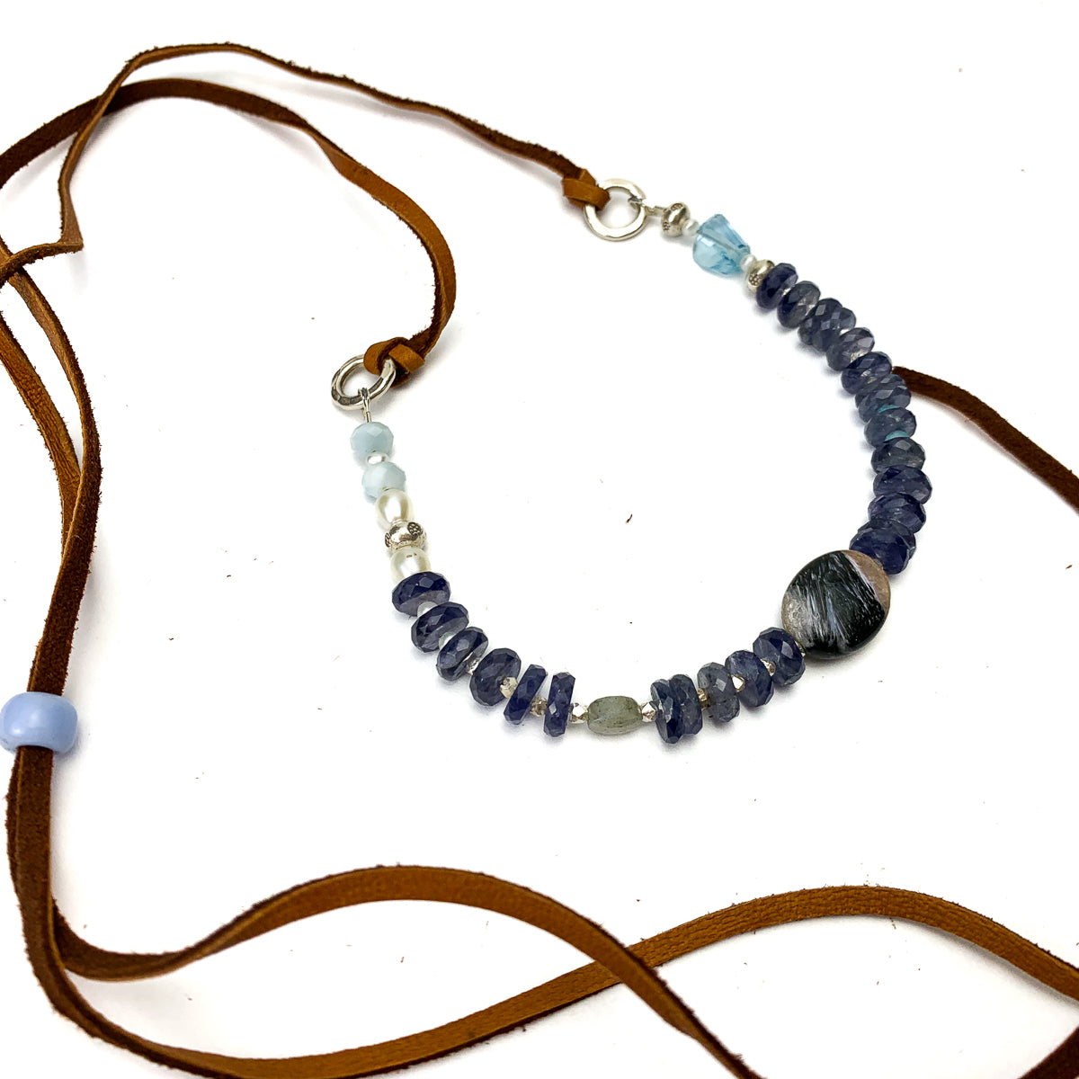 - One of a kind handmade necklace with a mix of gemstone and metal beads including Iolite, Charoite, Aquamaine, Larimar, Freshwater Pearls, Thai silver, Sterling Silver beads strung on softflex wire, and attached by Sterling Silver rings to a brown deerskin leather cord, with a vintage glass bead slider to adjust the length.