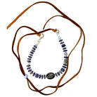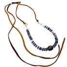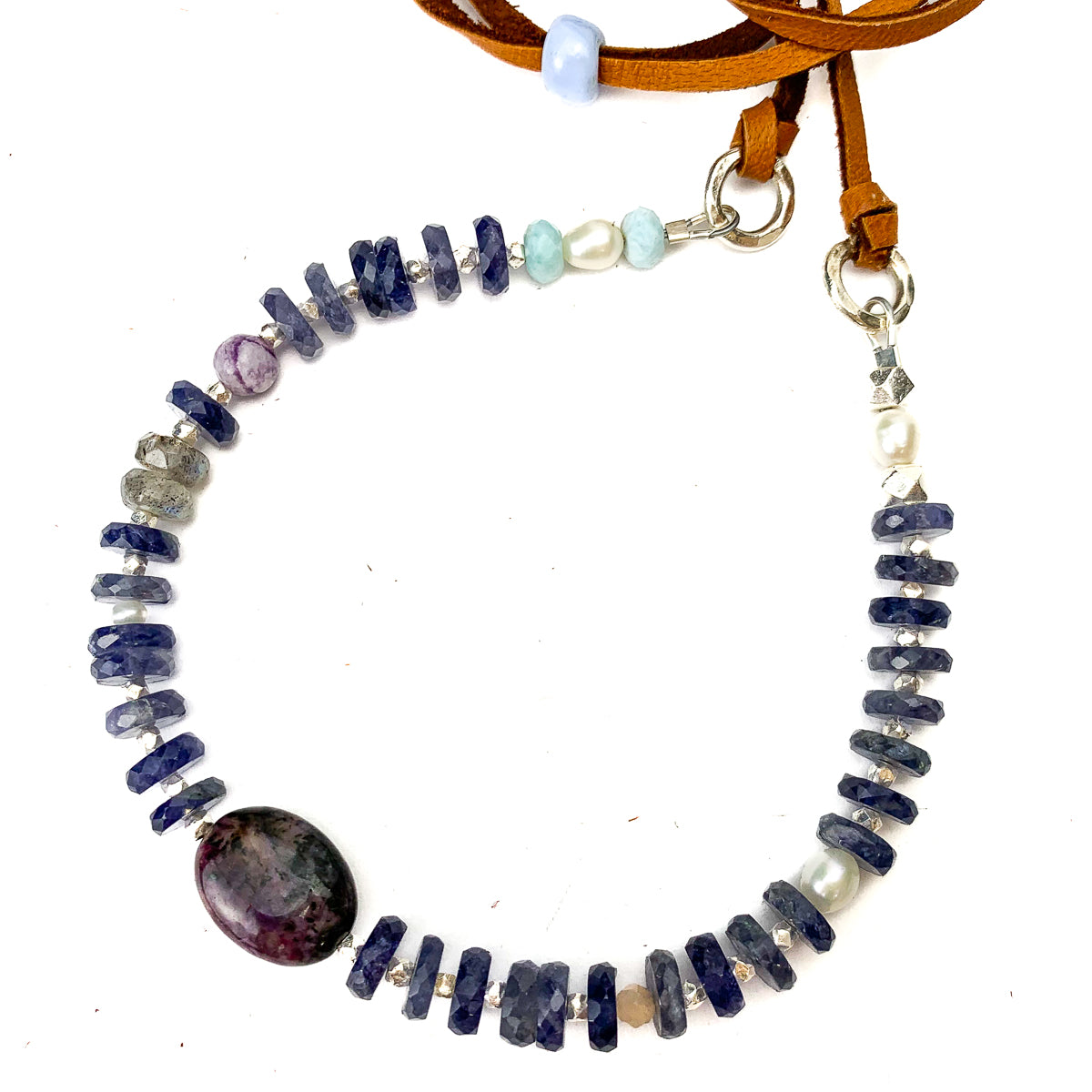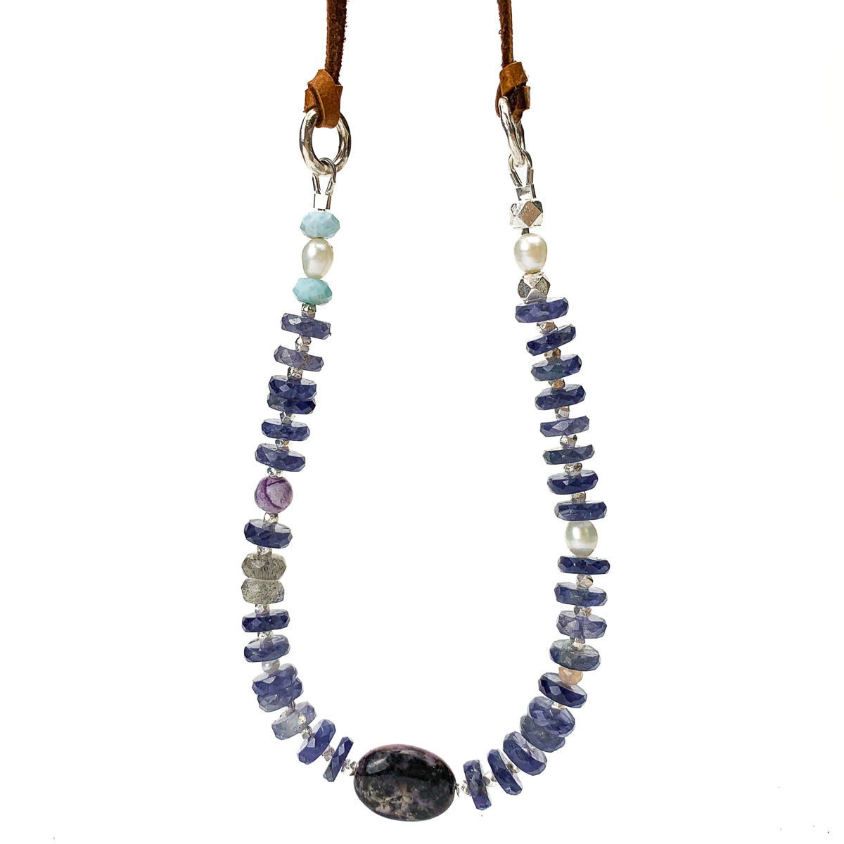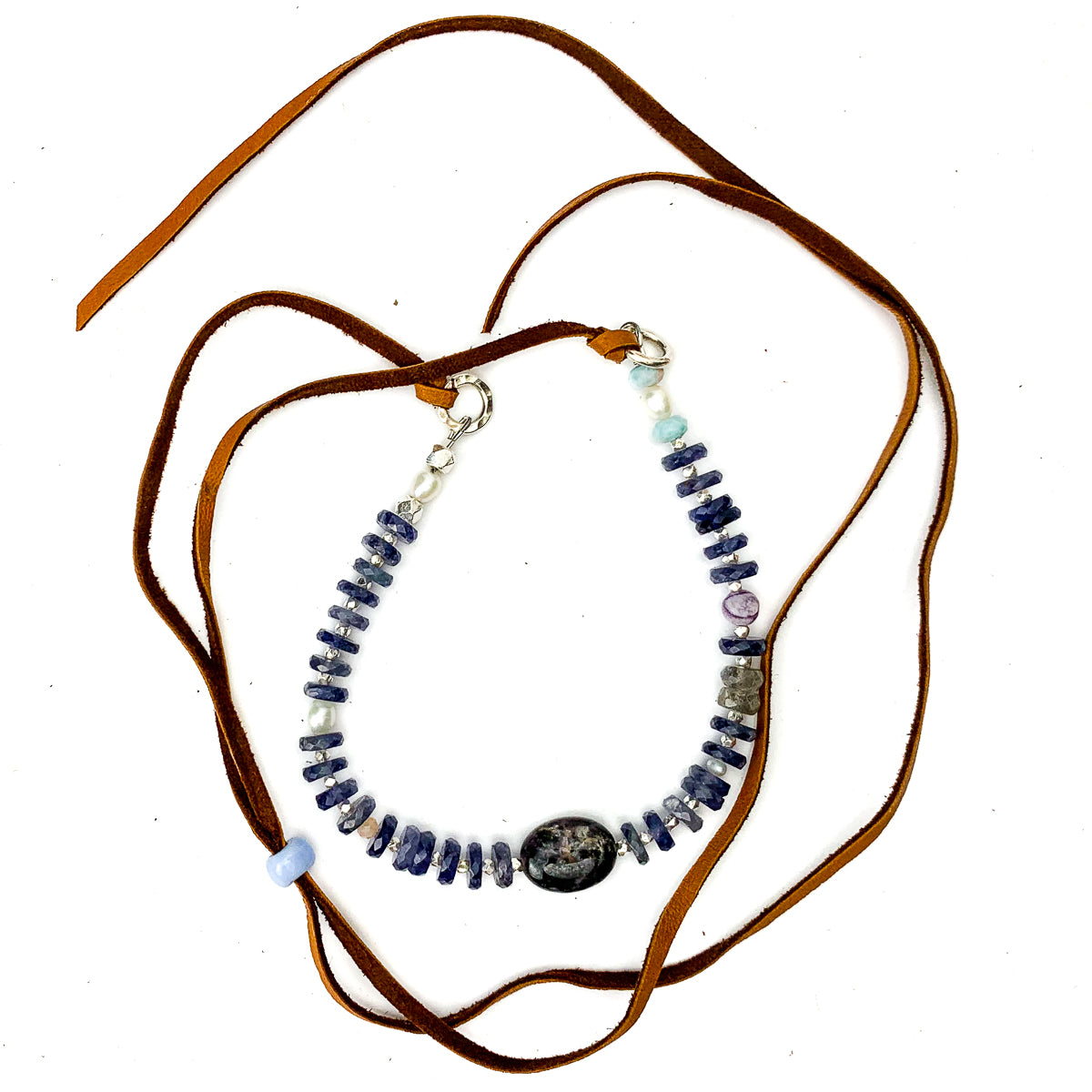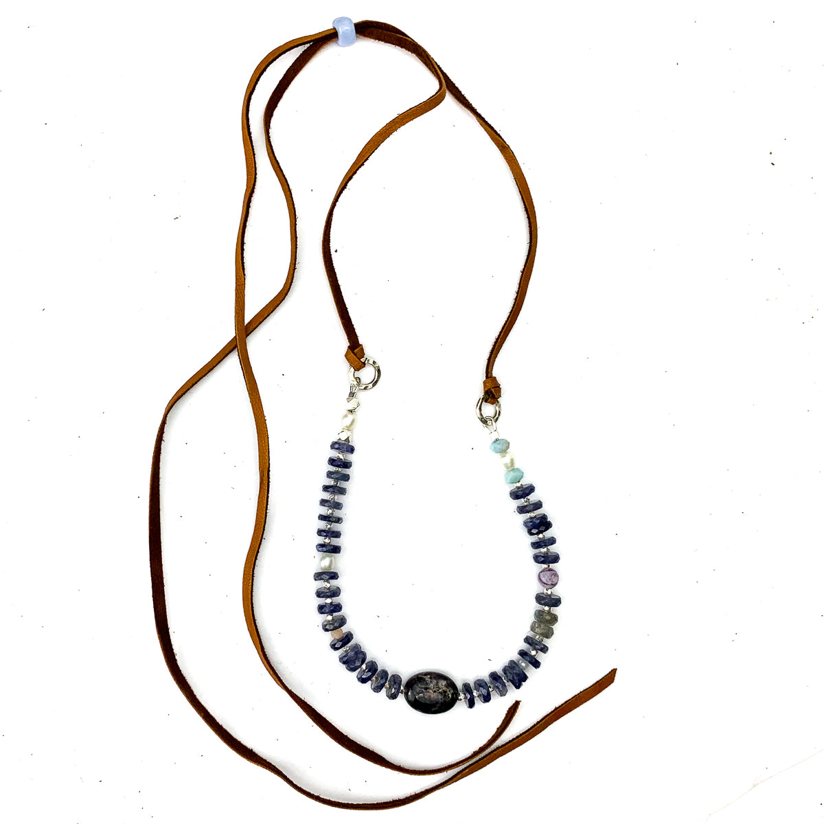 - One of a kind handmade necklace with a mix of gemstone and metal beads including Iolite, Charoite, Purple Flower Jasper, Larimar, Labradorite, Freshwater Pearl, Sterling Silver beads strung on softflex wire, and attached by Sterling Silver rings to a brown deerskin leather cord, with a vintage glass bead slider to adjust the length.